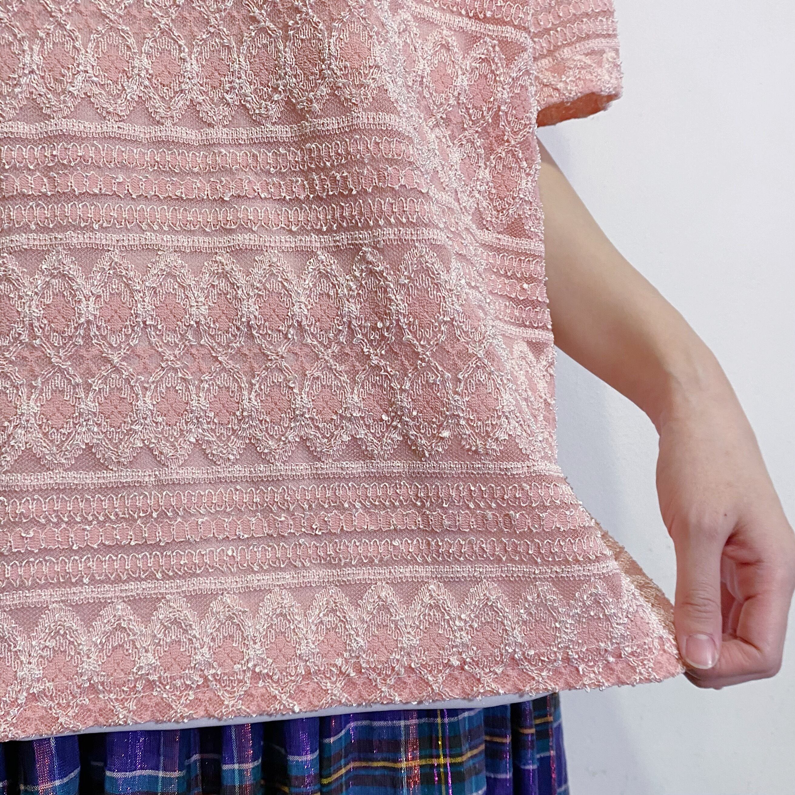 ベビーピンクカラーに刺繍のような織りがかわいい、90年代のトップスです。