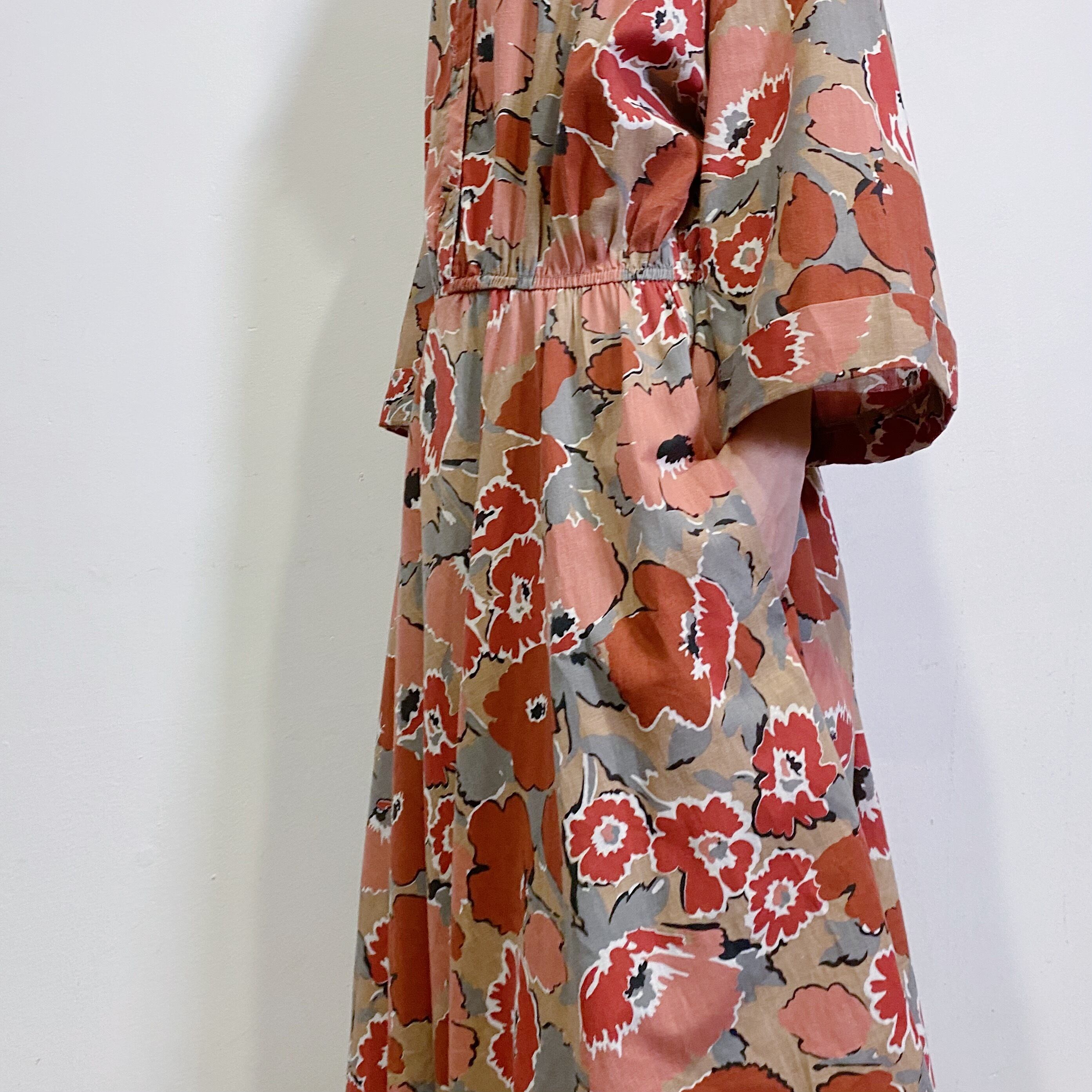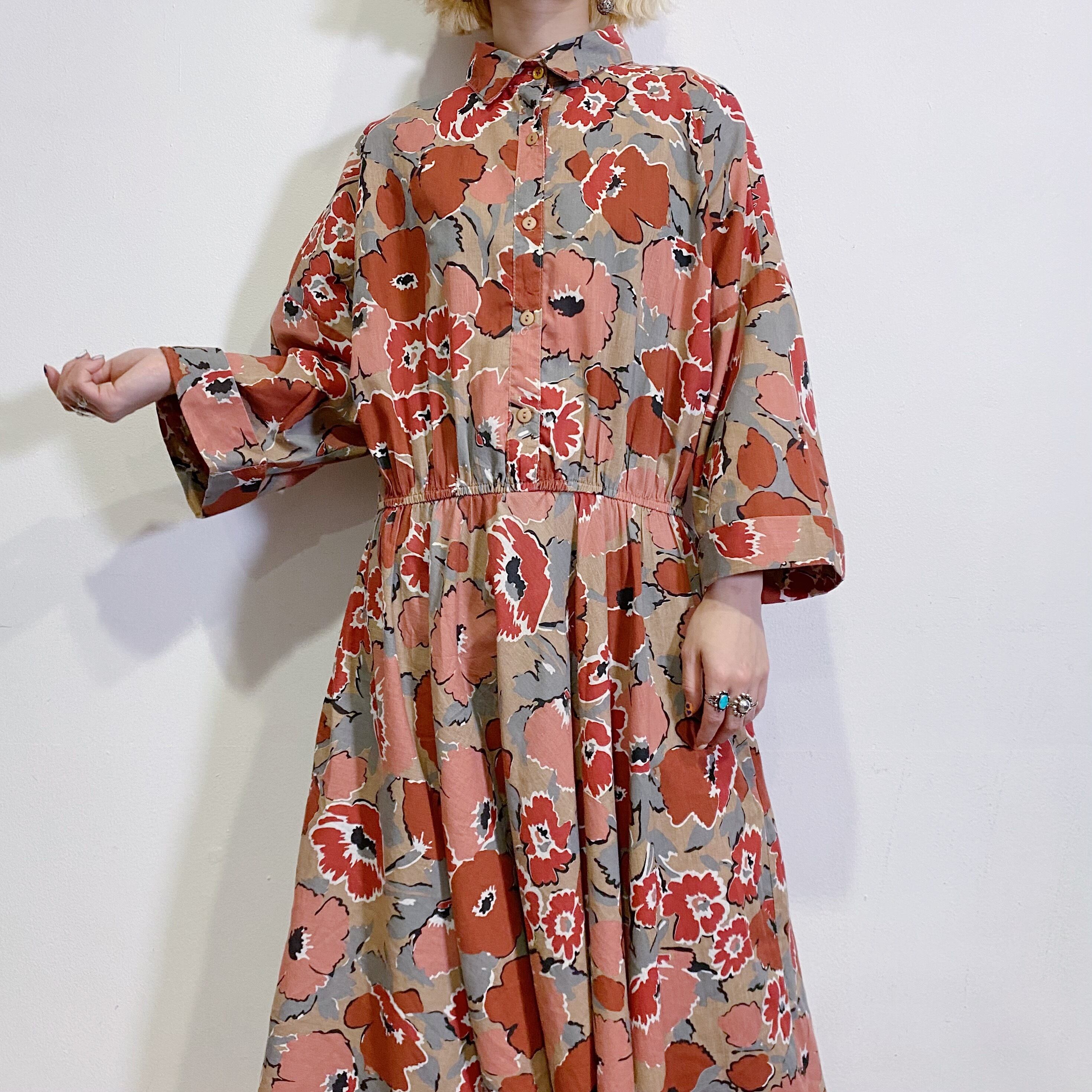 落ち着いた色合いの花柄が大人可愛い、80年代のシャツワンピースです。