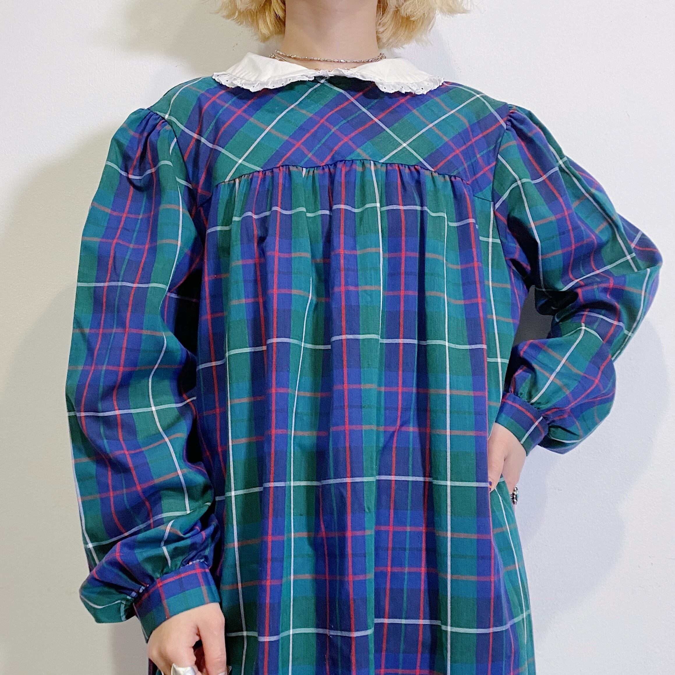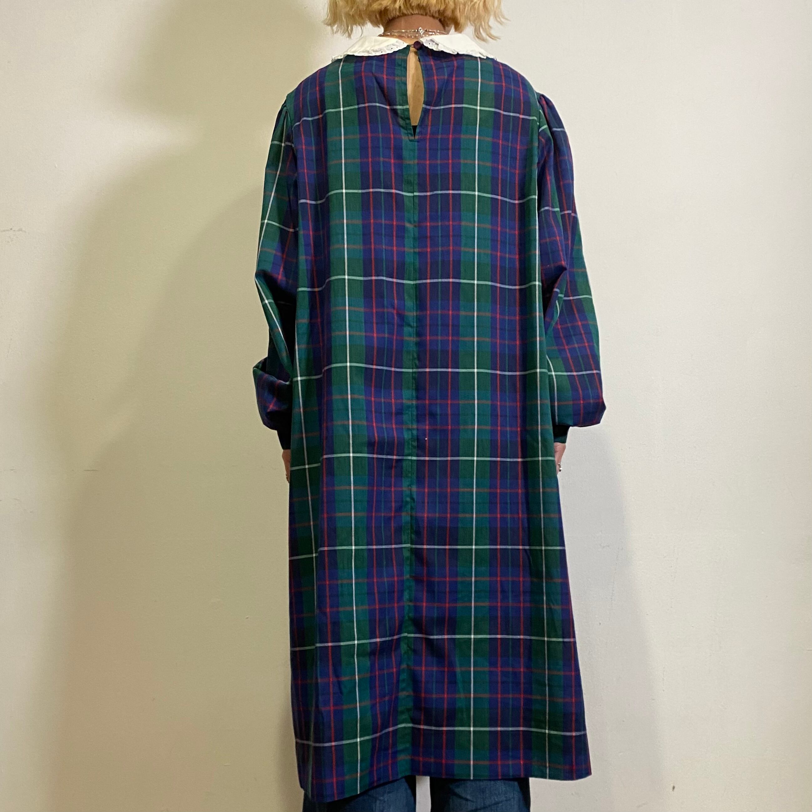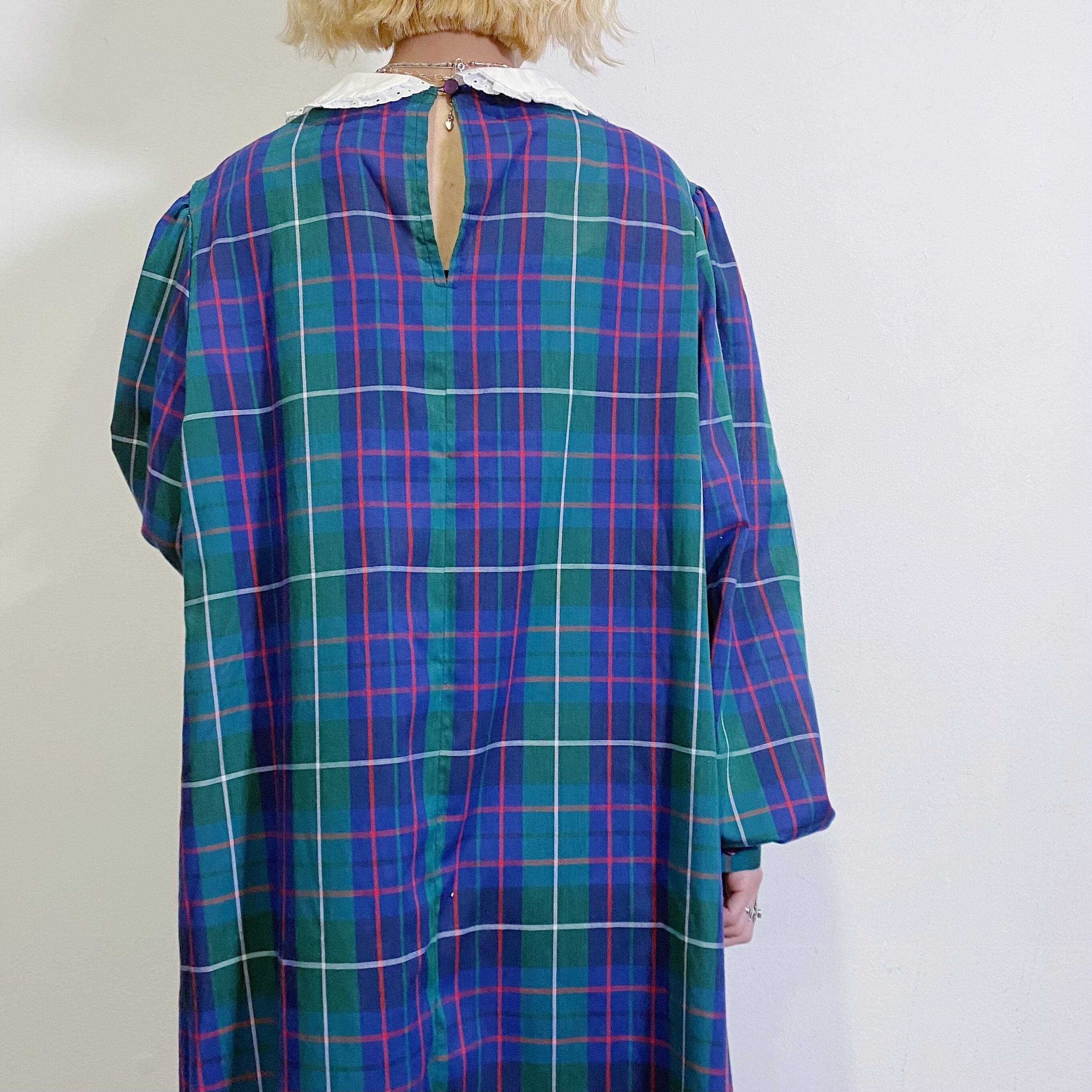 グリーンとネイビーのチェックの色合いが可愛い、70年代頃のワンピースです。