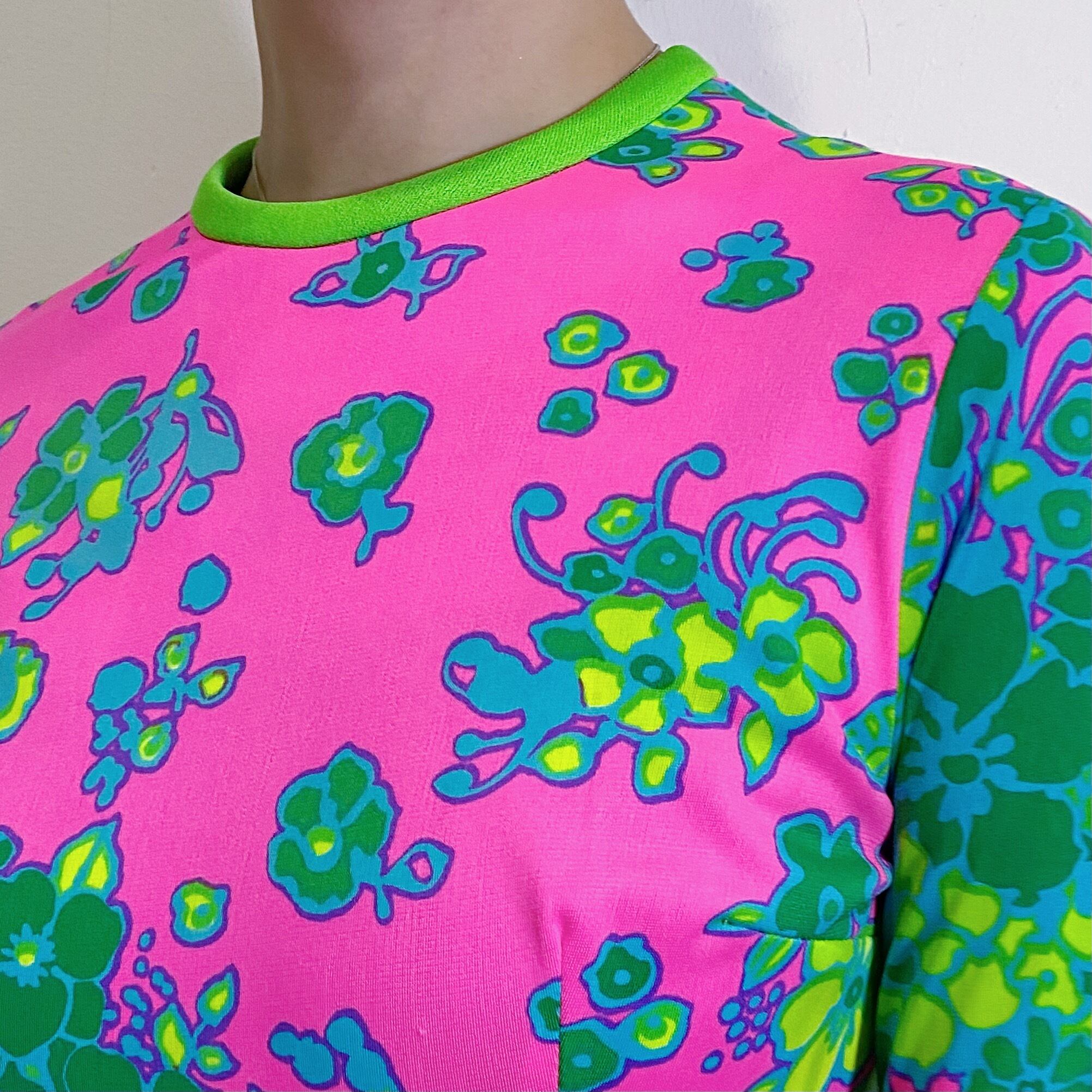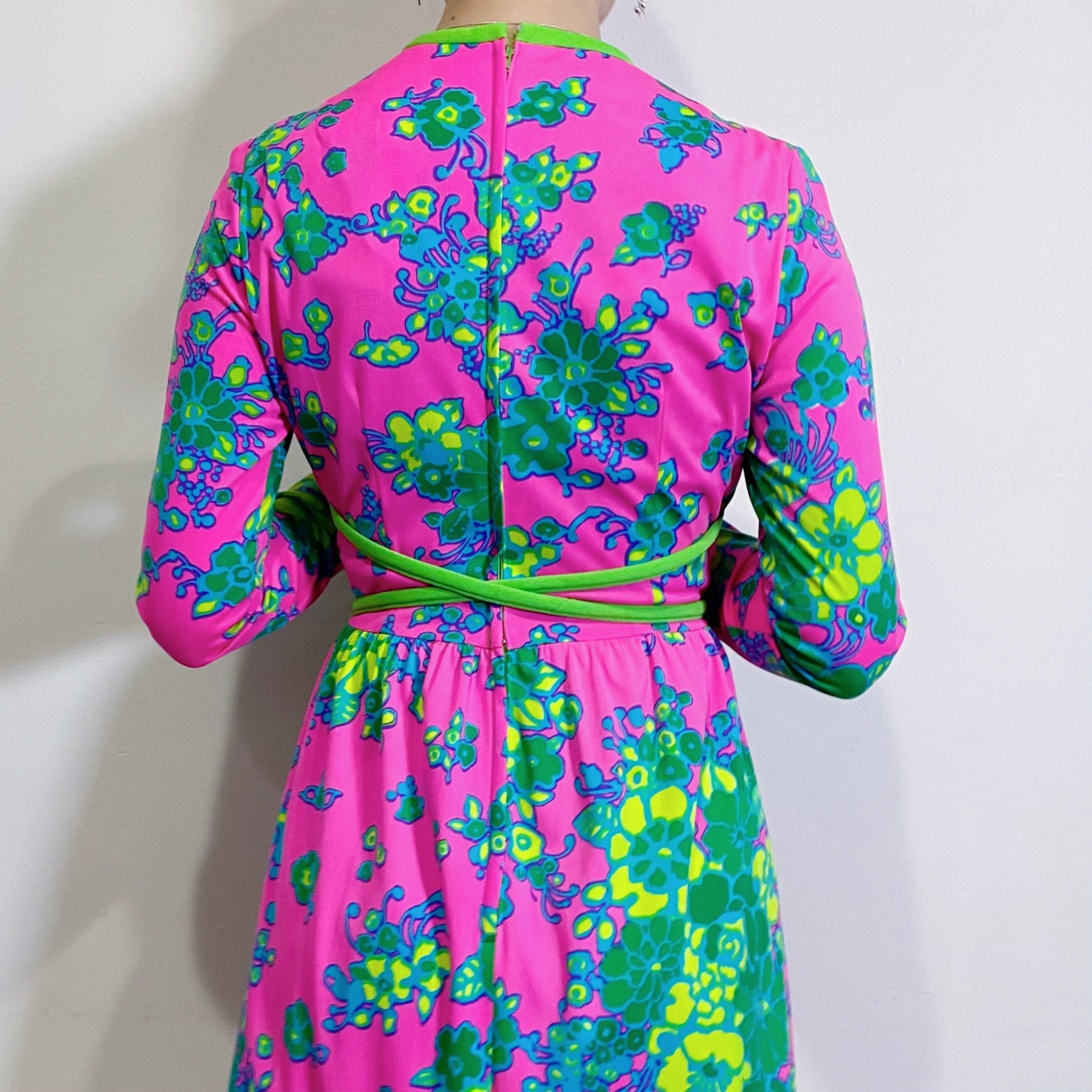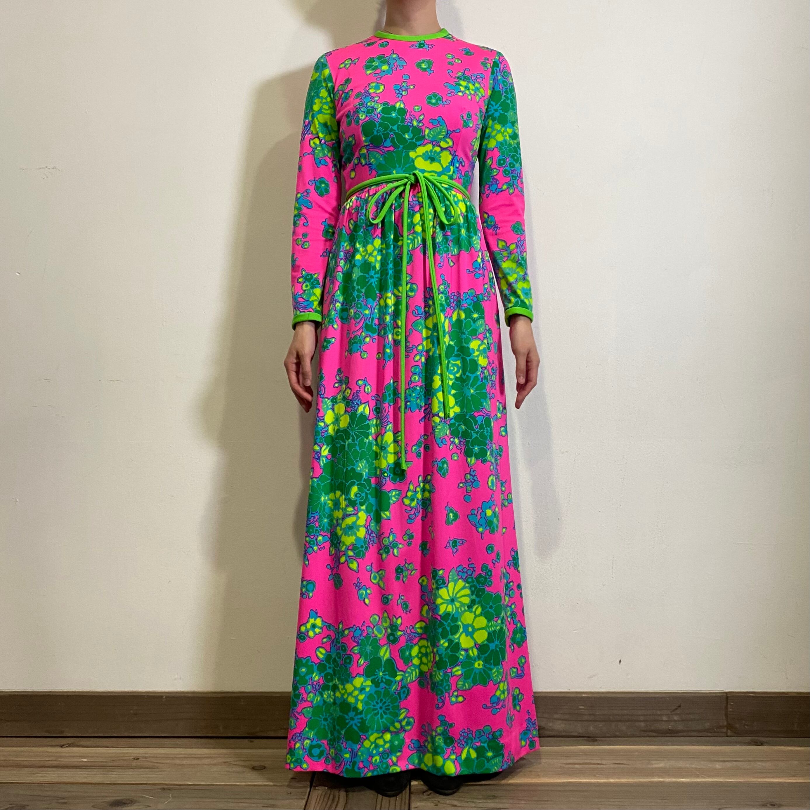ぱっきりとしたピンクとグリーンのお色が可愛い、70年代の花柄ワンピースです。