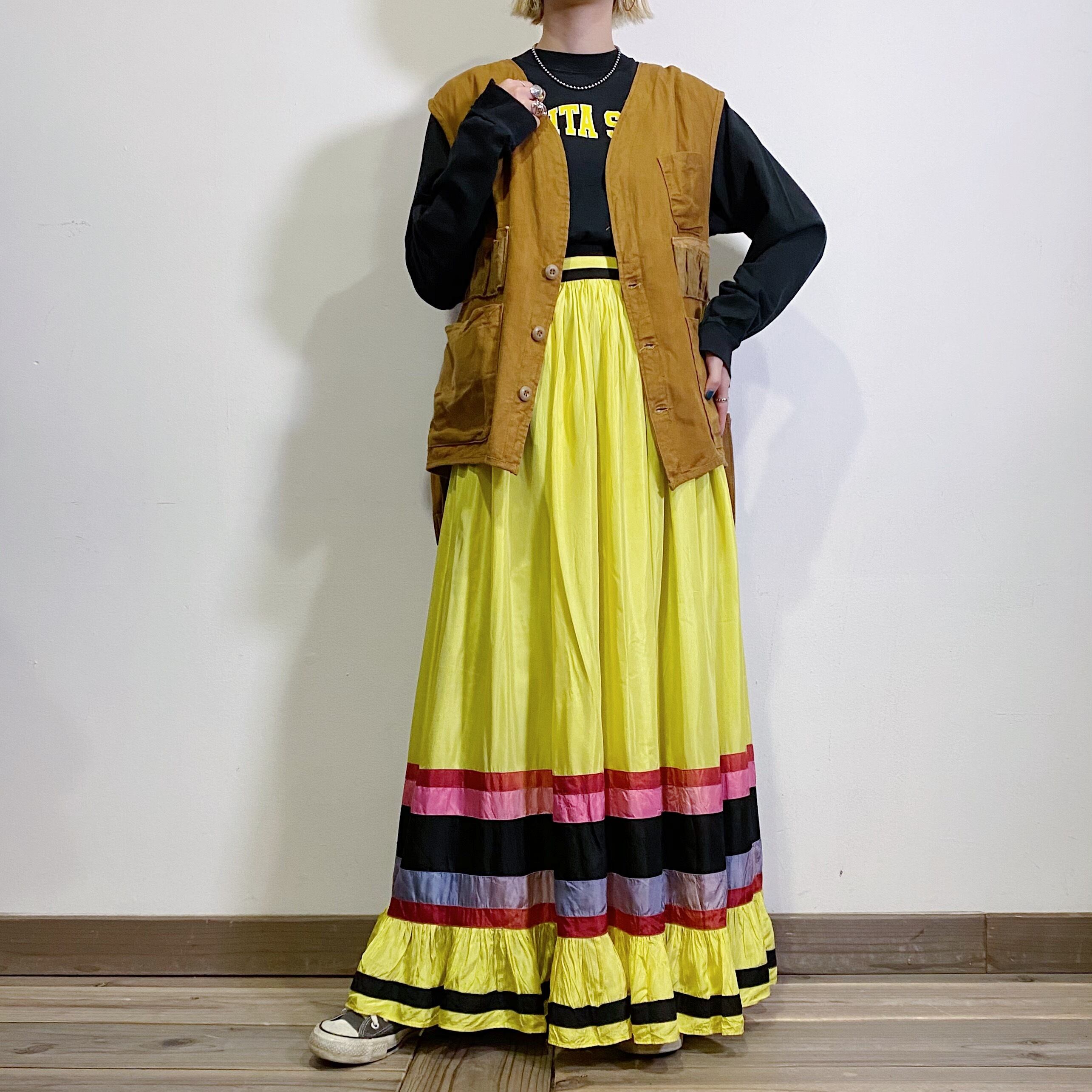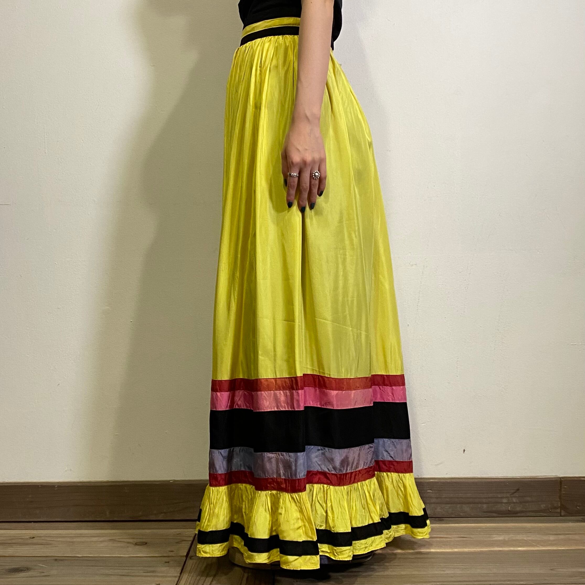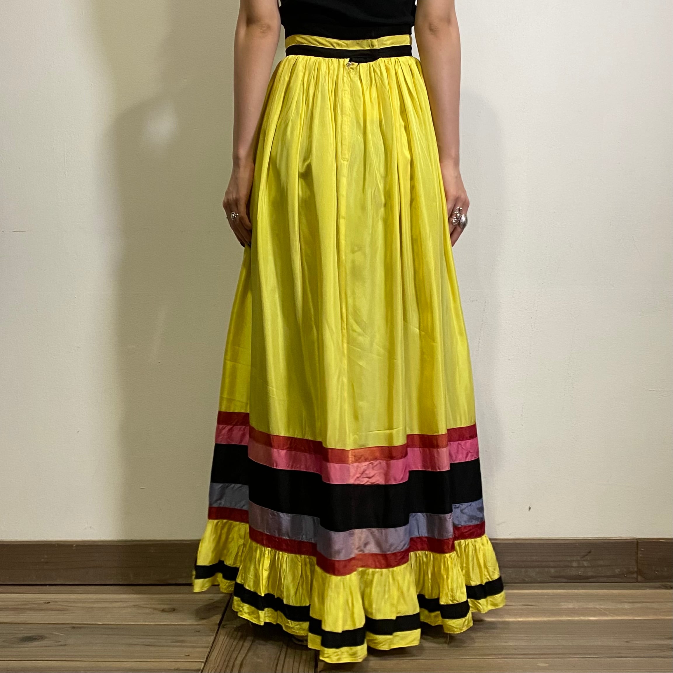 鮮やかなイエローカラーに裾のカラフルな切り替えやフリルがかわいい、60年代のロングスカートです。