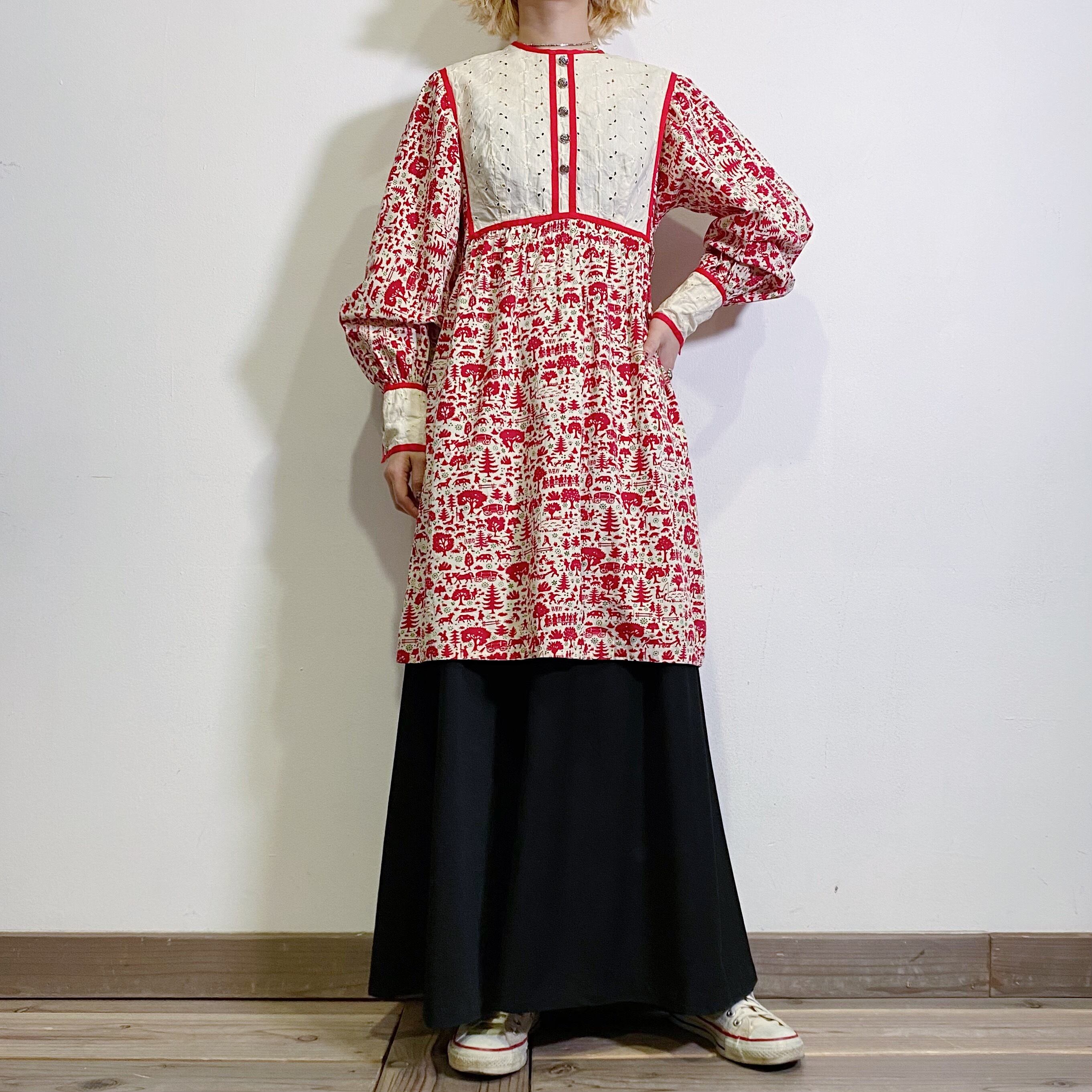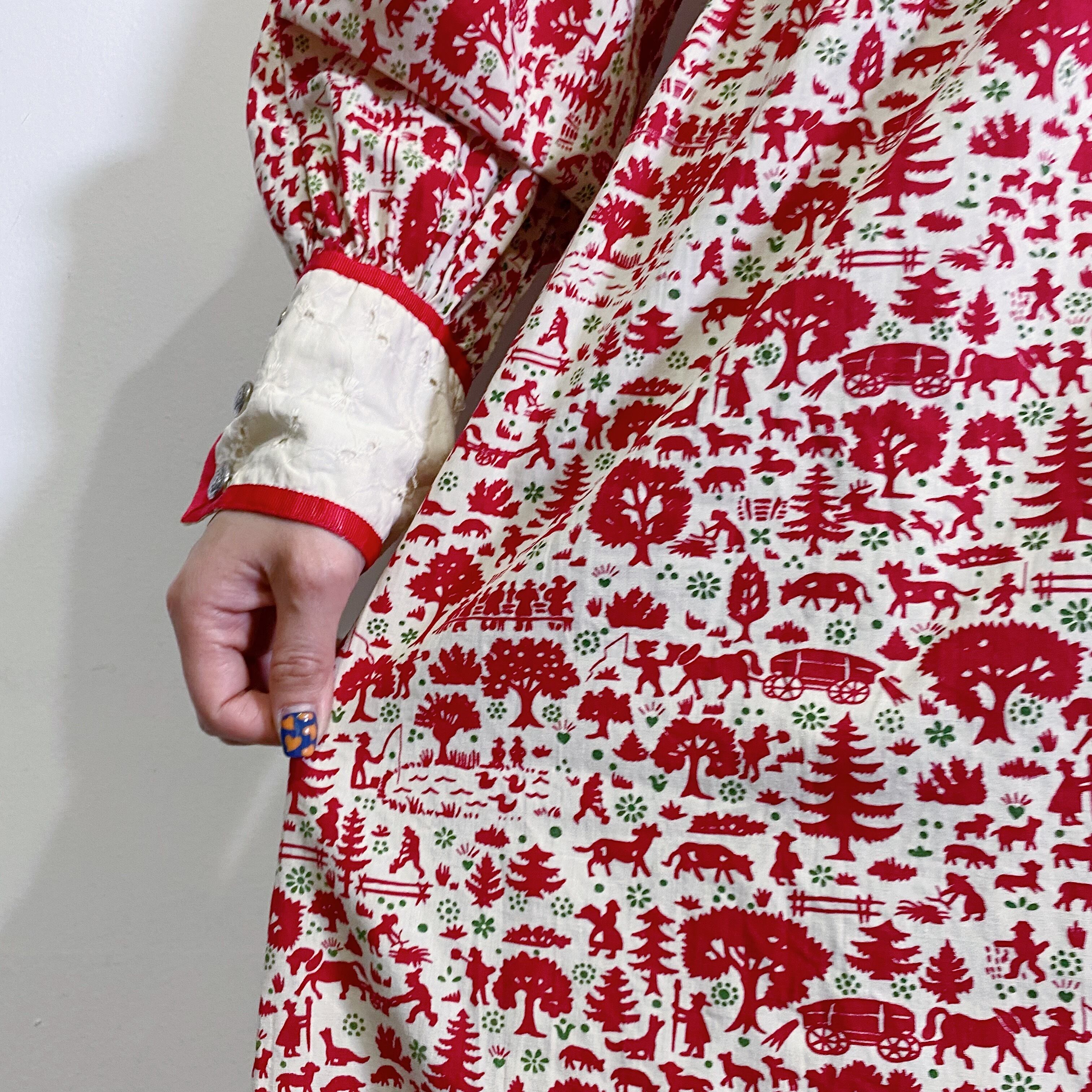木々や動物たち、いろんな人々が描かれた見ているだけでも楽しい牧場モチーフのワンピースです。