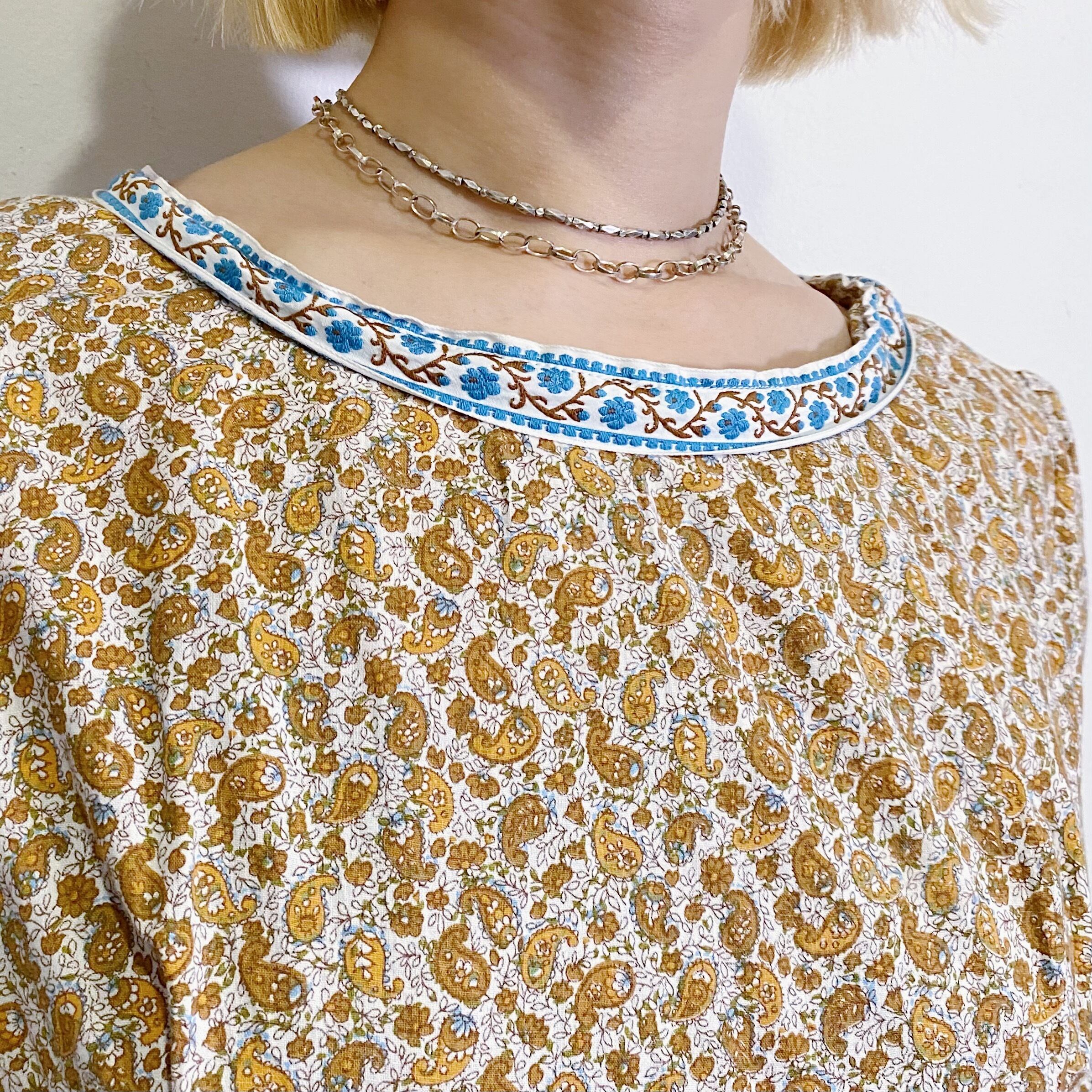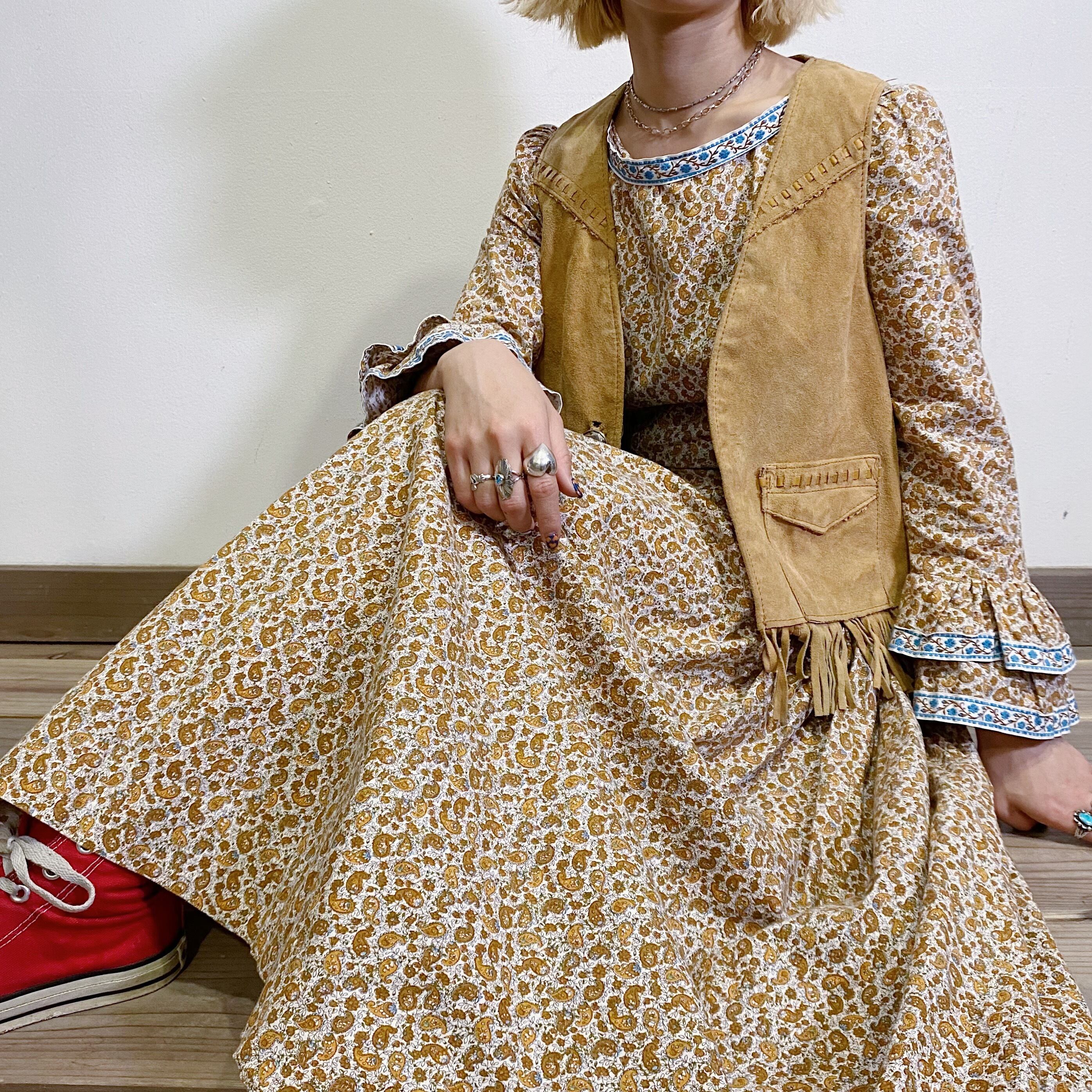 首回りと袖のチロルテープ、そして袖のティアードデザインが可愛い70年代のワンピースです。