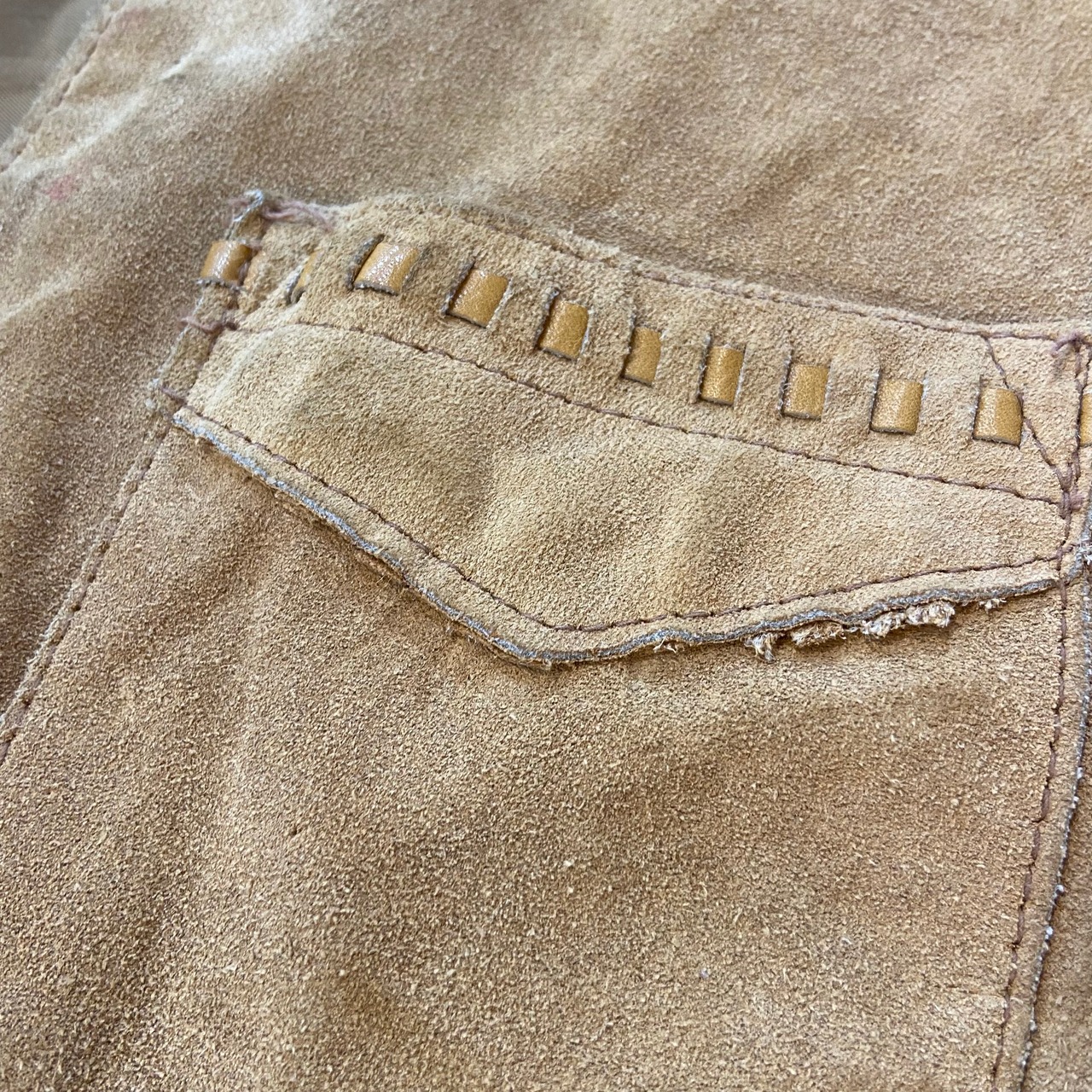 また、恐らく前の所有者がフリンジがあったであろう部分をカットした形跡が見受けられます。