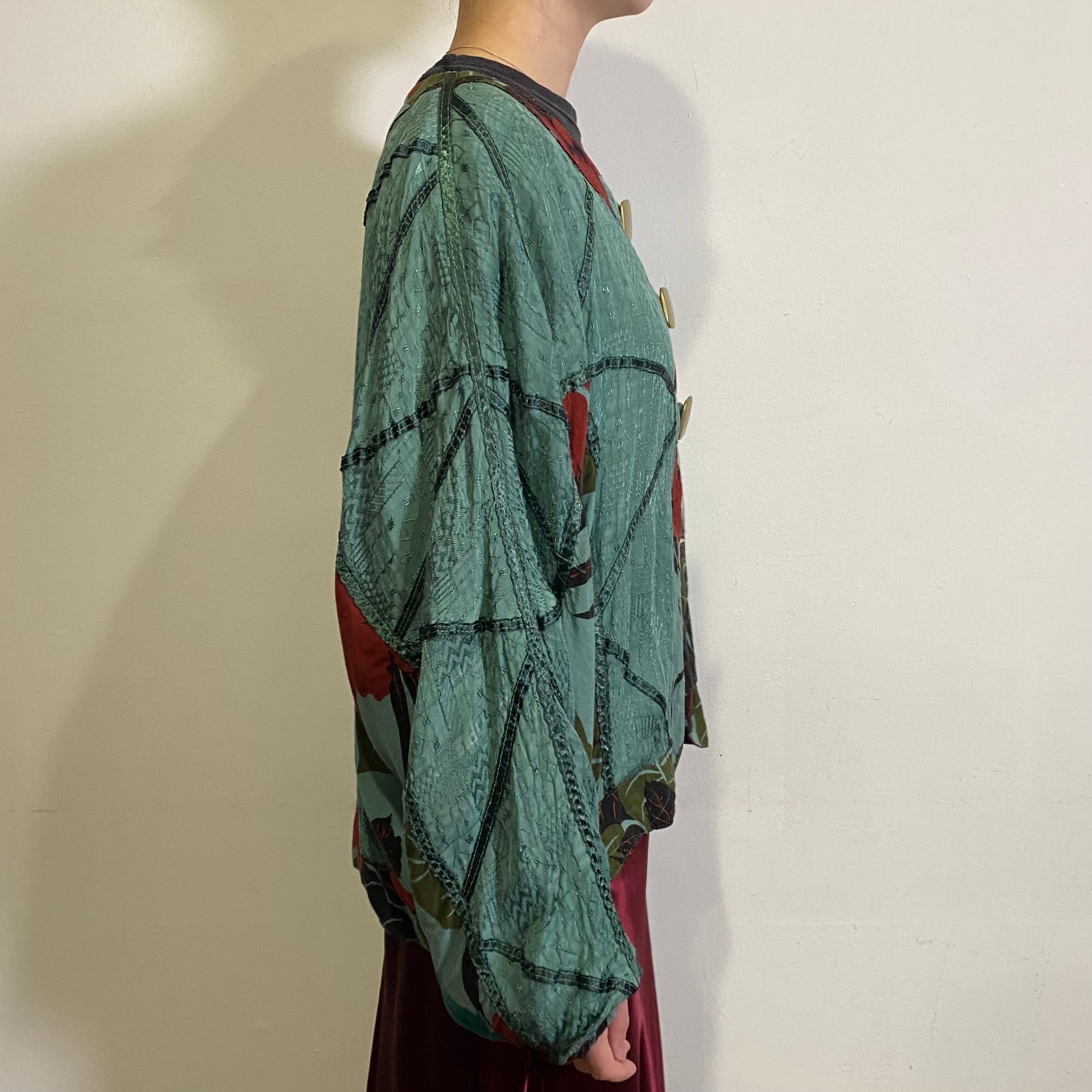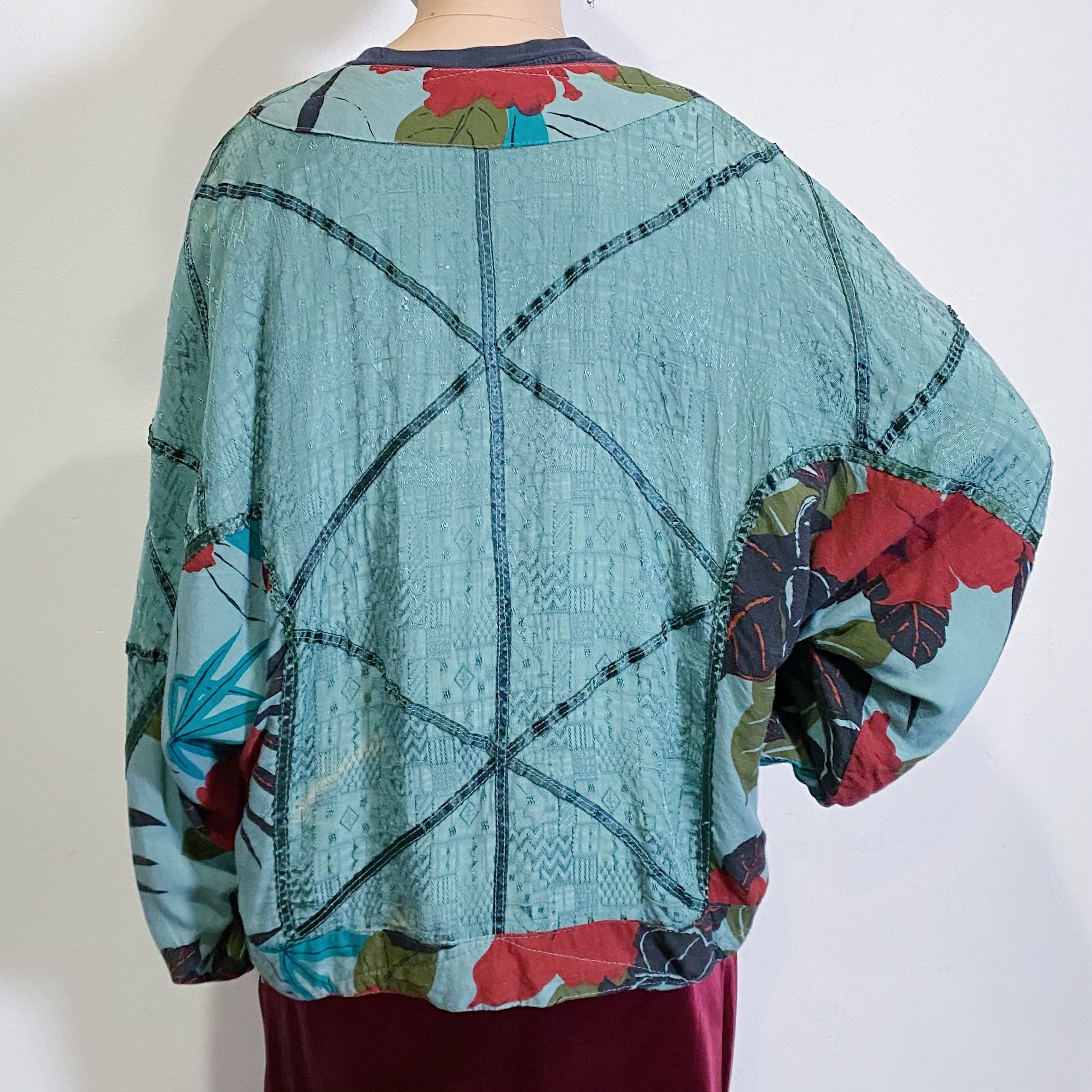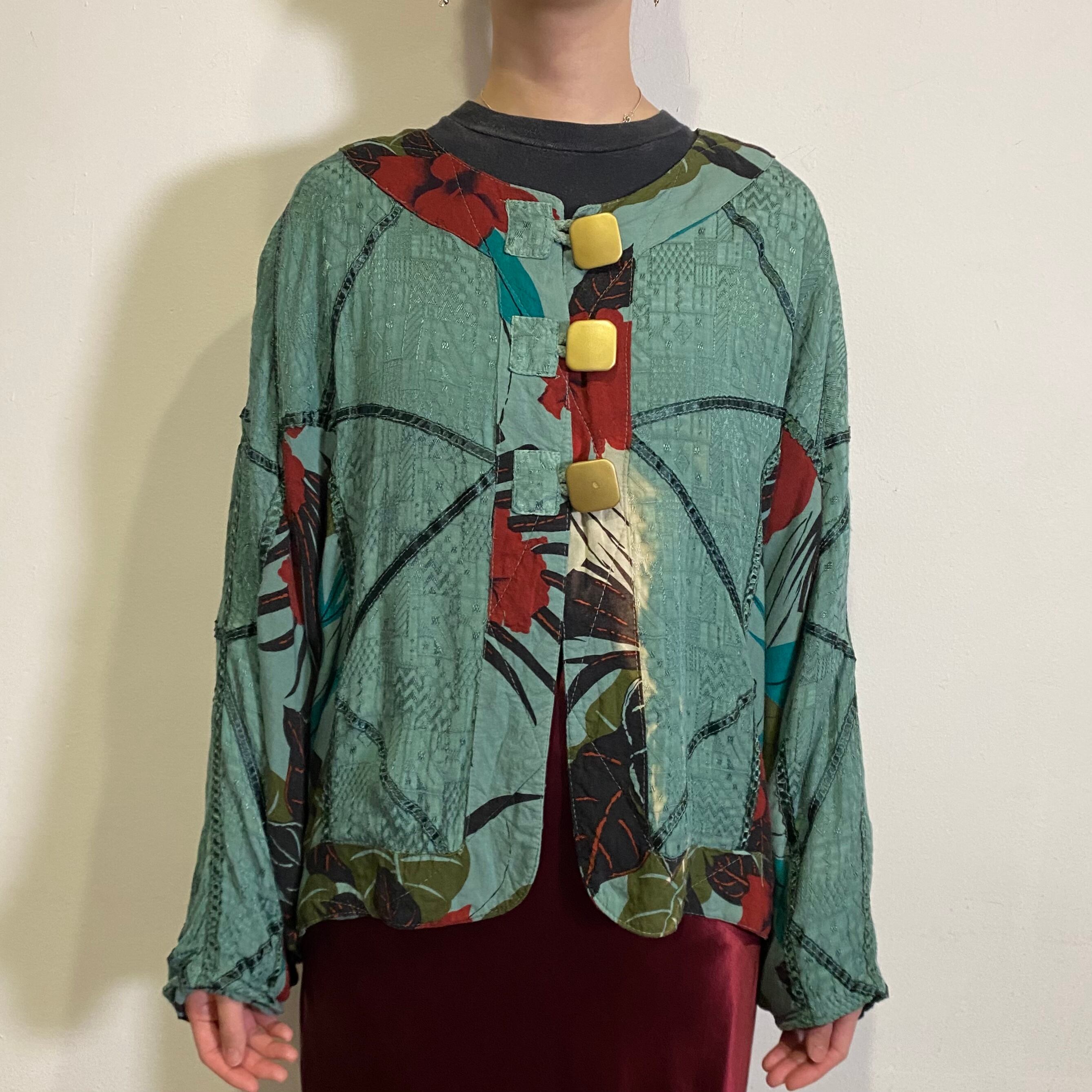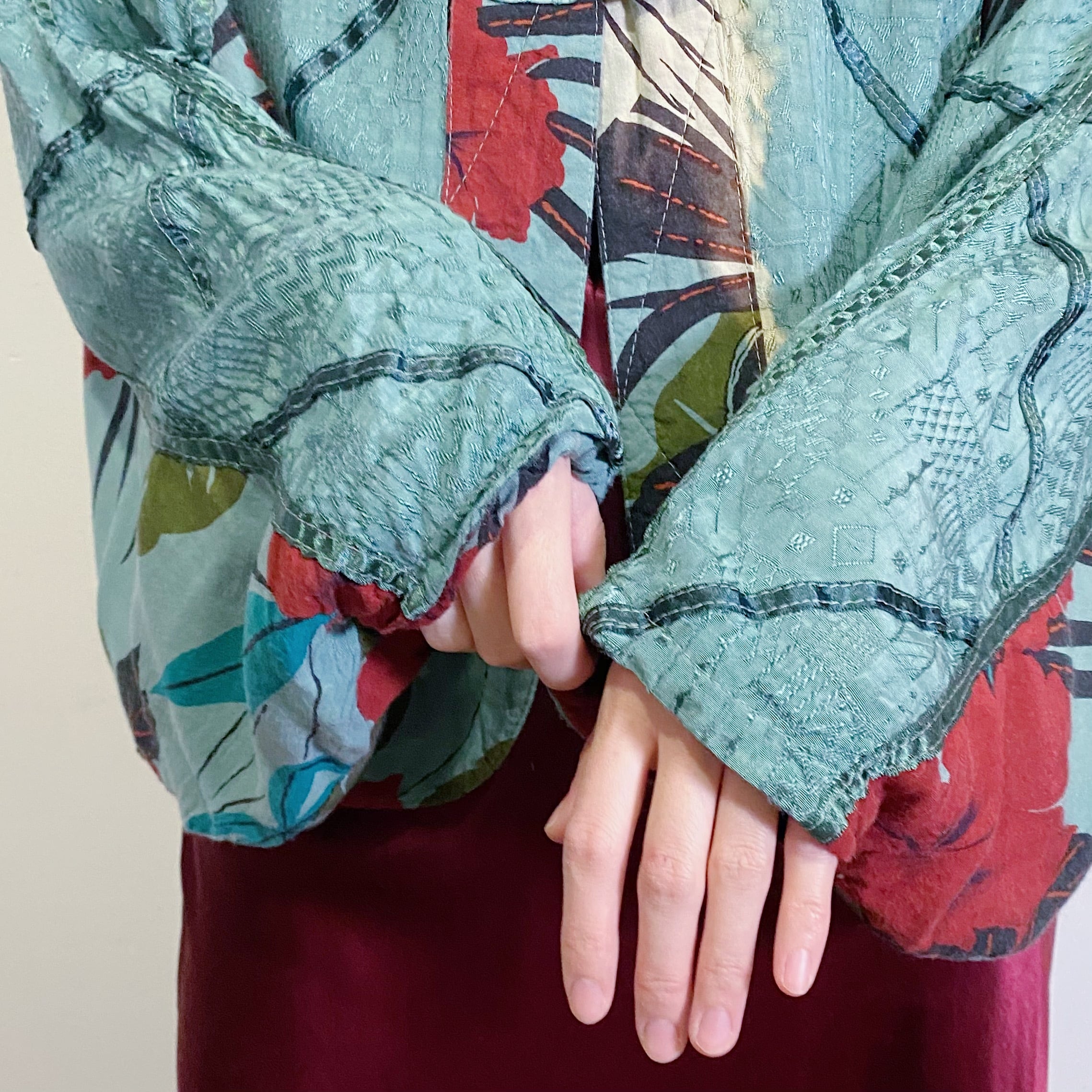 スモーキーなグリーンカラーに、花柄の切り替えやテープの装飾が可愛いジャケットです。