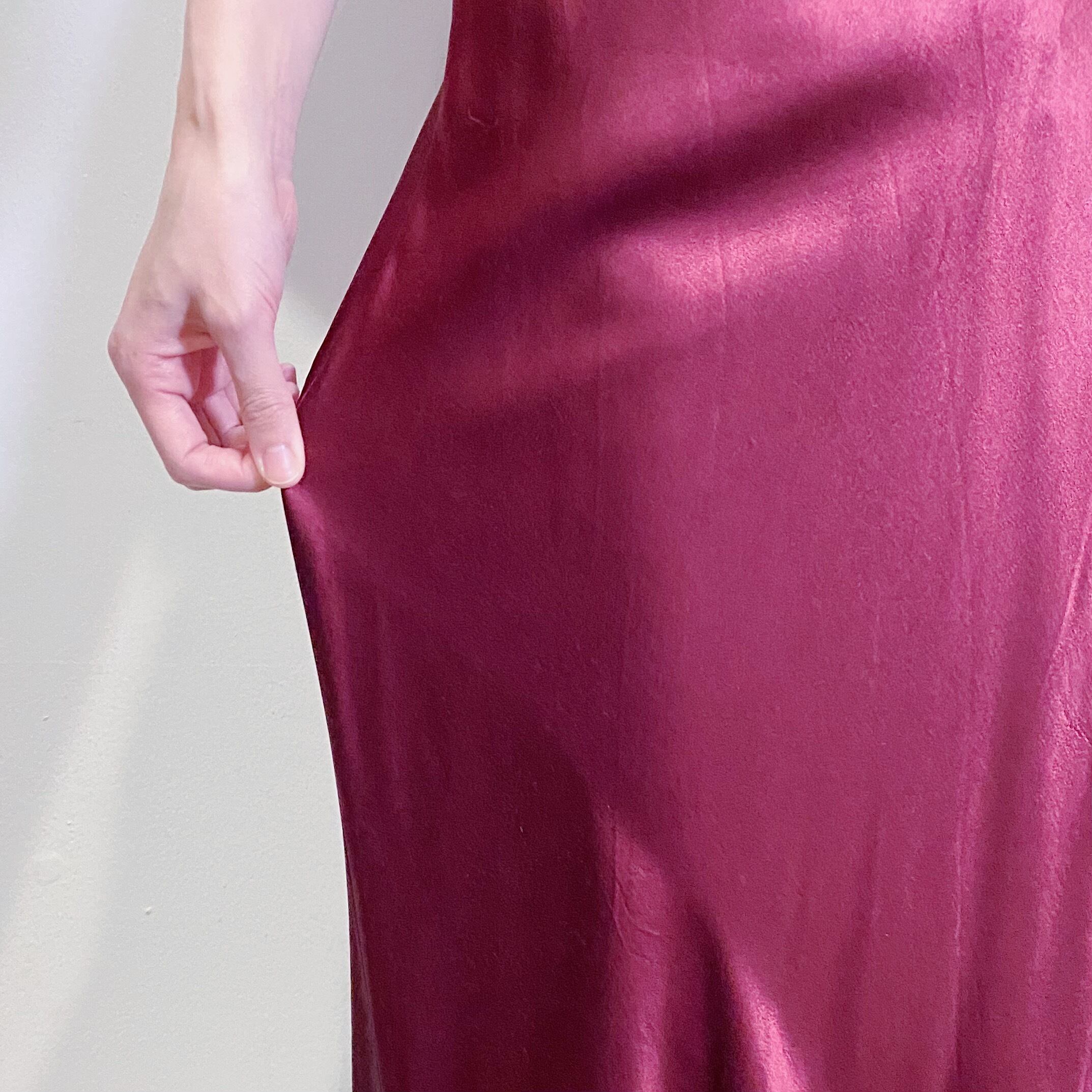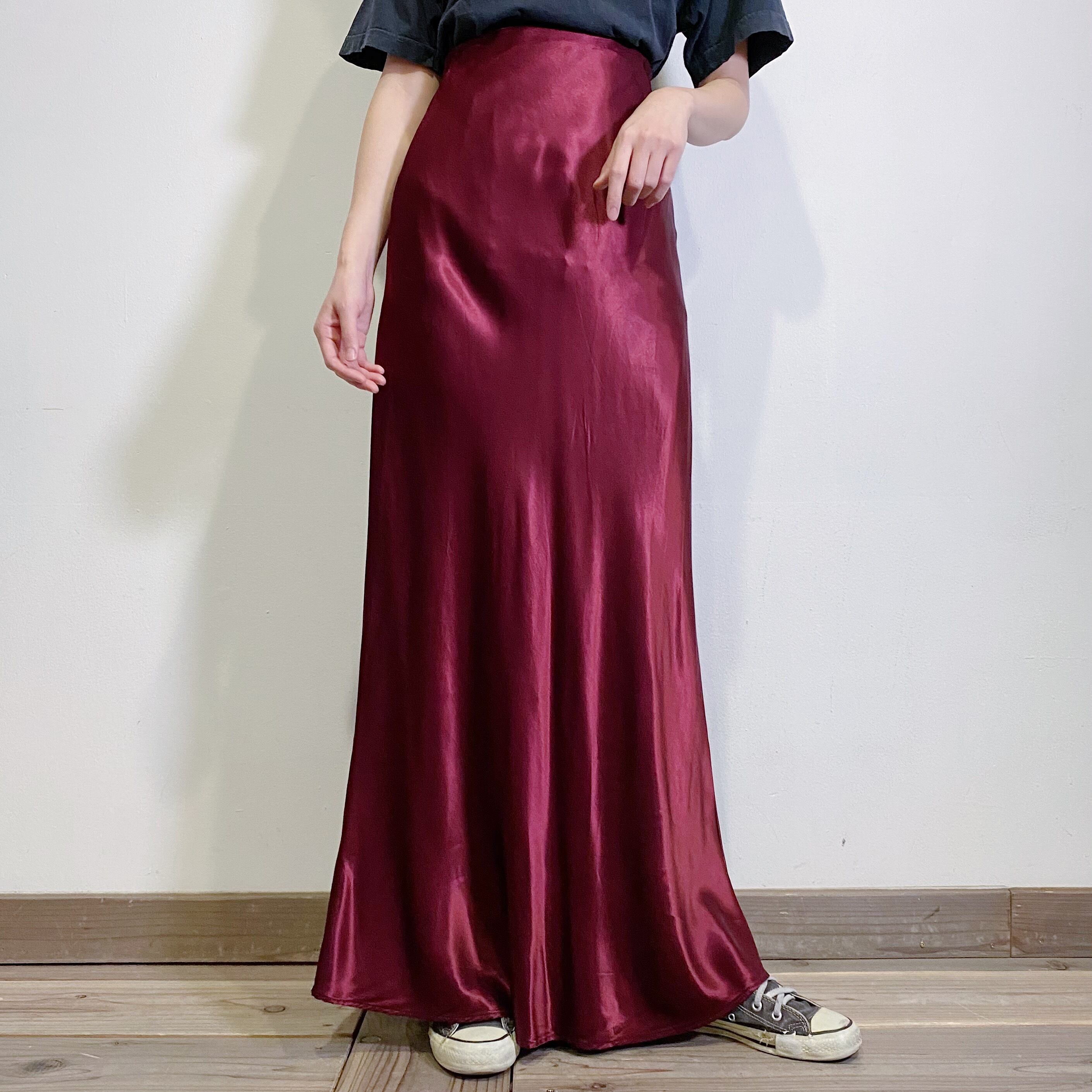 ワインレッドの色合いが可愛い、サテン地のロングスカートです。