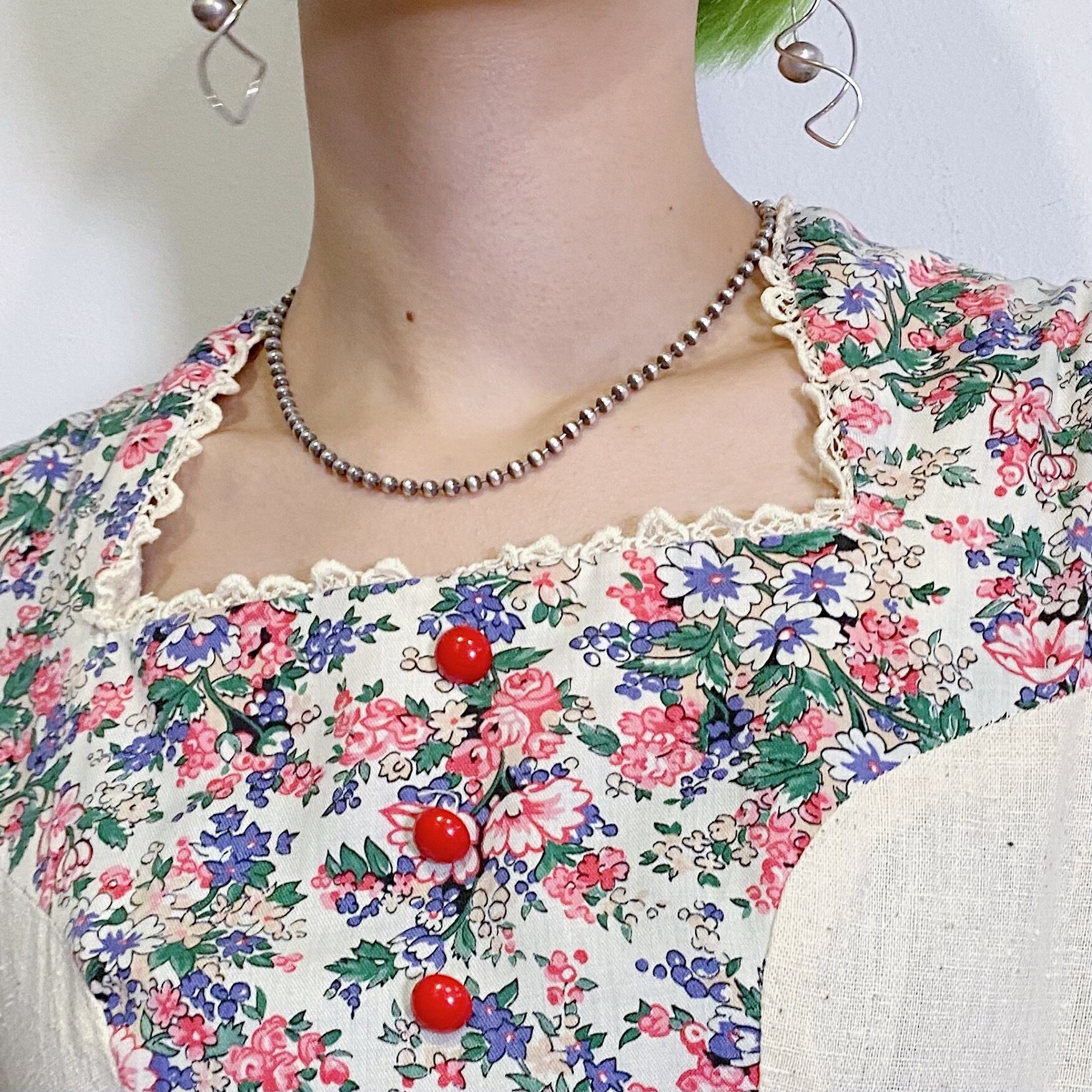 上半身やカフスの花柄切り替えがとっておきに可愛い70年代ワンピースです。