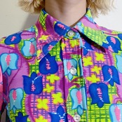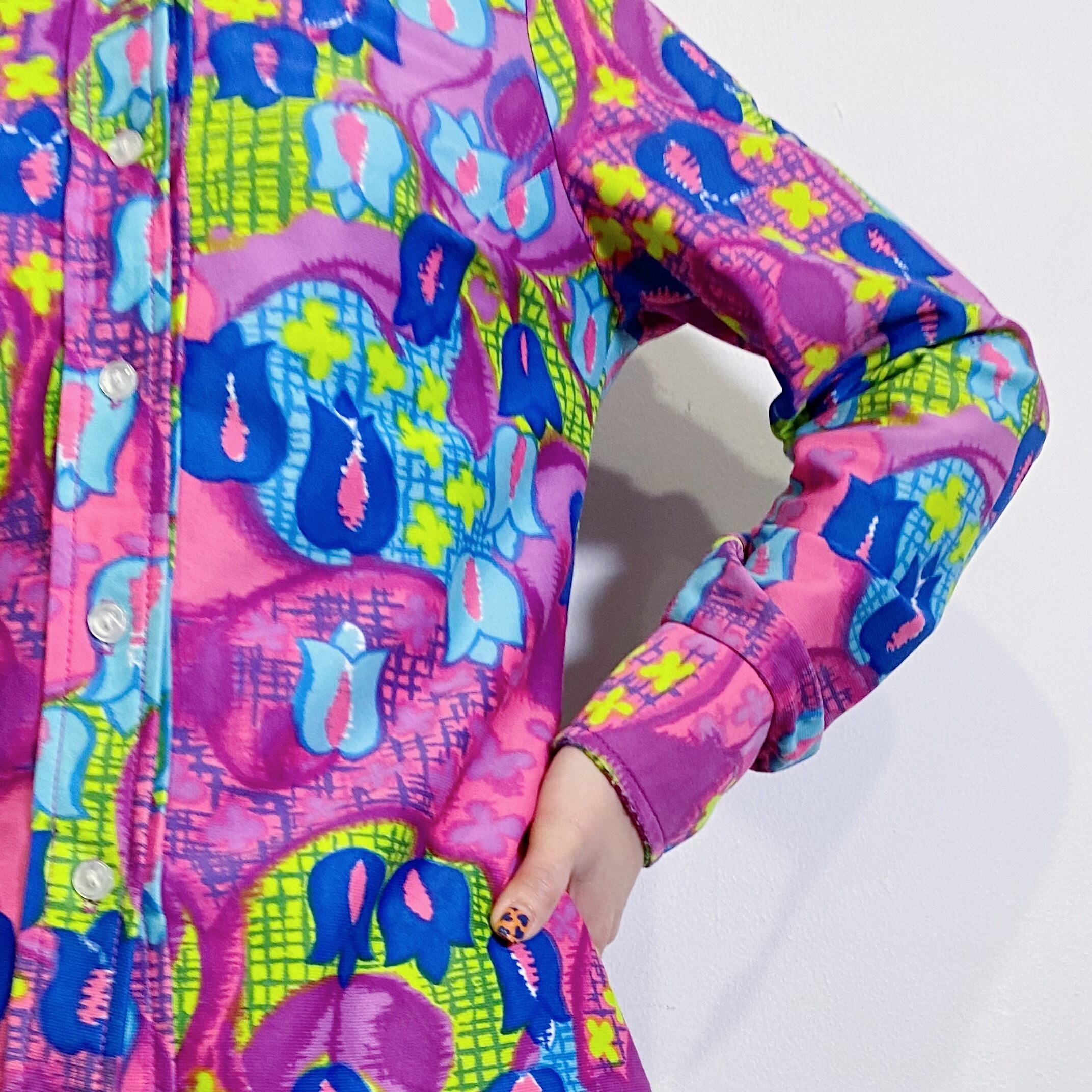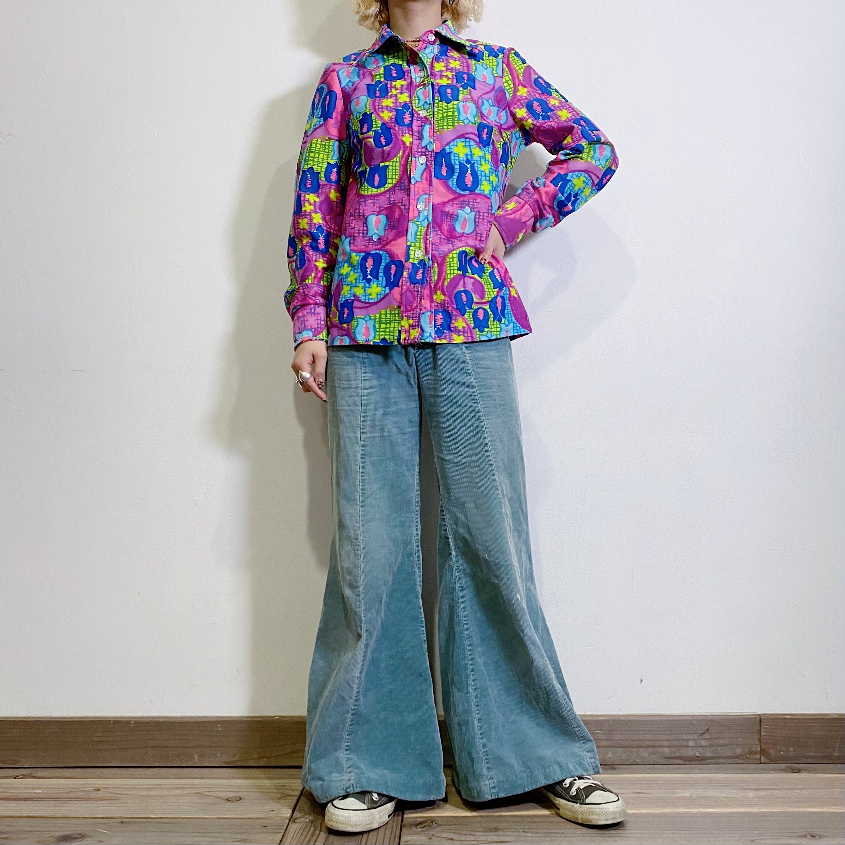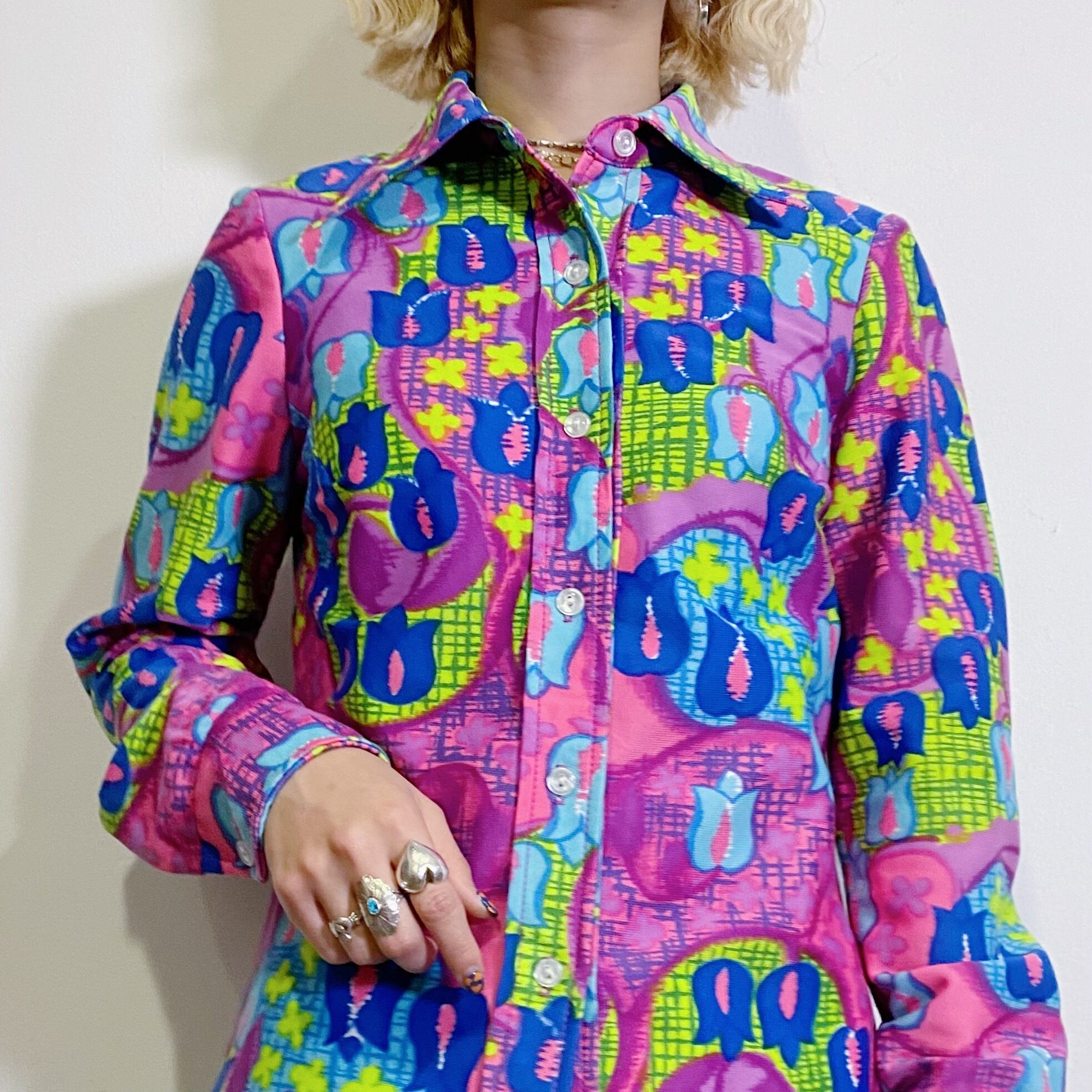 70年代らしいカラーリングに、大きな襟が可愛いシャツです。