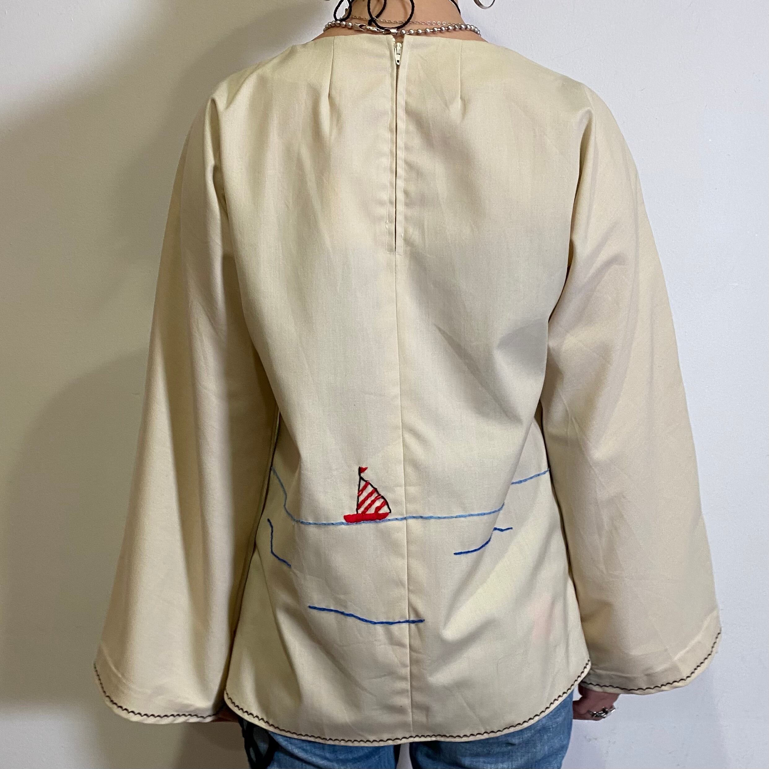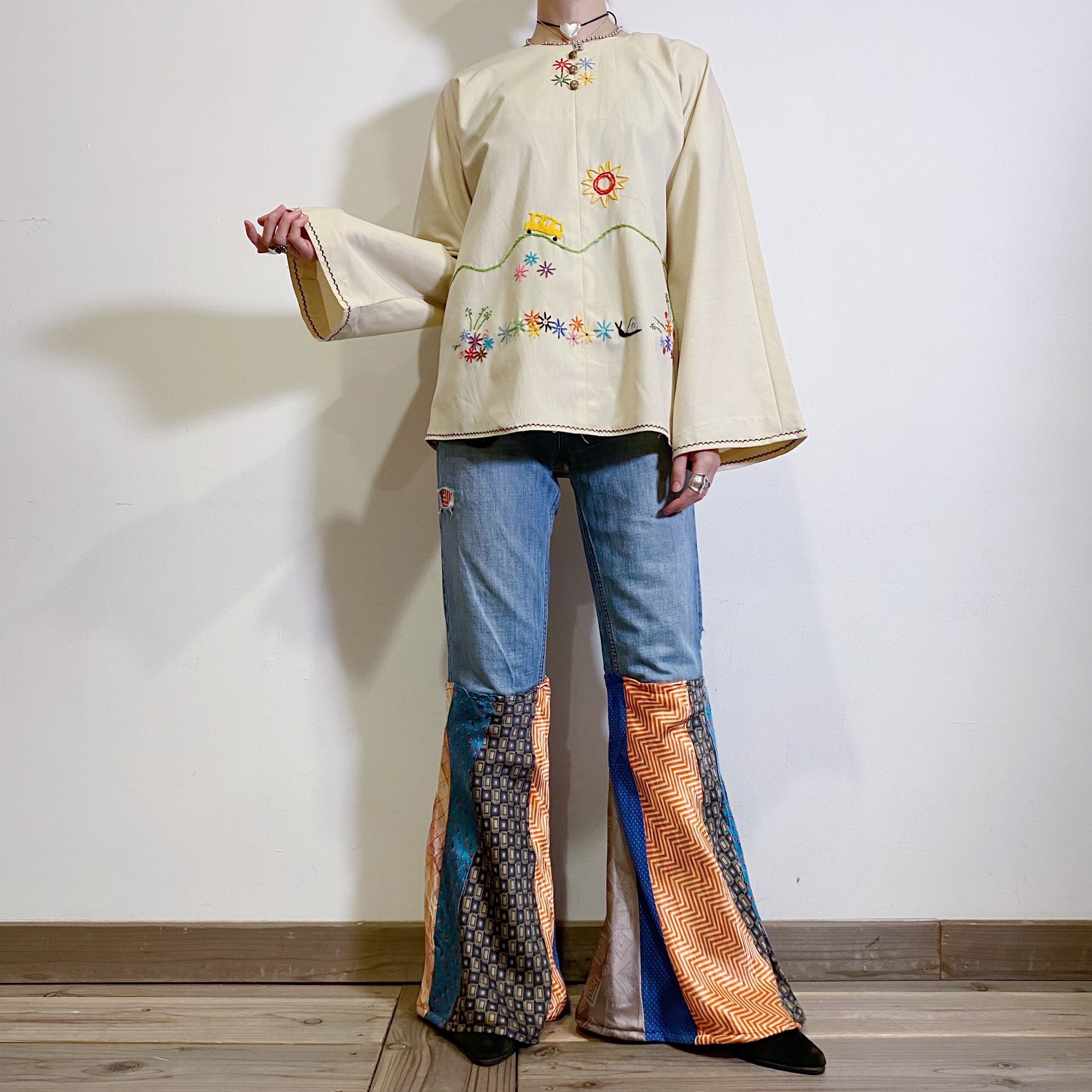 お花畑を黄色いバスがドライブしているようなシーンが、カラフルな手刺繍で表現された70年代のチュニックトップです。