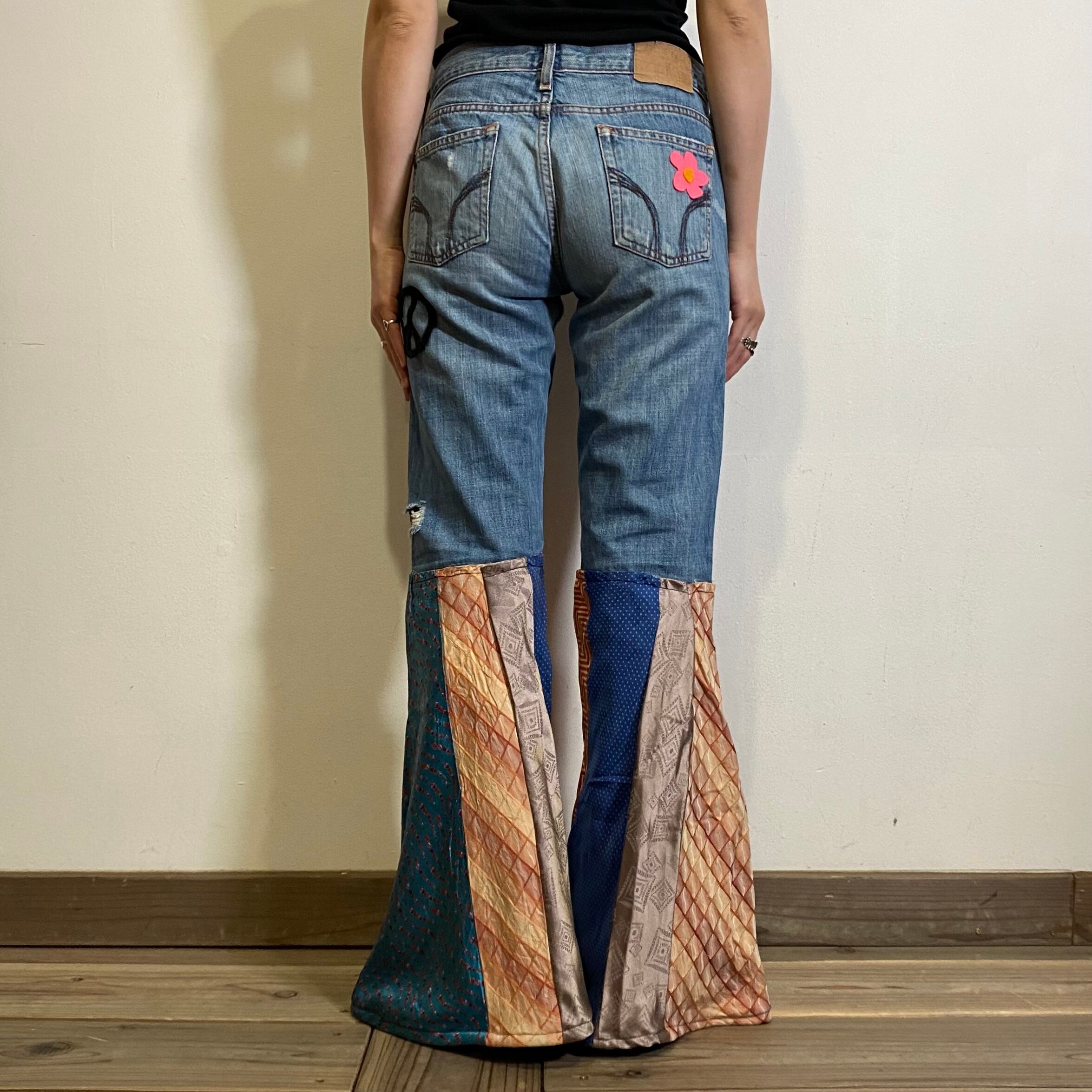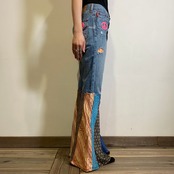 いろんな柄のパッチワークの布がフレアに上から縫い付けられたリメイクデニムパンツです。
