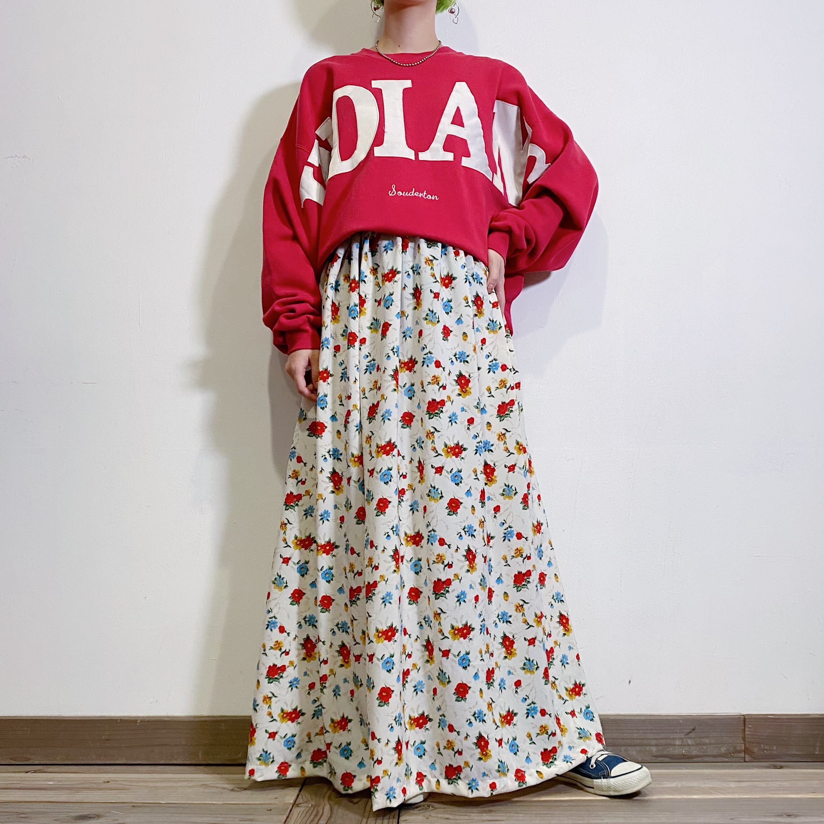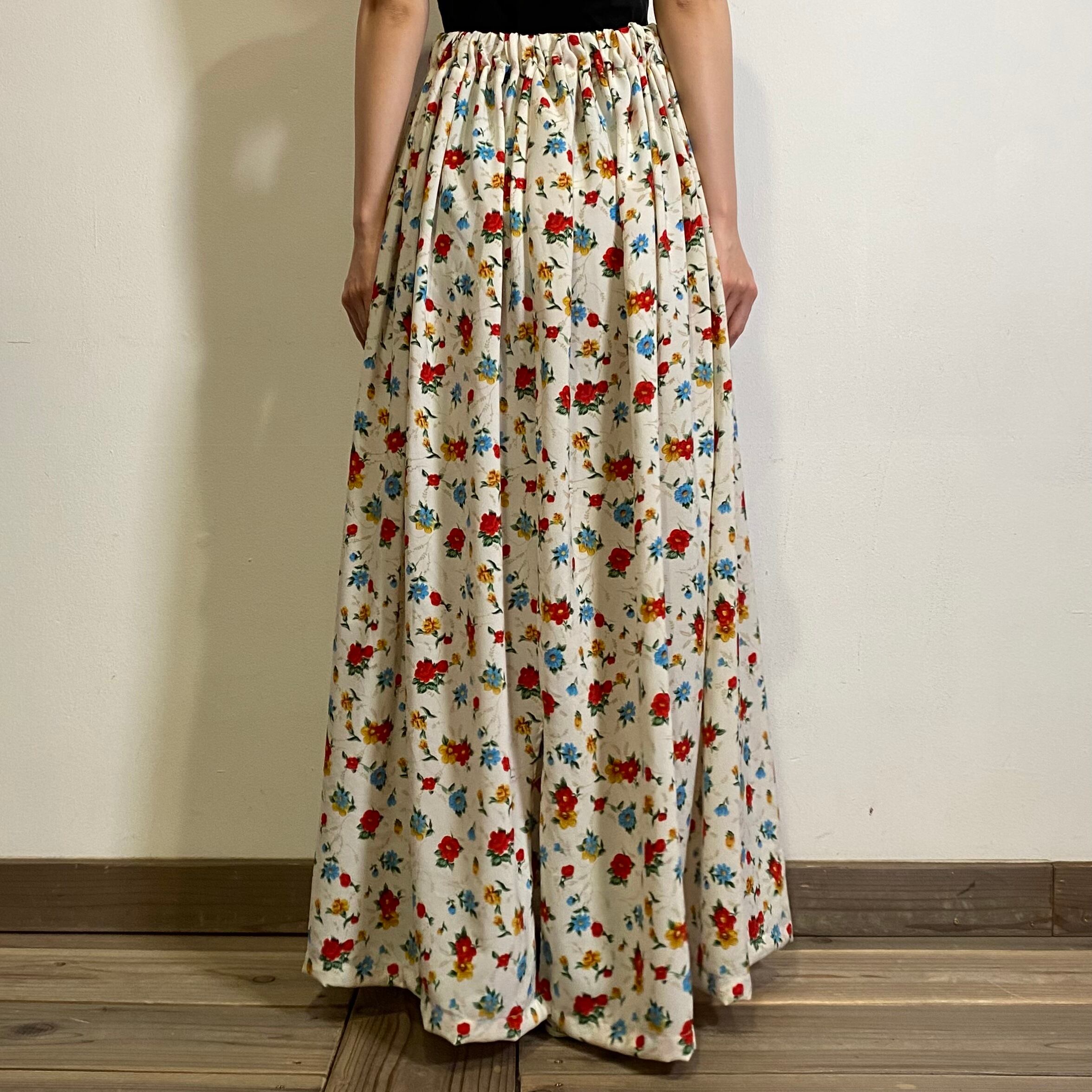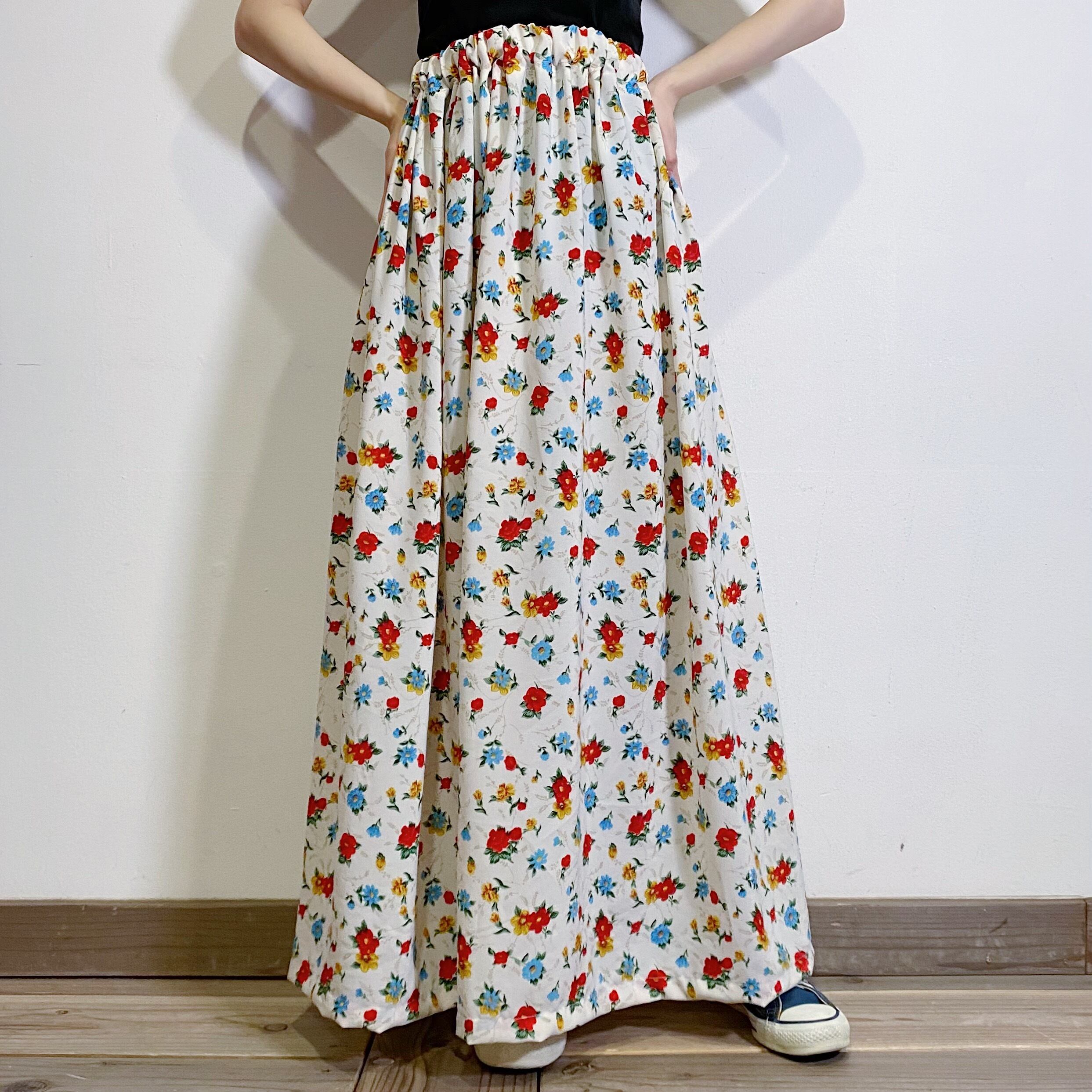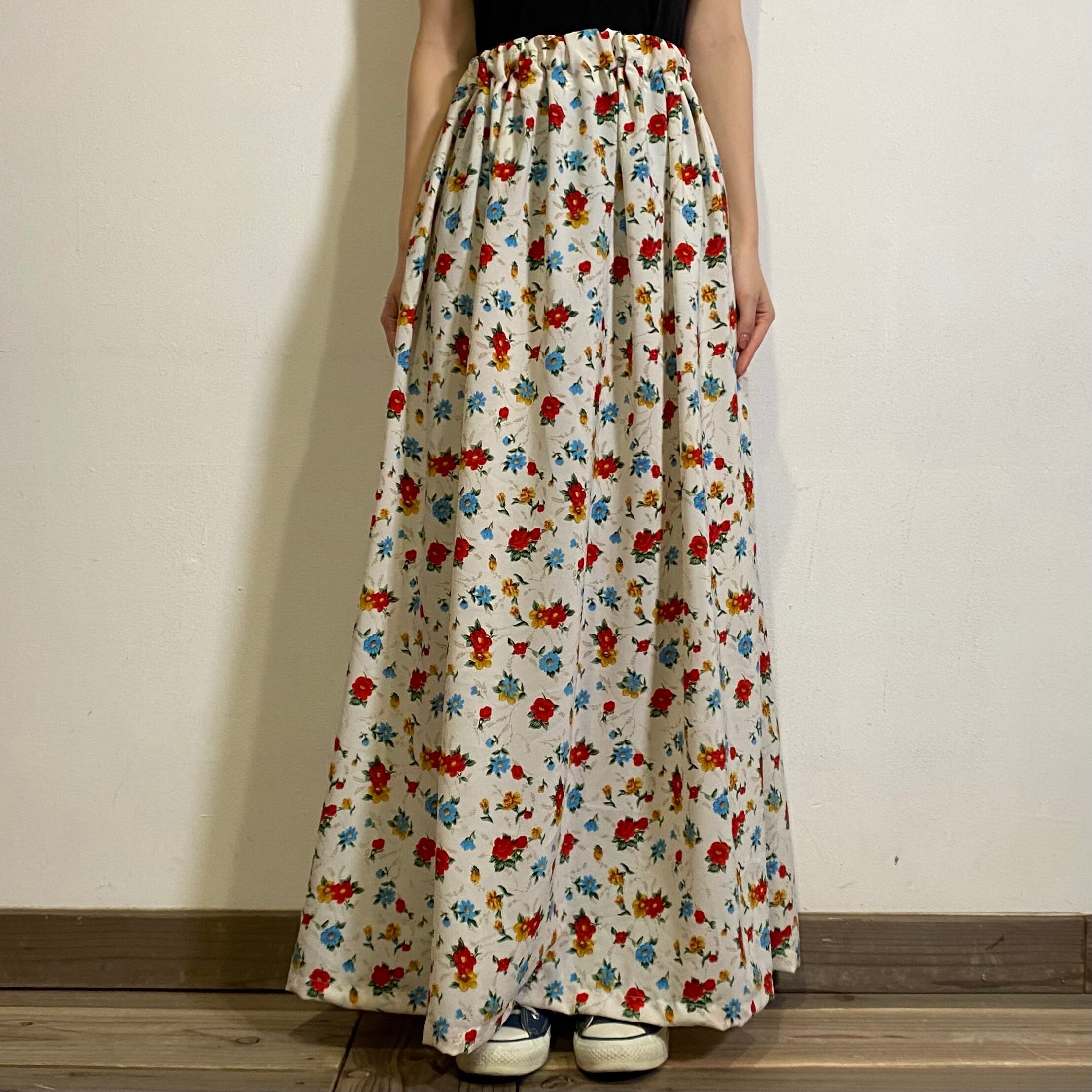ホワイトボディにカラフルな花柄がさわやかでかわいい、80年代のロングスカートです。