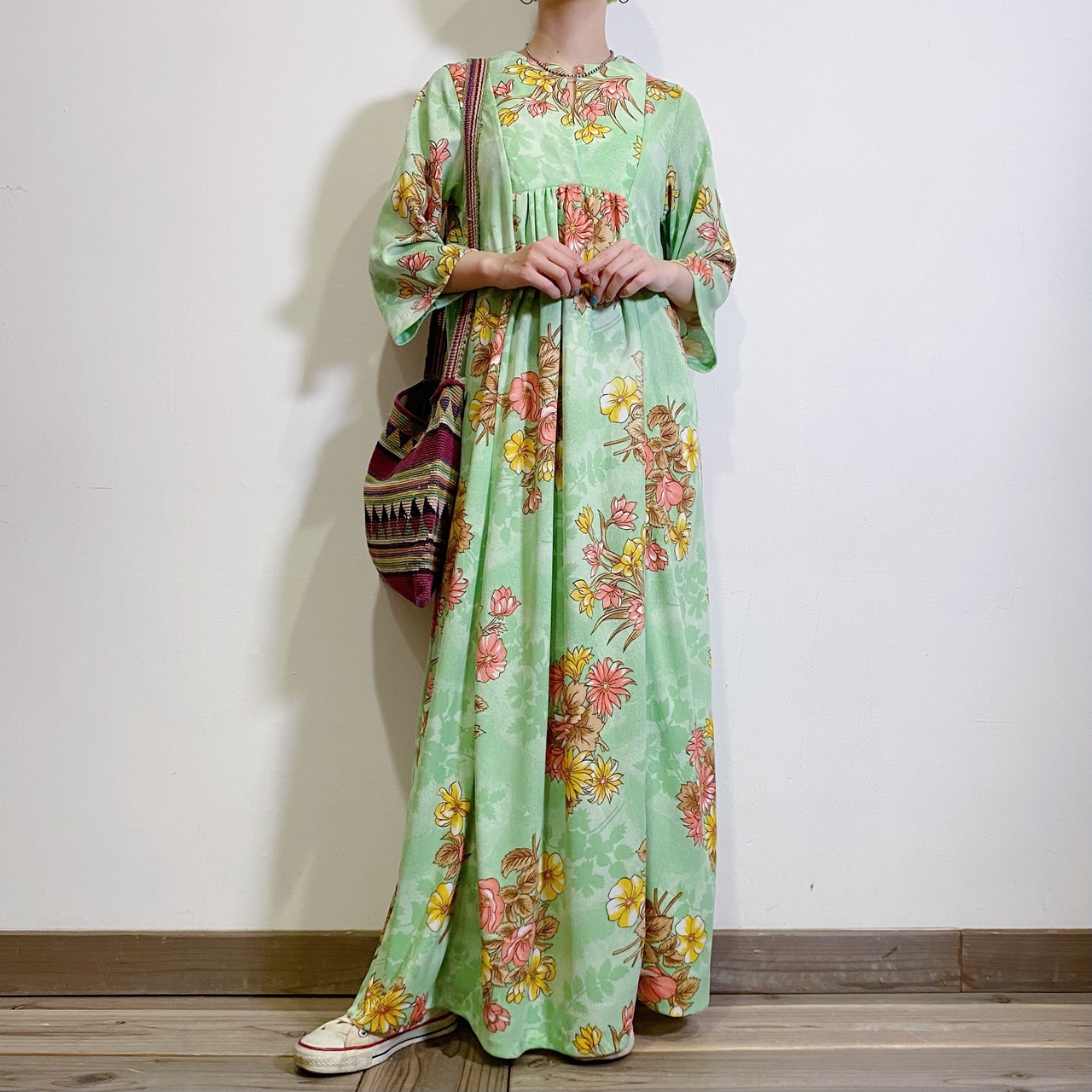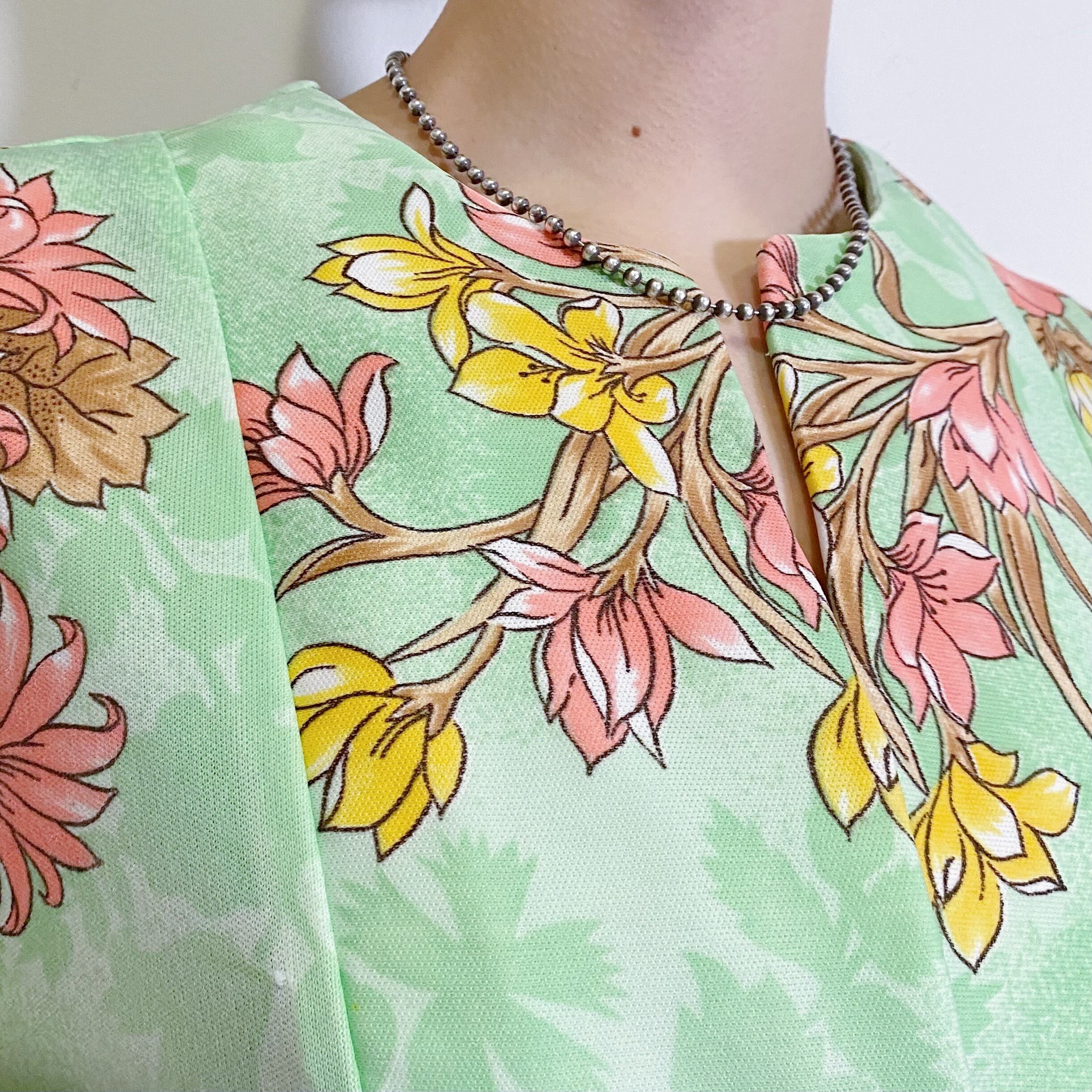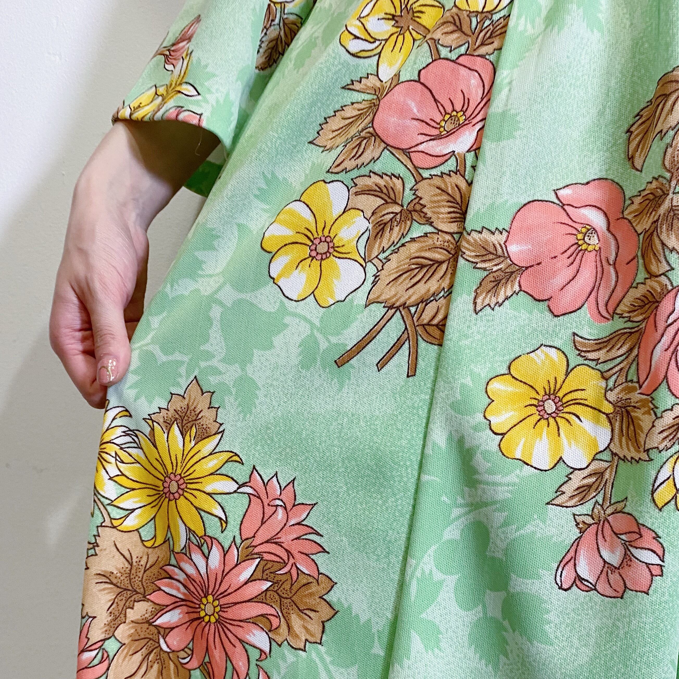 ライトグリーンにオレンジと黄色の花柄が可愛い、70年代のワンピースです。