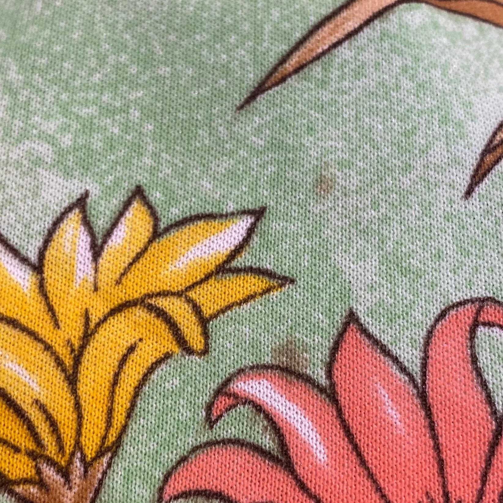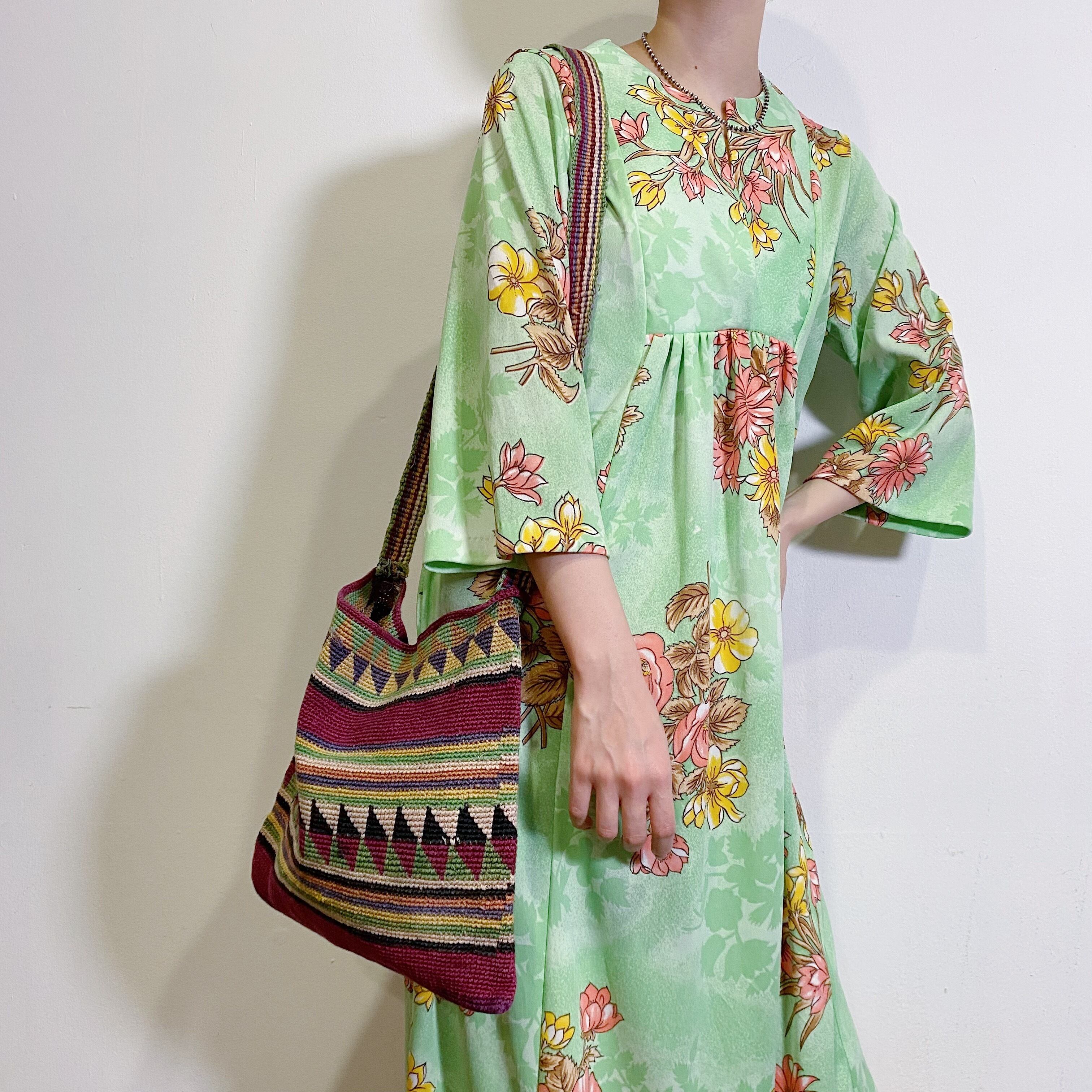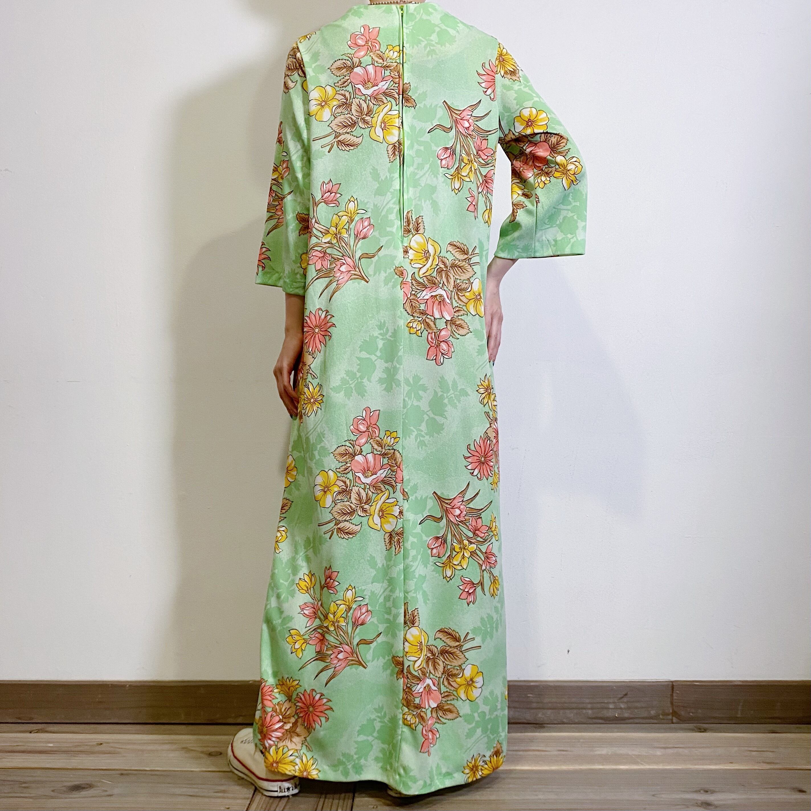 ライトグリーンにオレンジと黄色の花柄が可愛い、70年代のワンピースです。