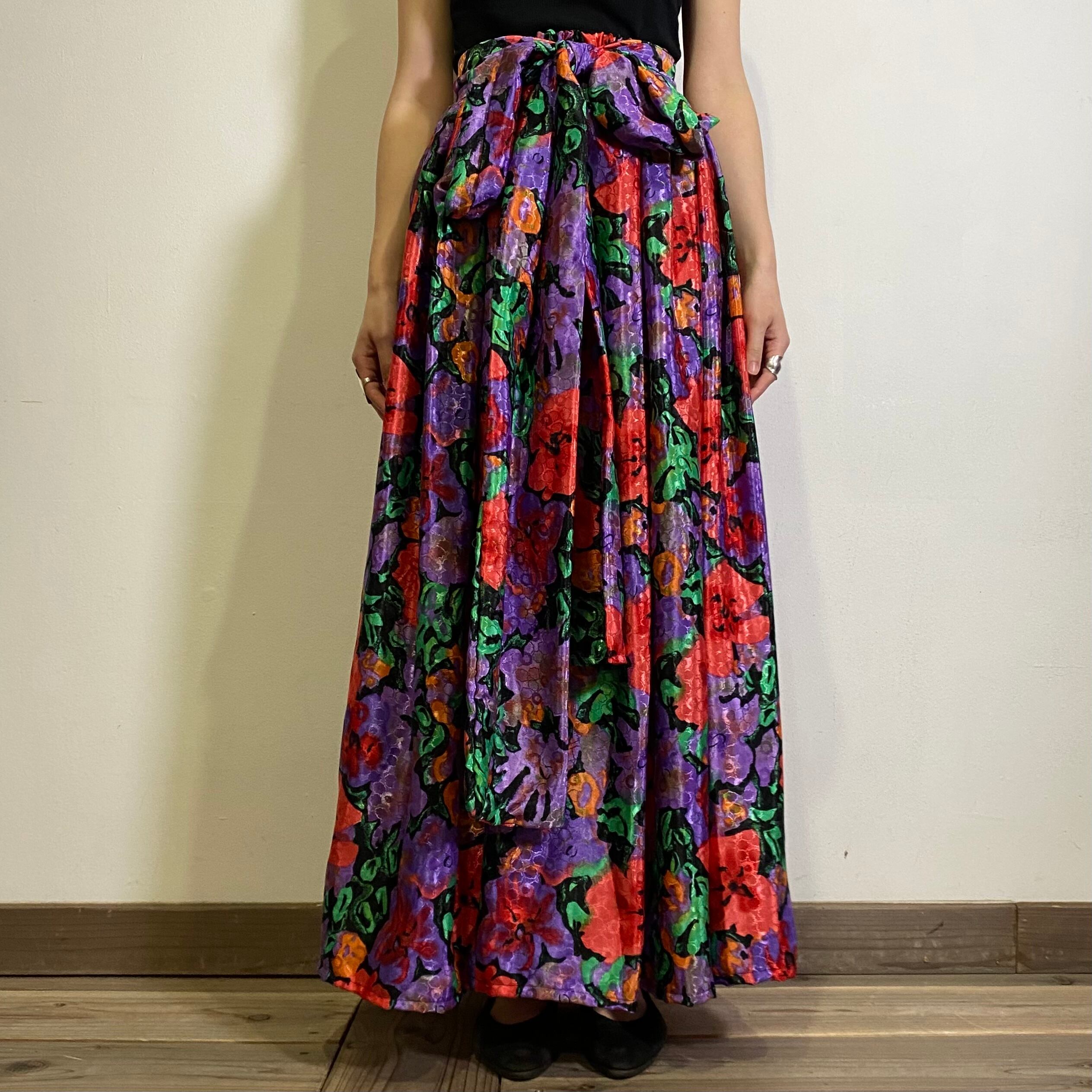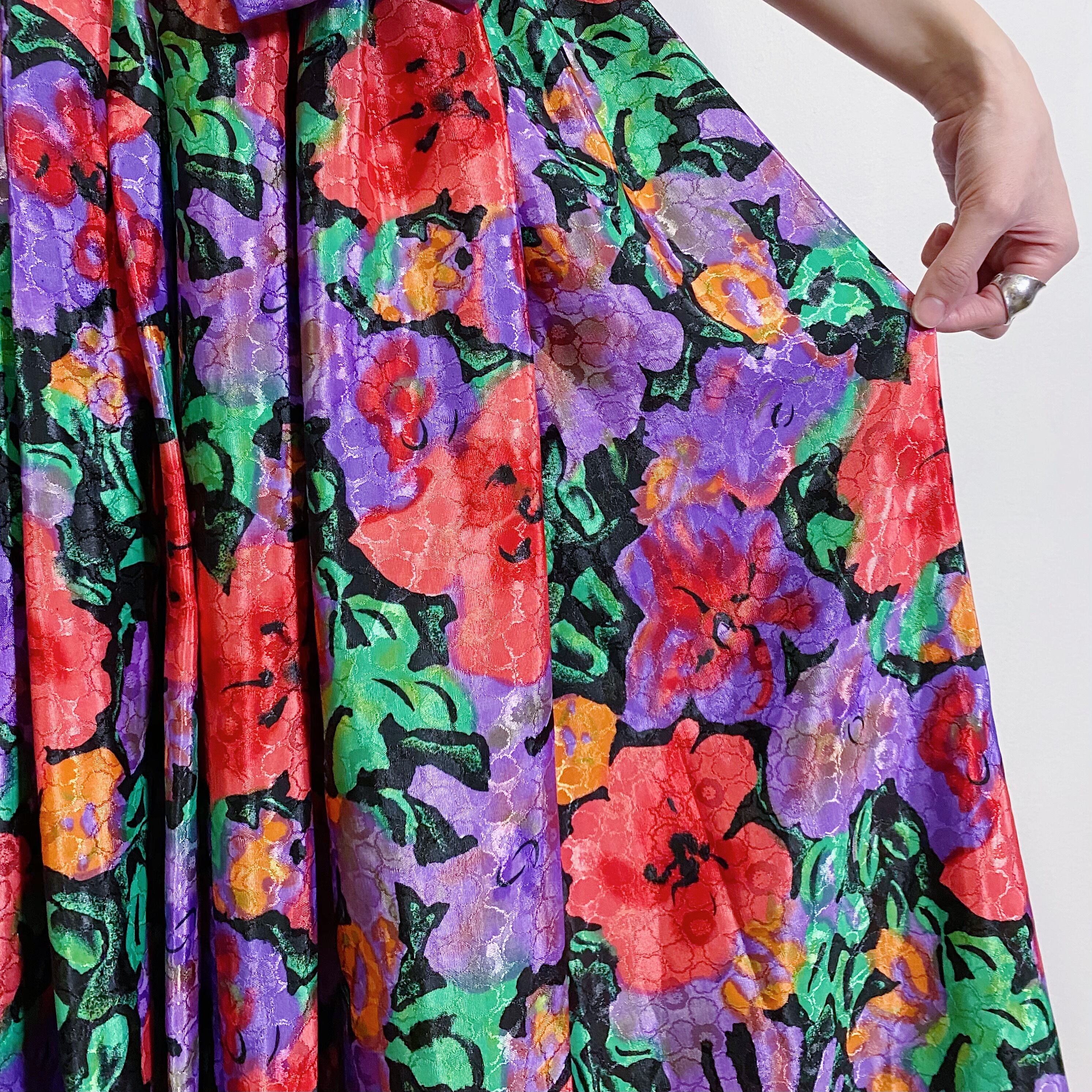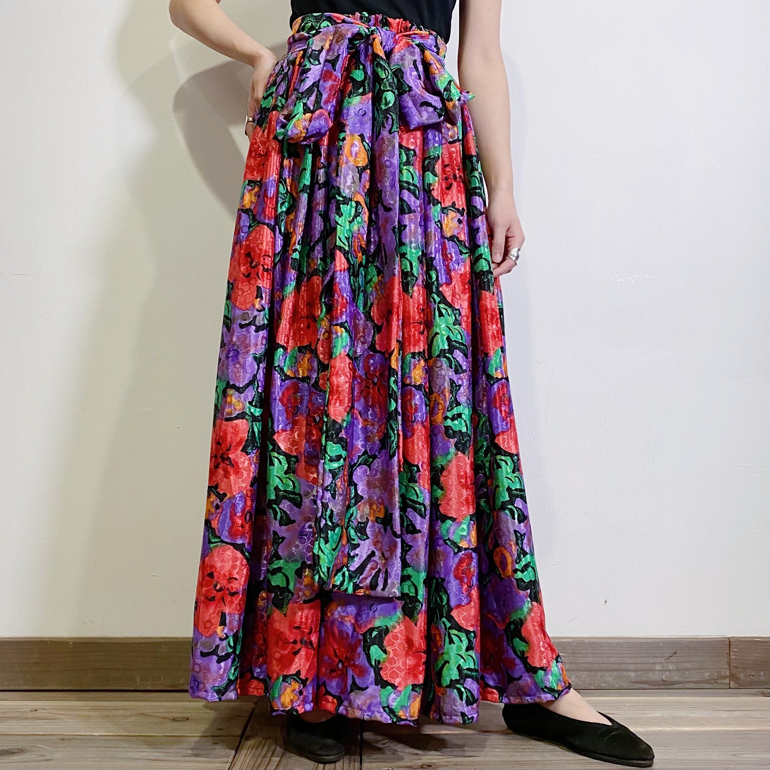 赤や紫の水彩画タッチの花柄が可愛い、80年代のスカートです。