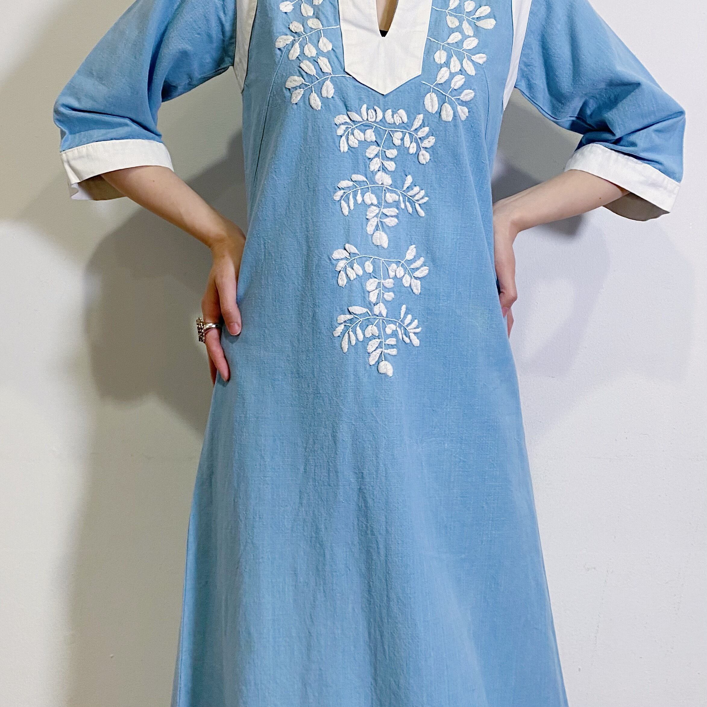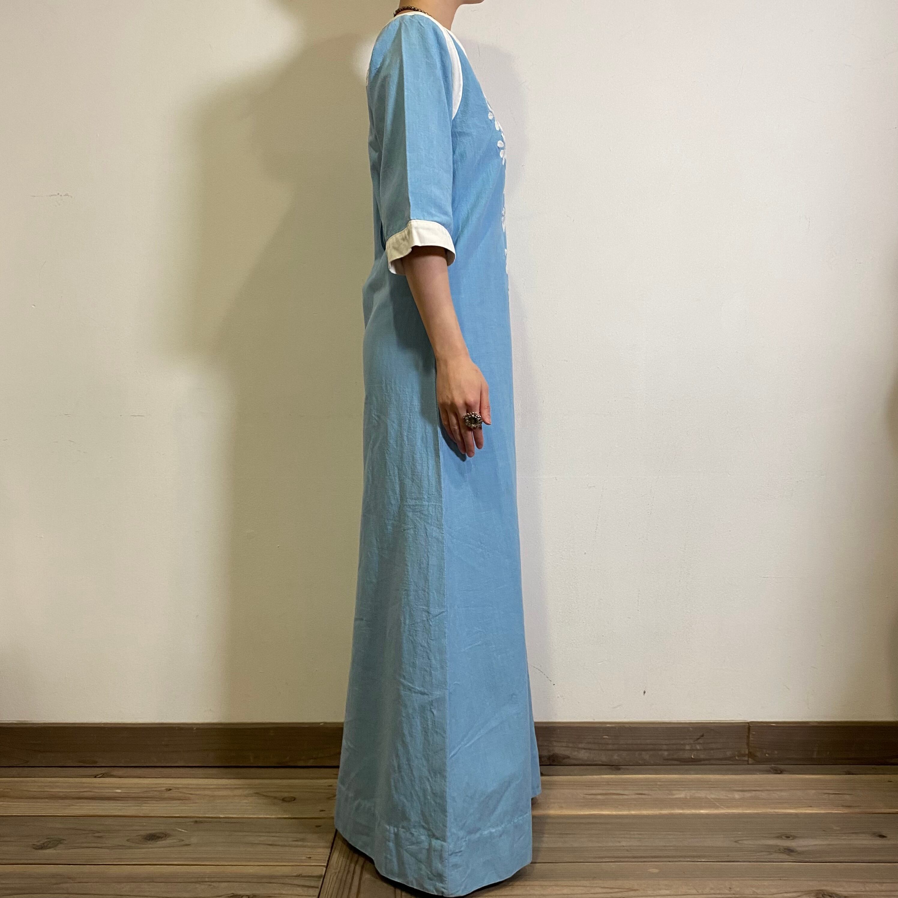 60s sax blue embroidery long dress