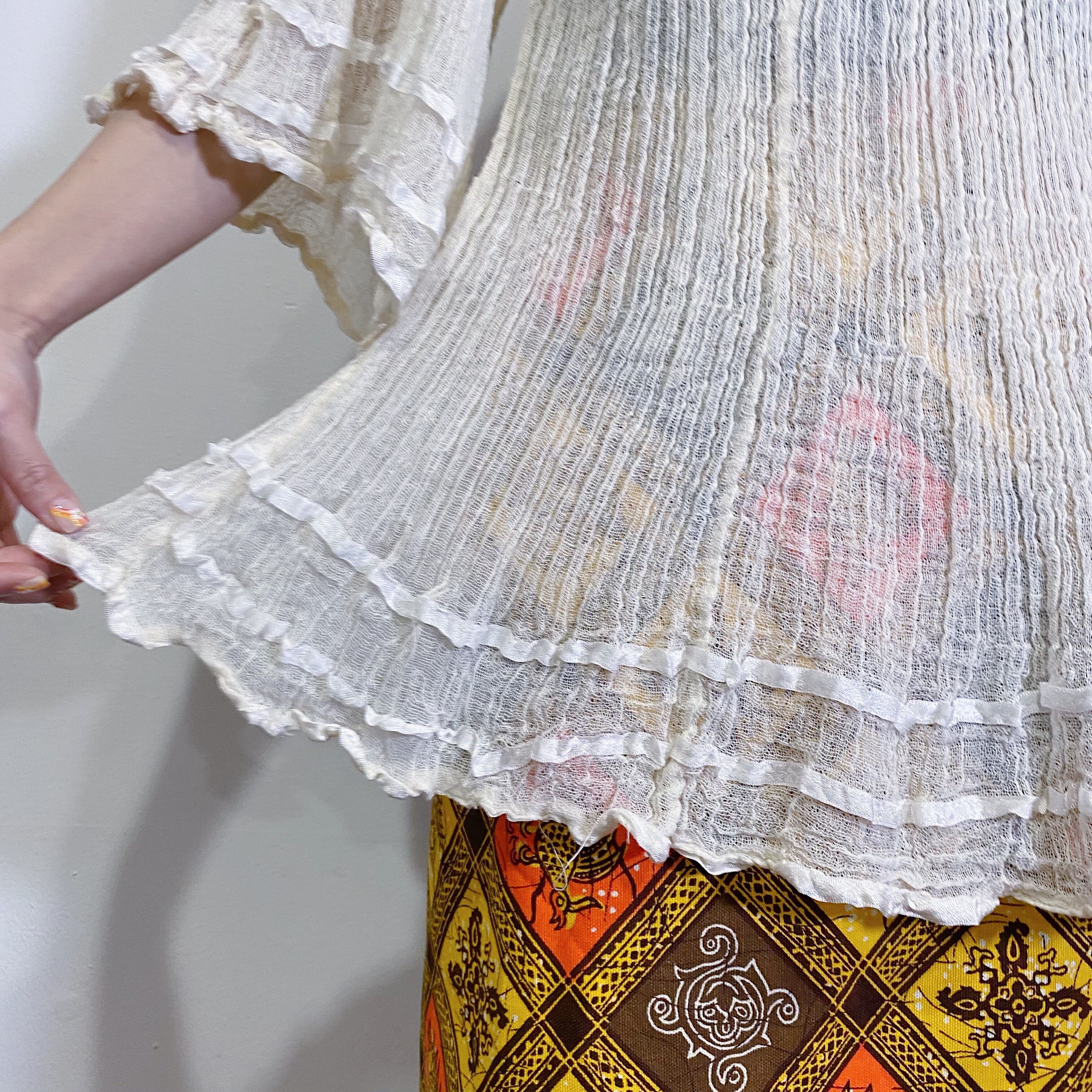 やわらかなコットンガーゼ素材に、ふんわり広がるフレアスリーブのお袖がとっても可愛い一枚。