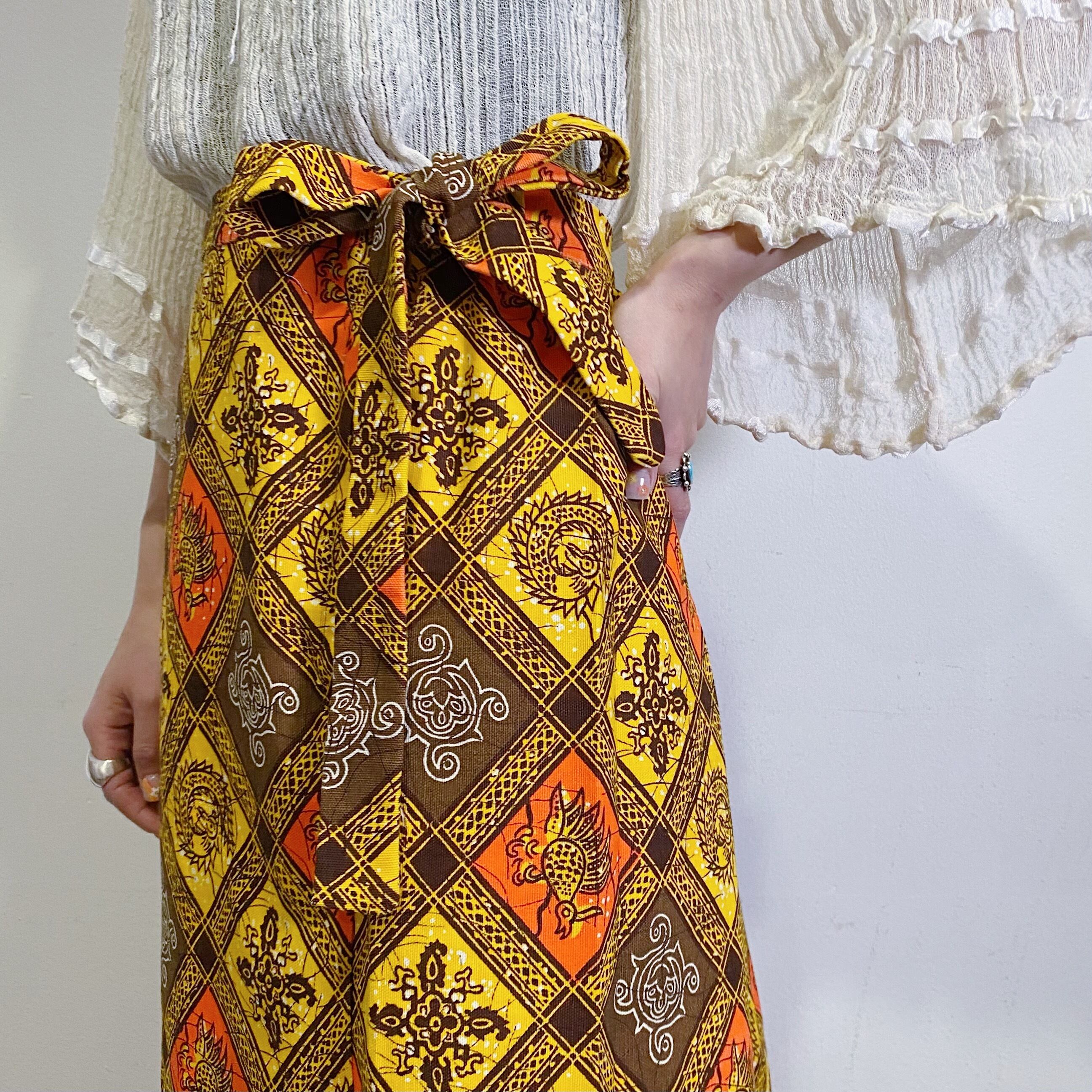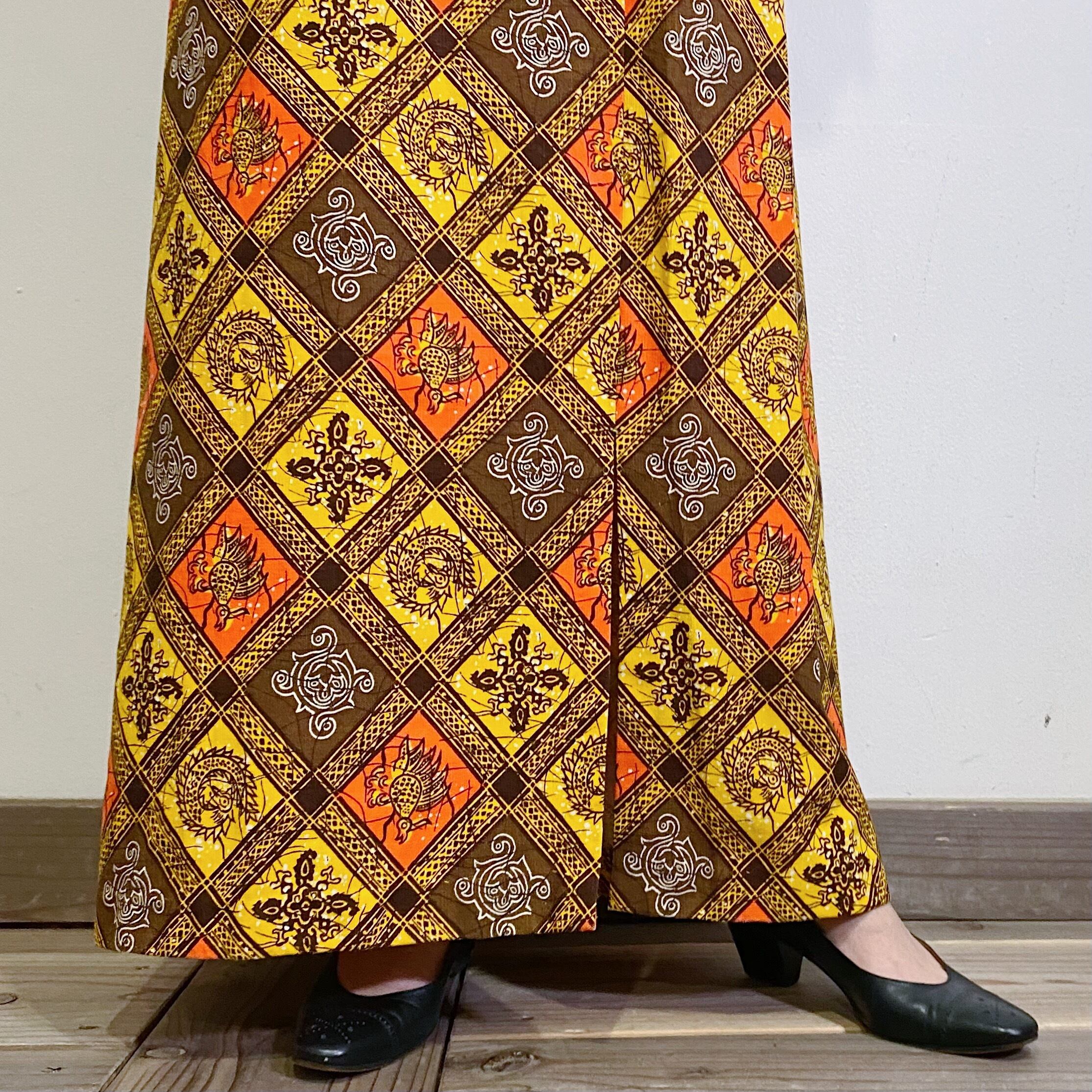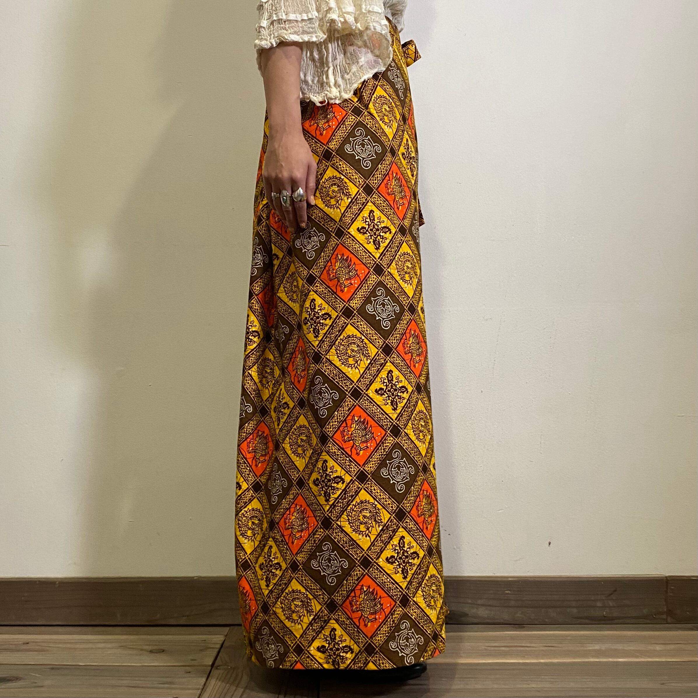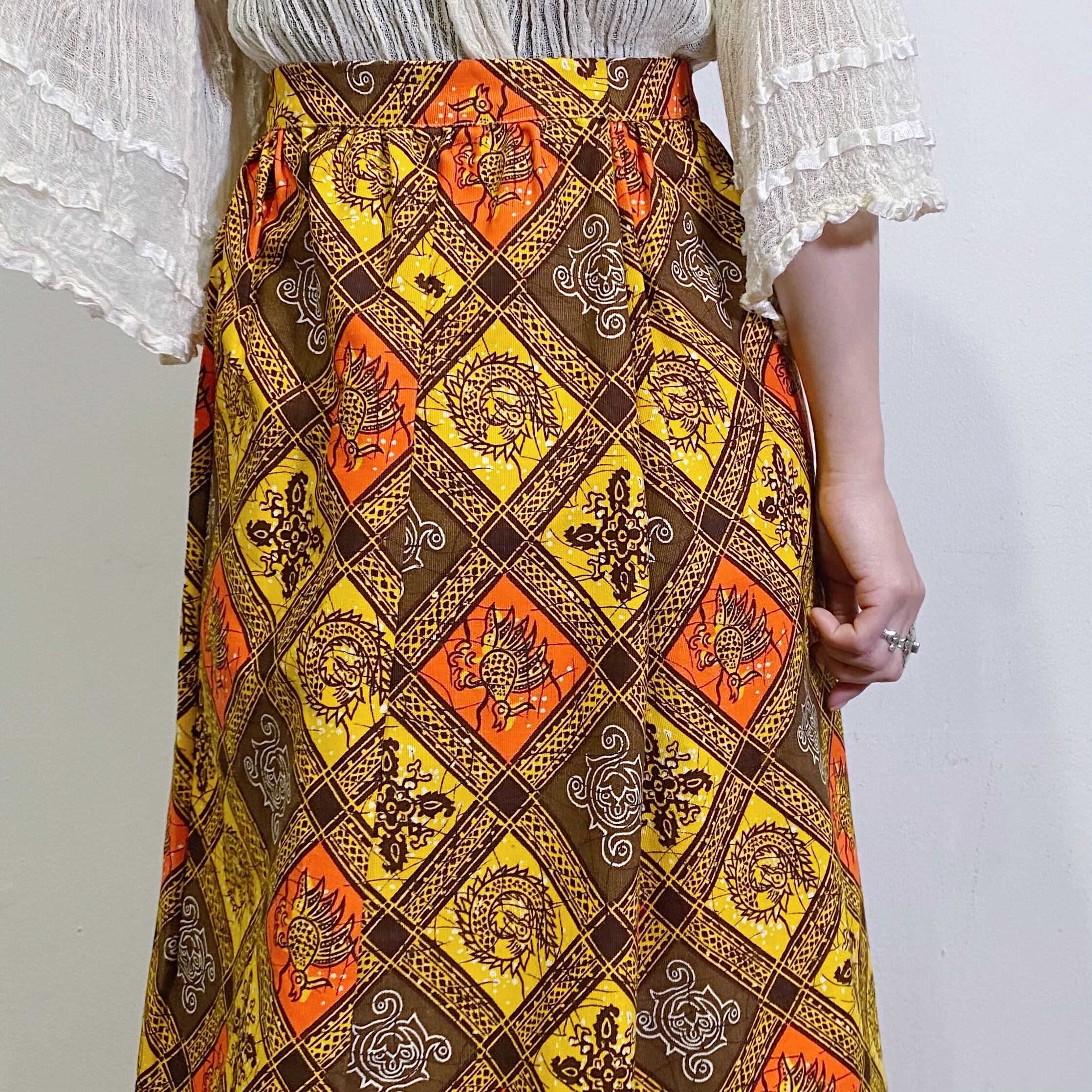 イエローやブラウン・オレンジのカラーリングが可愛い、70年代のロングスカートです。