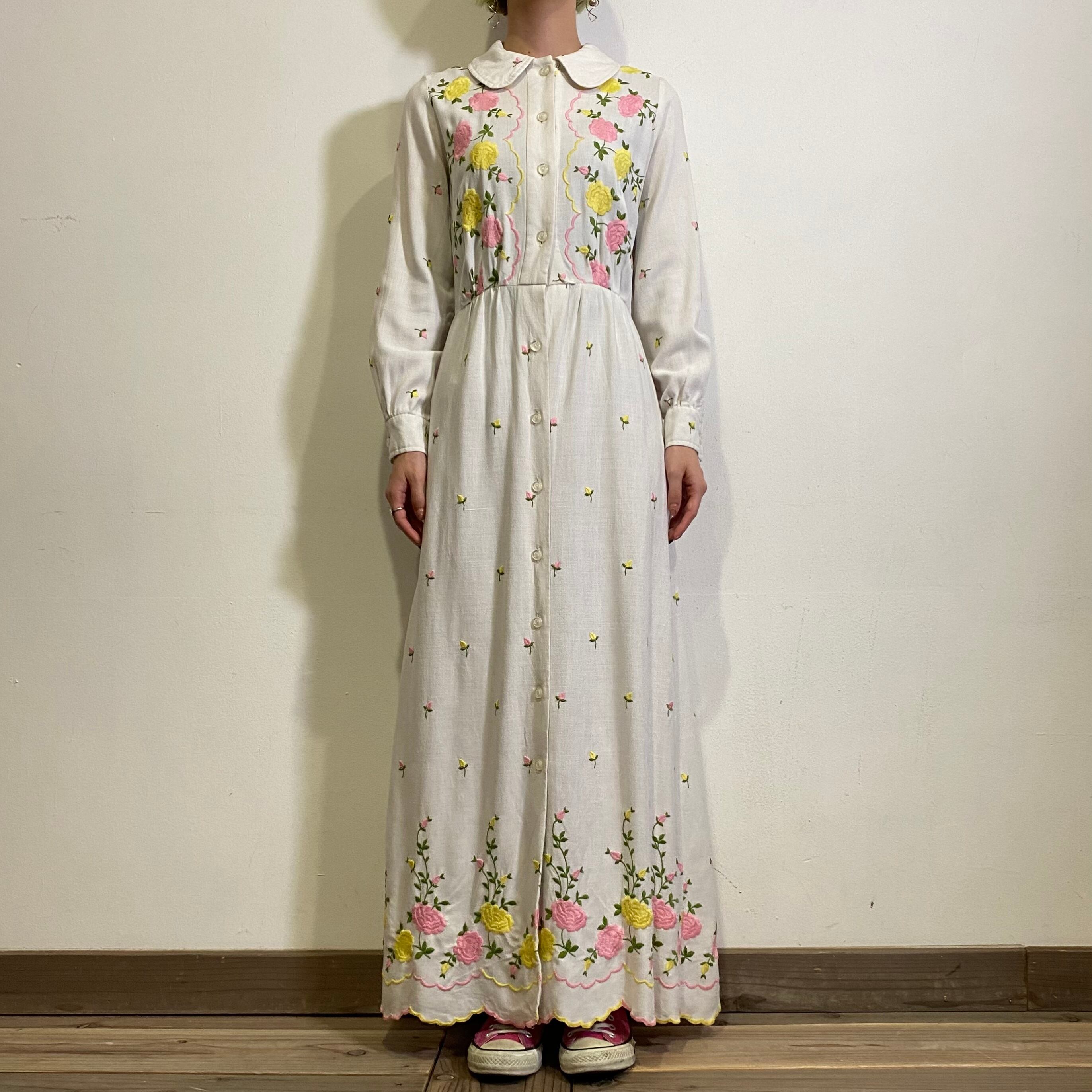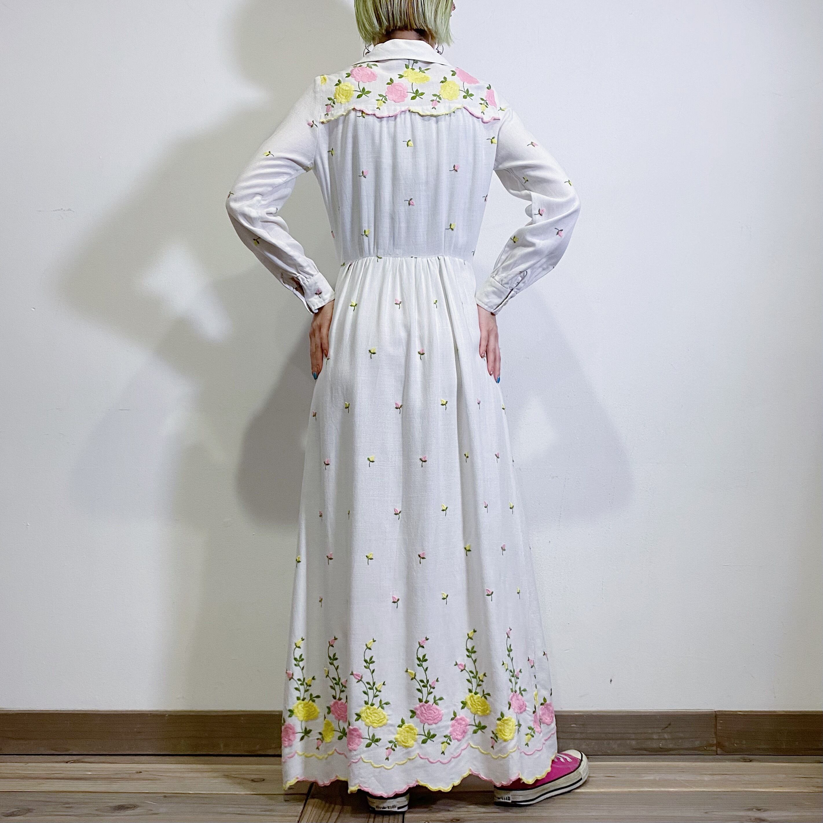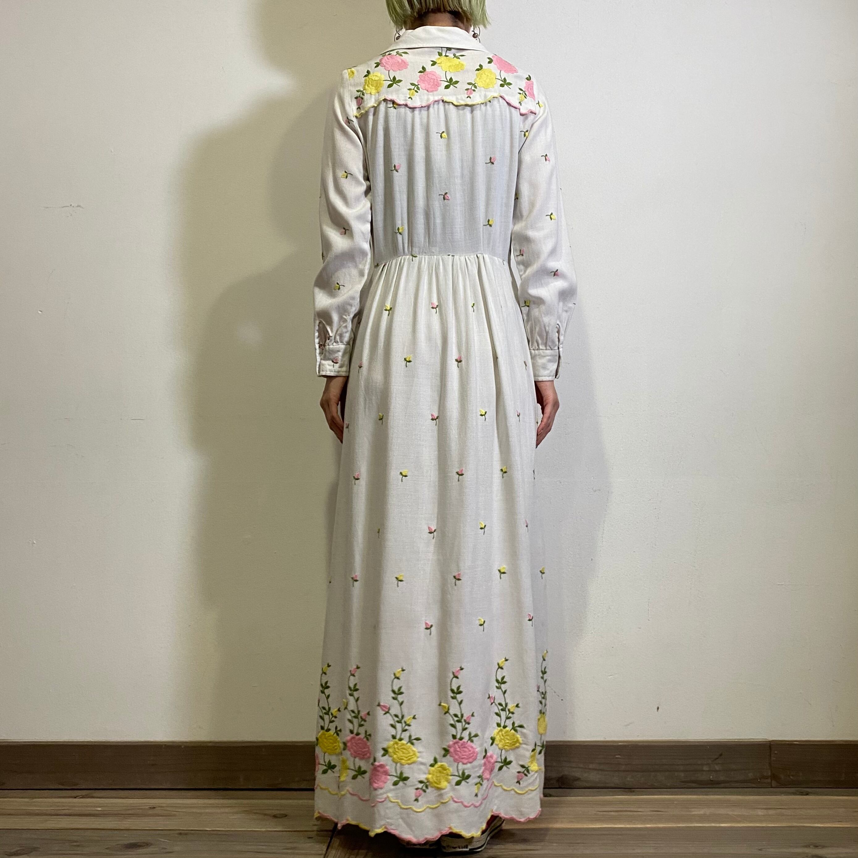 イエローやピンクのお花の刺繍がとっても素敵な、60~70年代のロングワンピースです。
