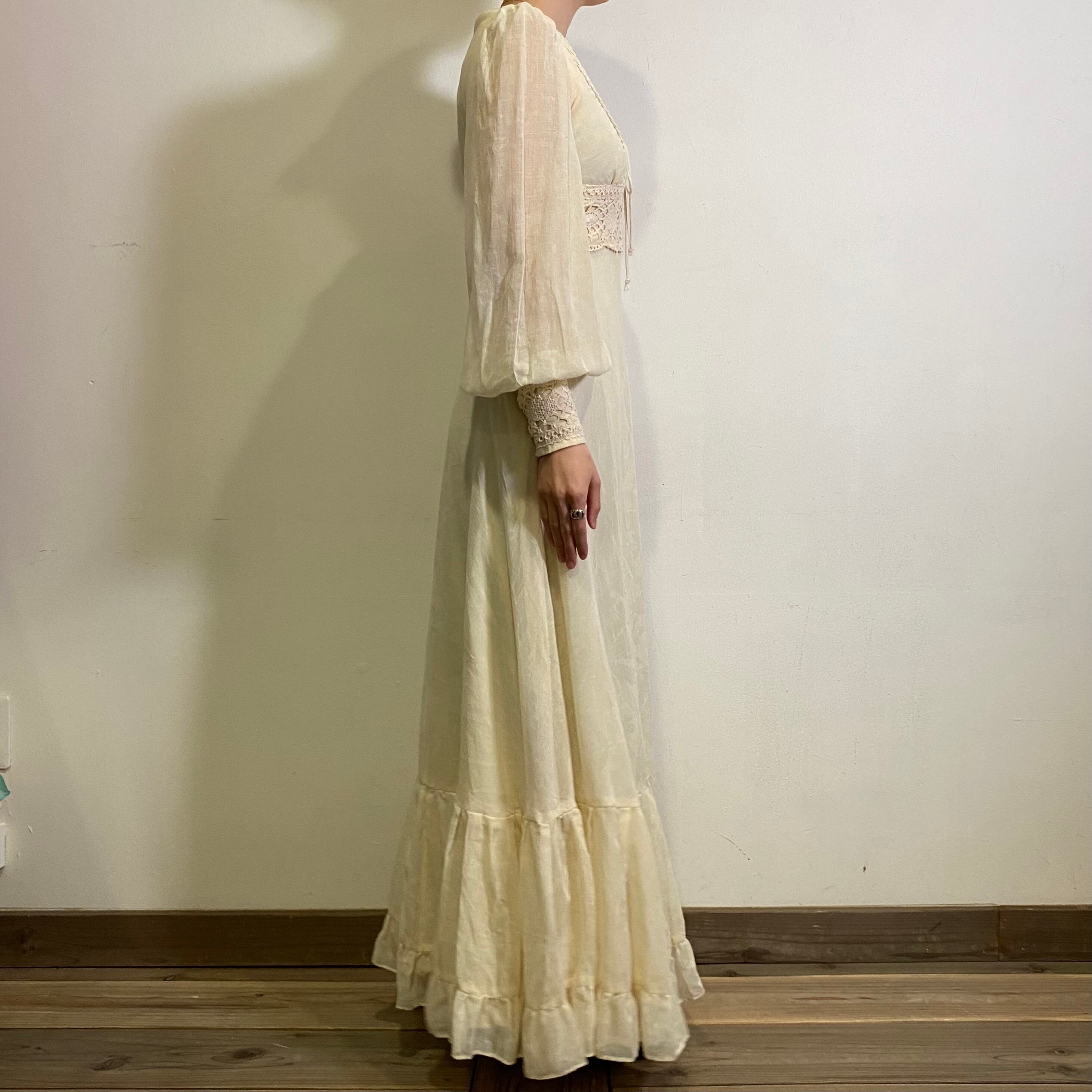 首周りのレースアップやバテンレース、ロングカフスが素敵な70年代のワンピースです。