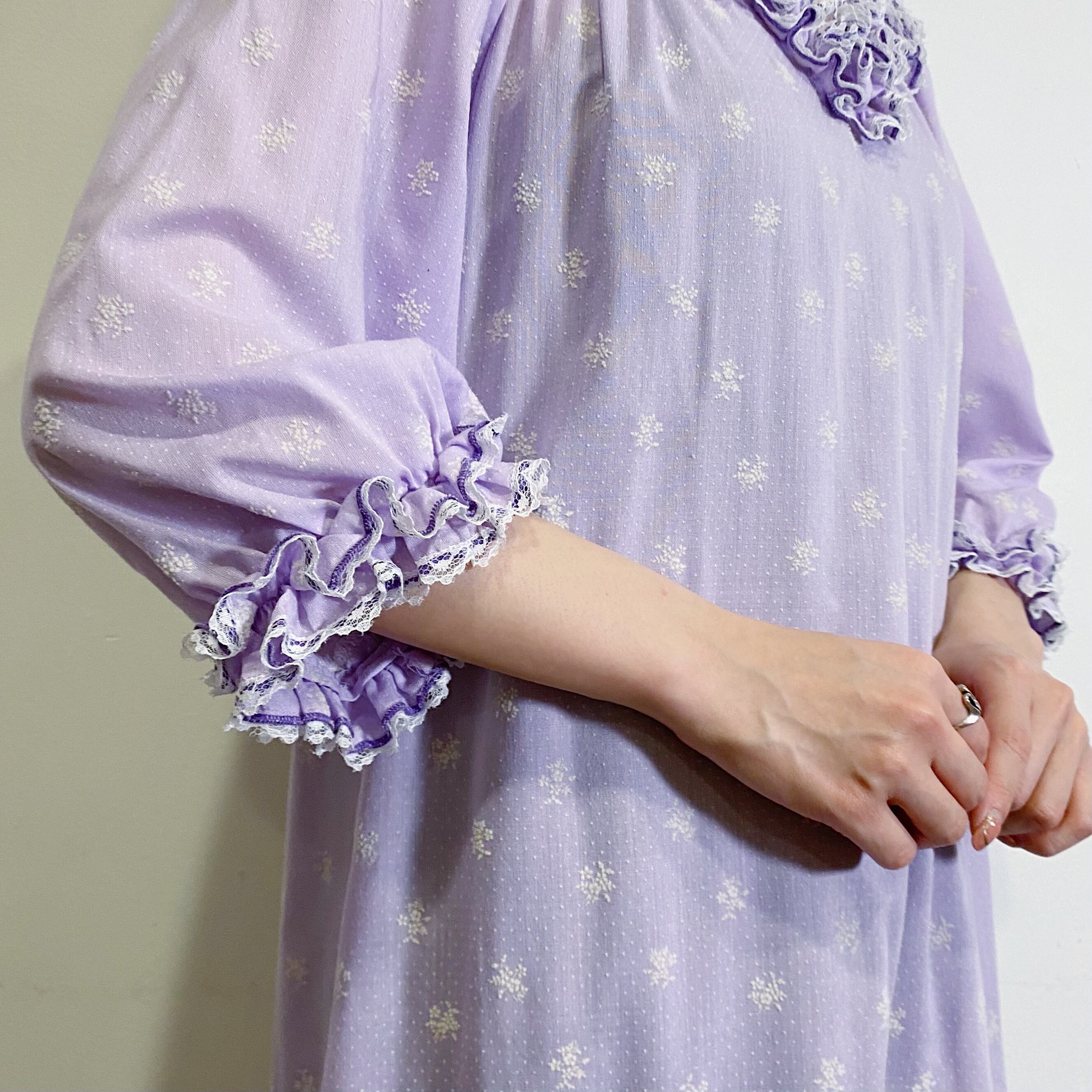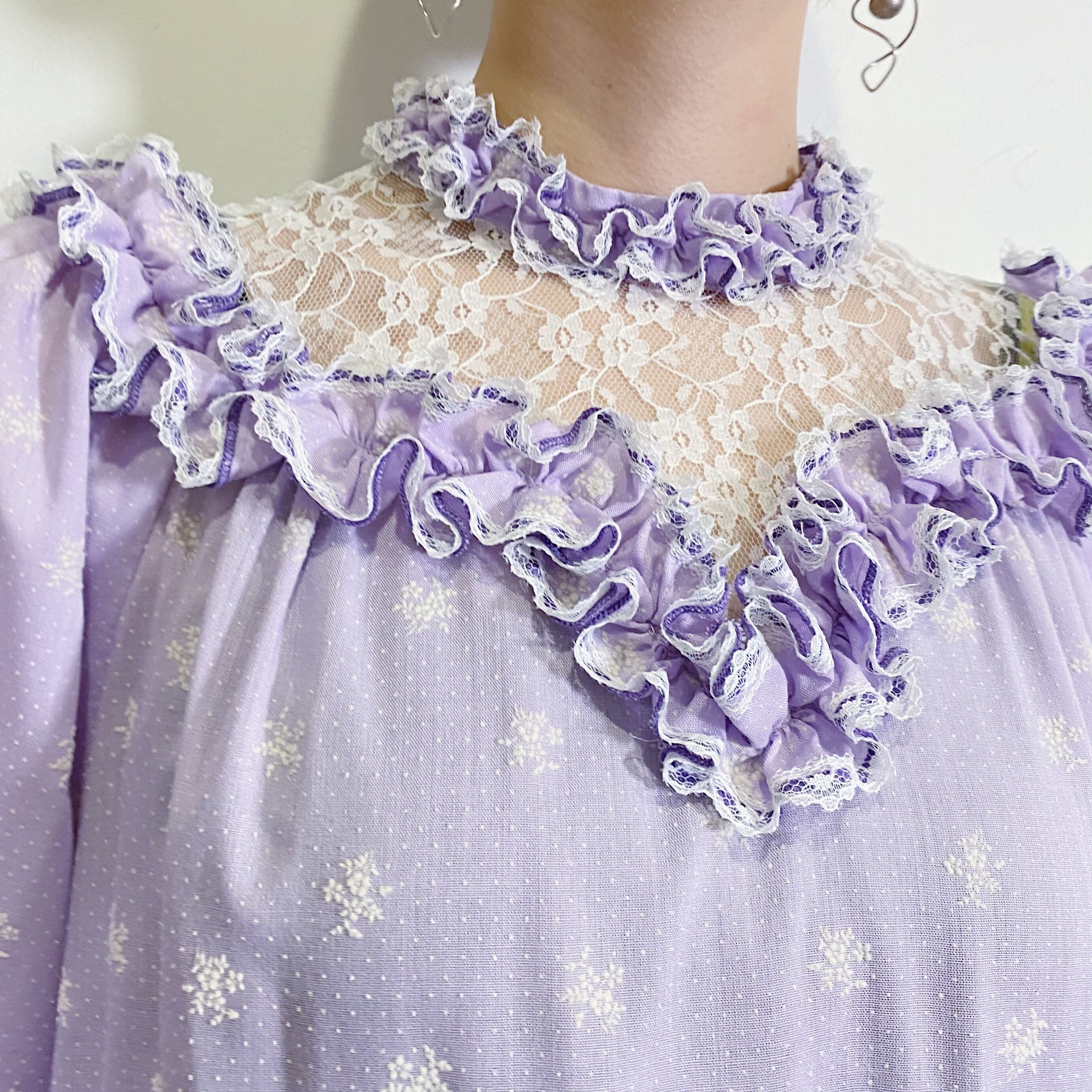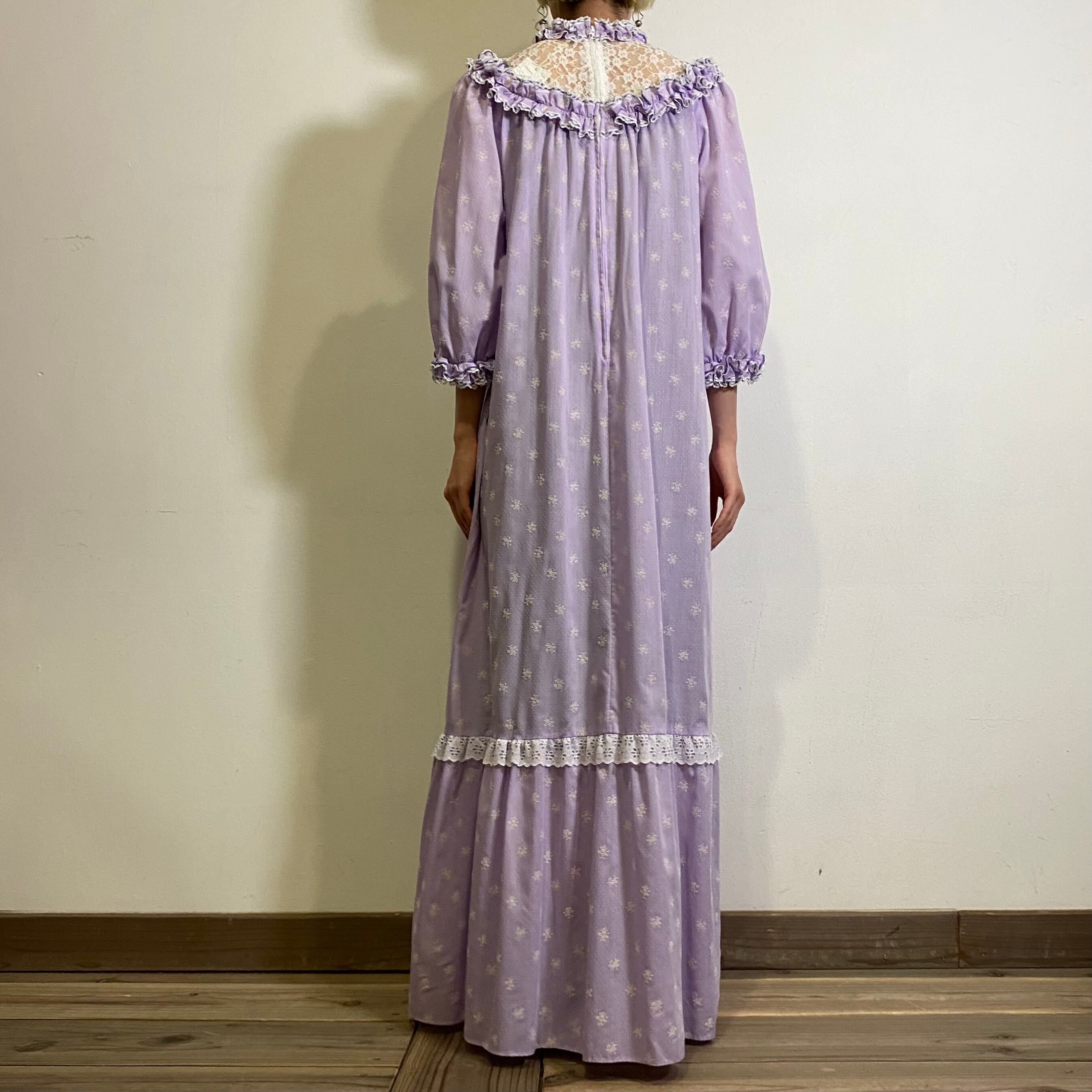 ラベンダーカラーとレースの組み合わせがとってもキュートな、70年代後期のロングドレスです。