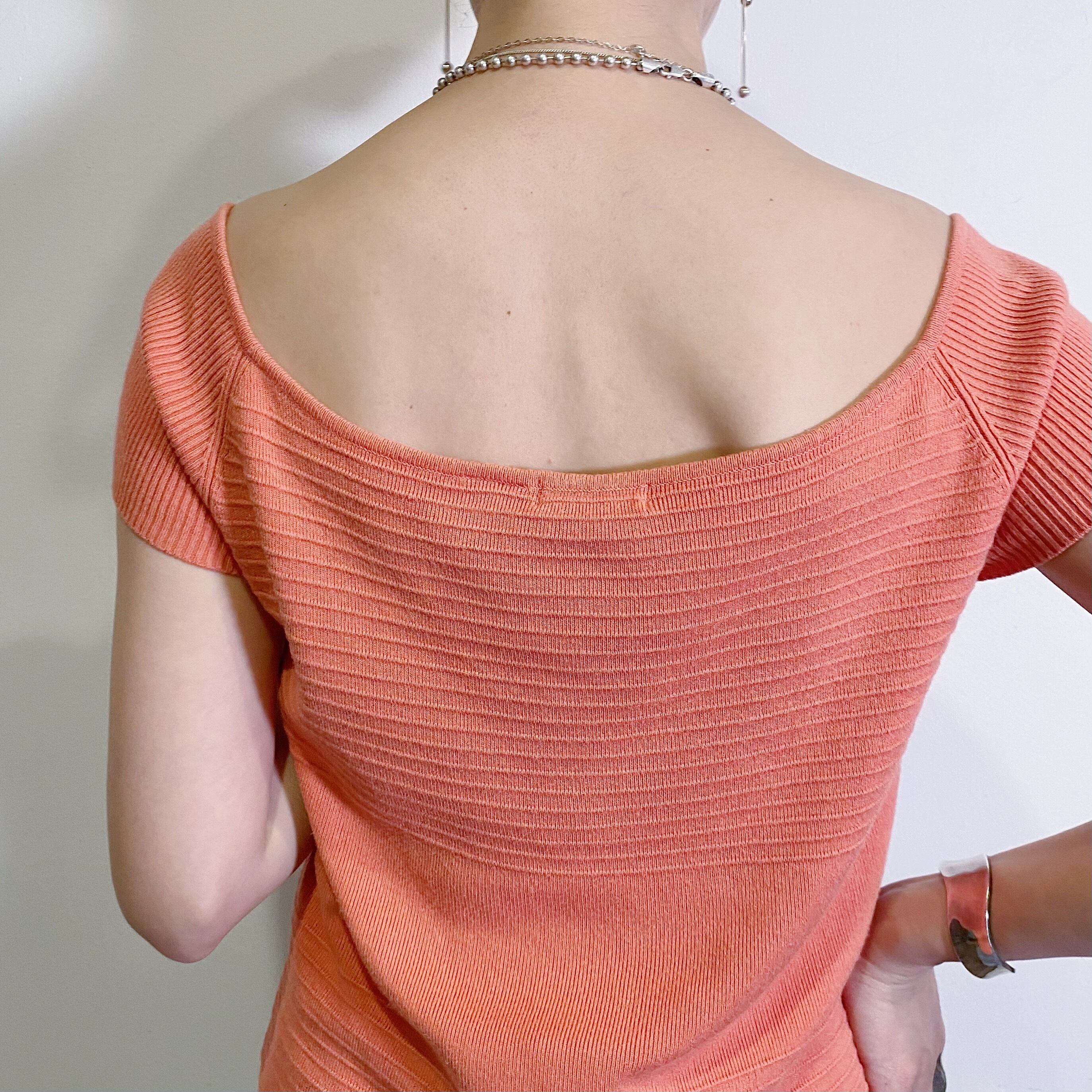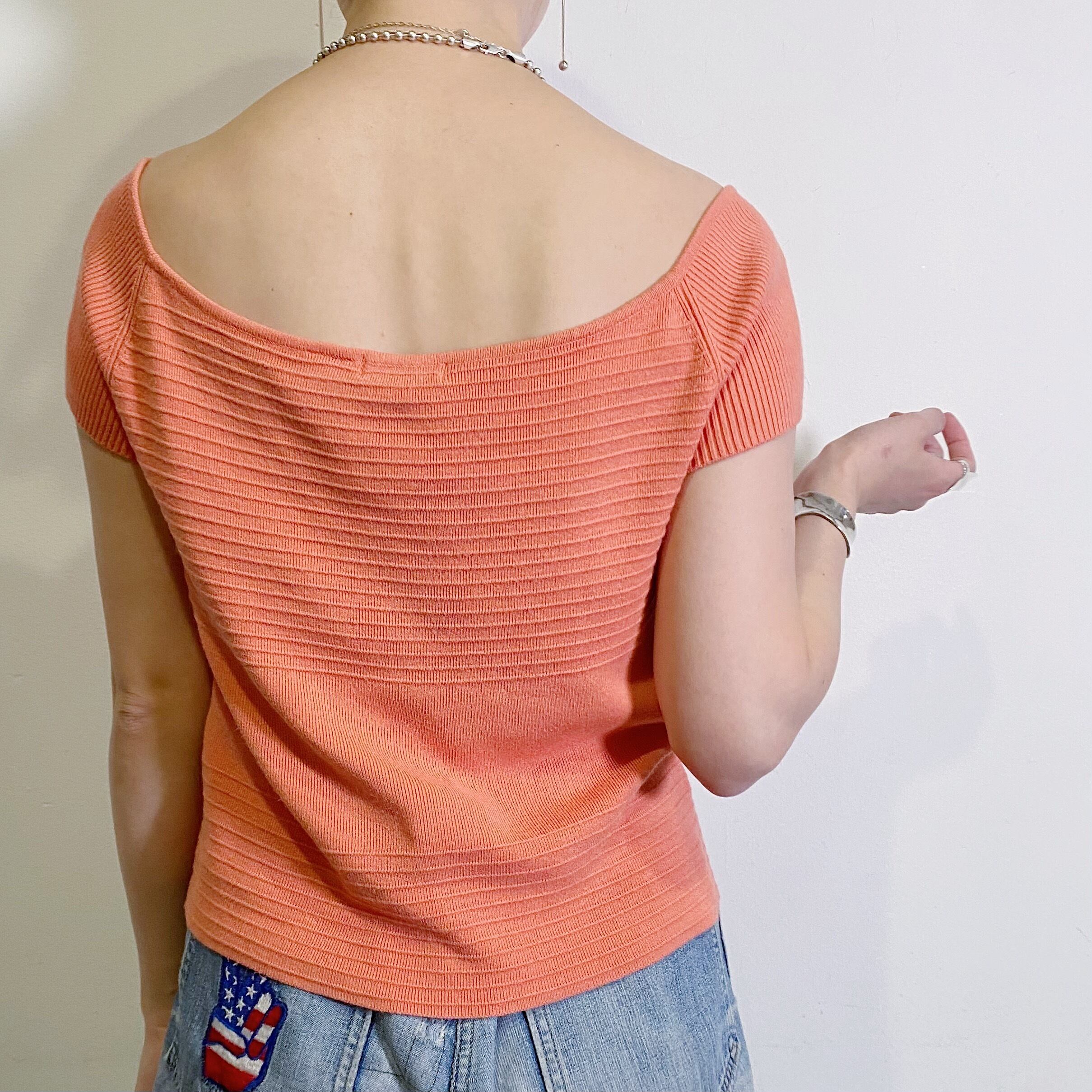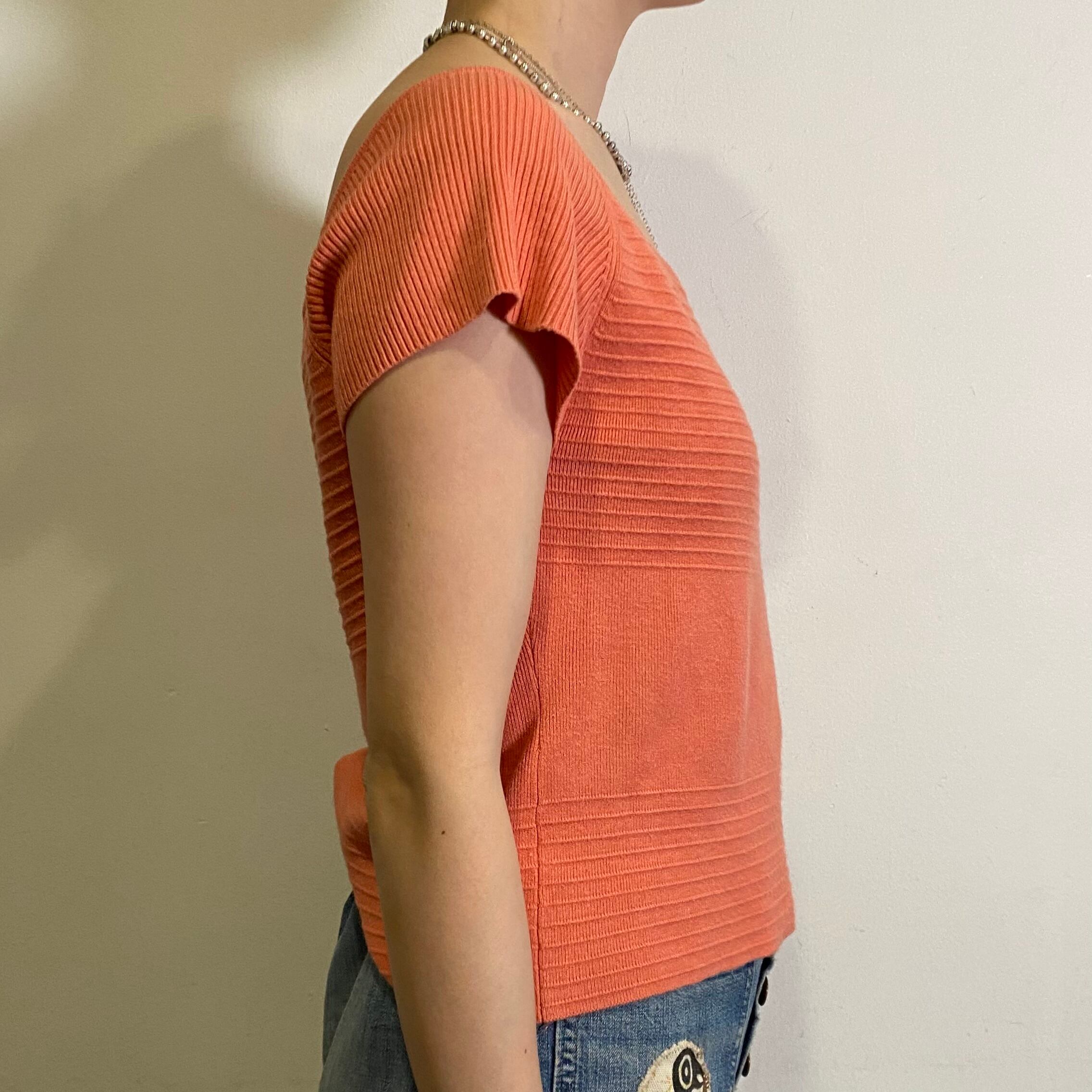 サーモンピンクのような色合いが可愛い、半袖トップスです。