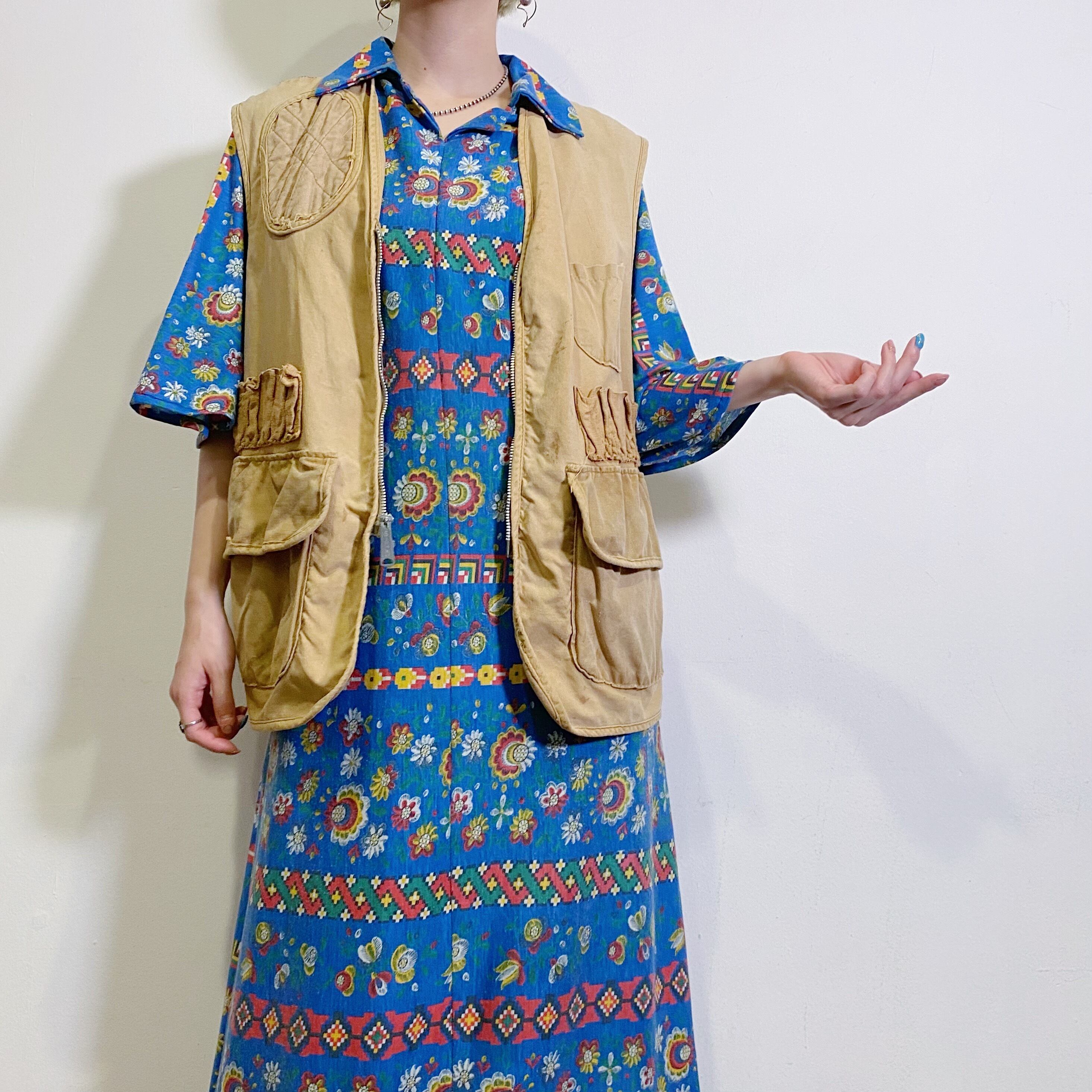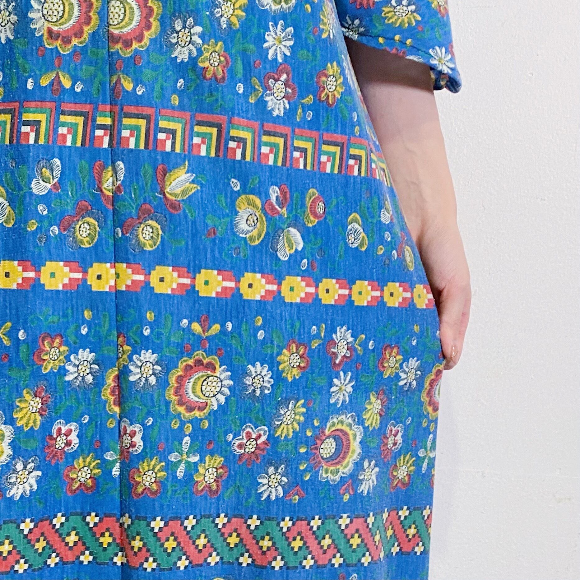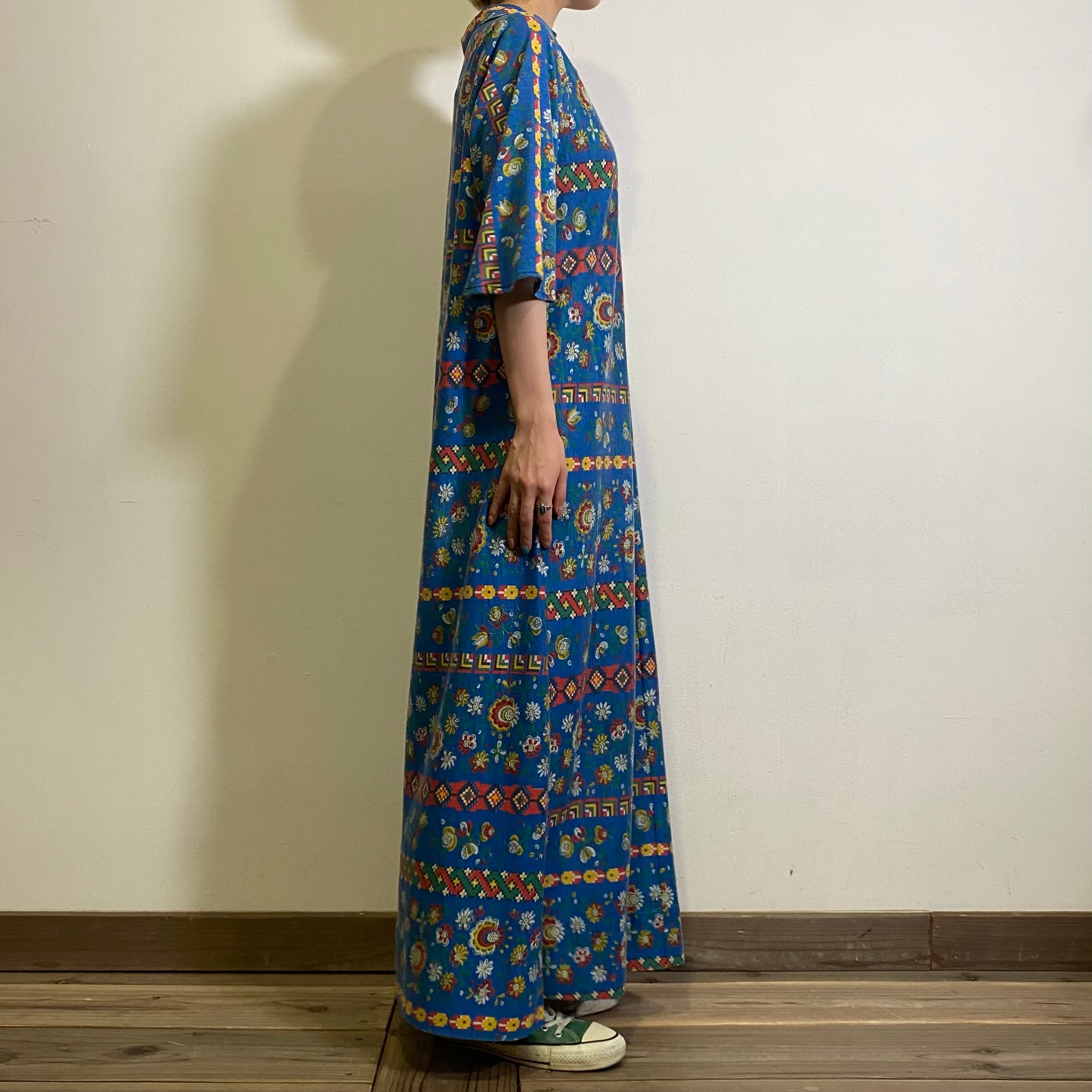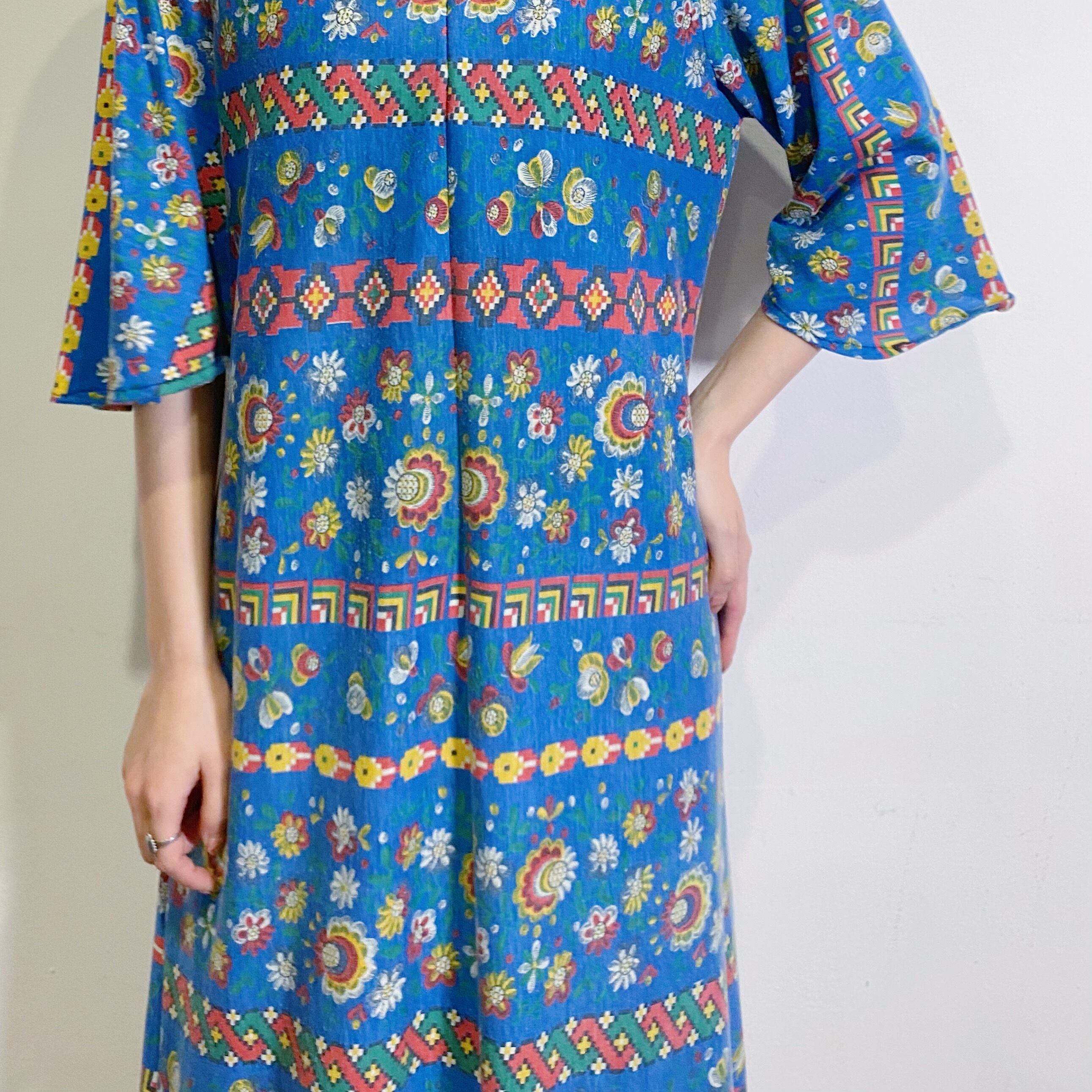 鮮やかなブルーベースに赤や黄色の花柄が可愛い、70年代のワンピースです。