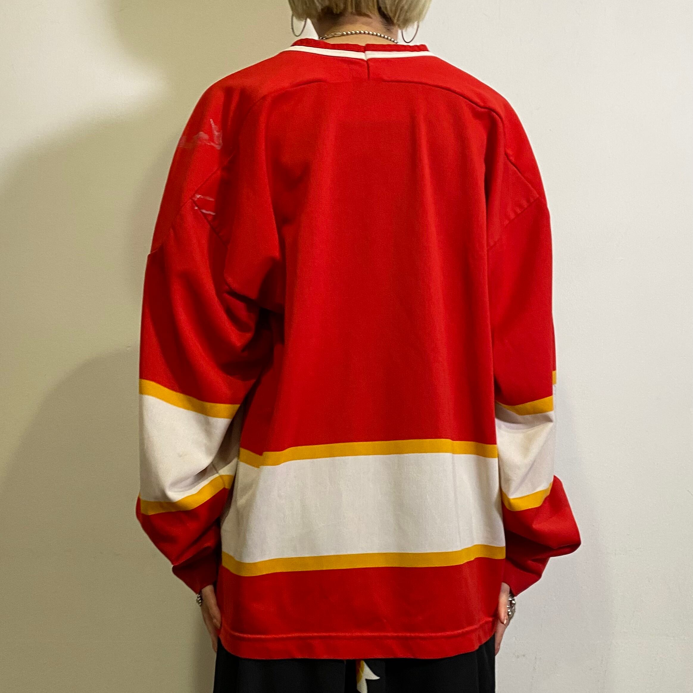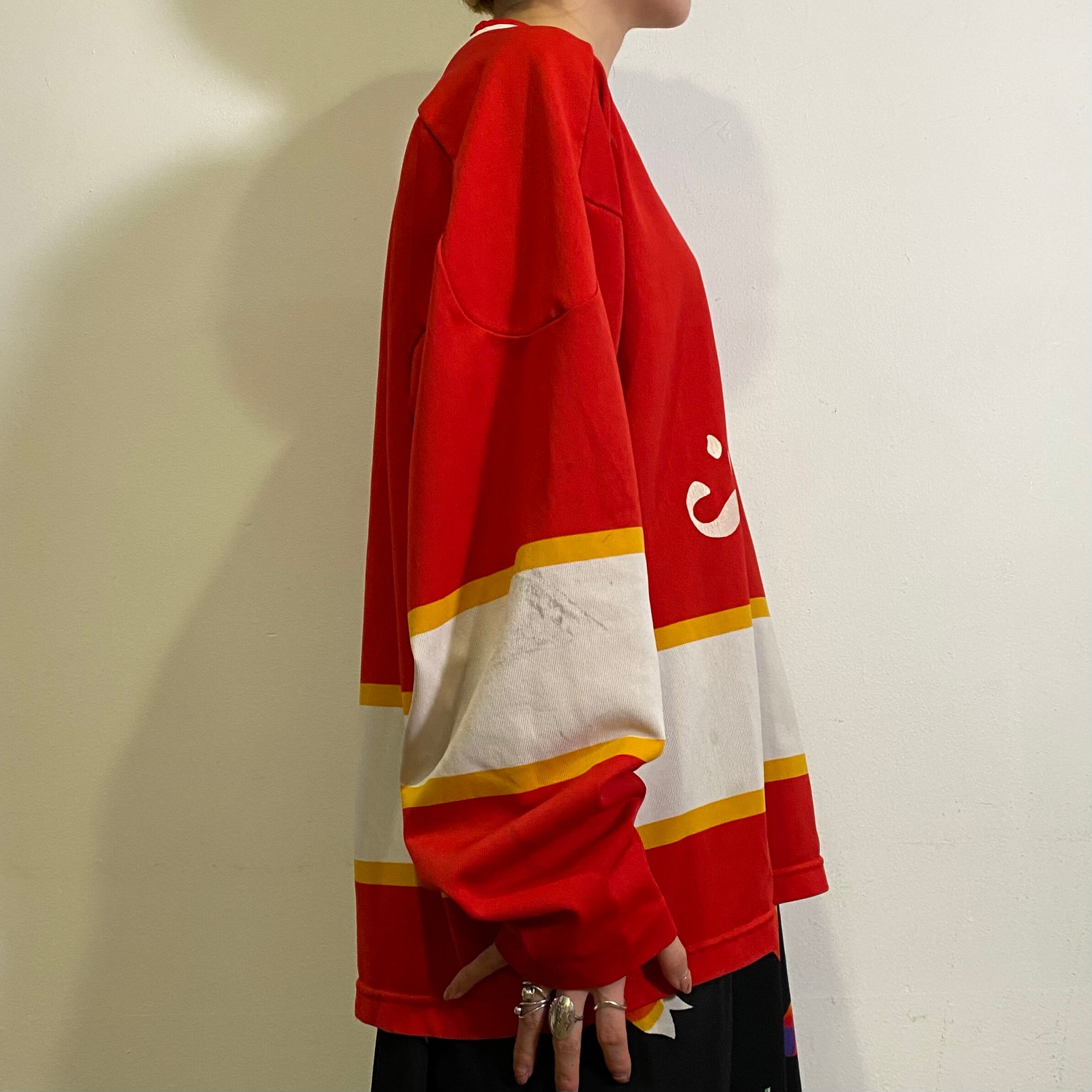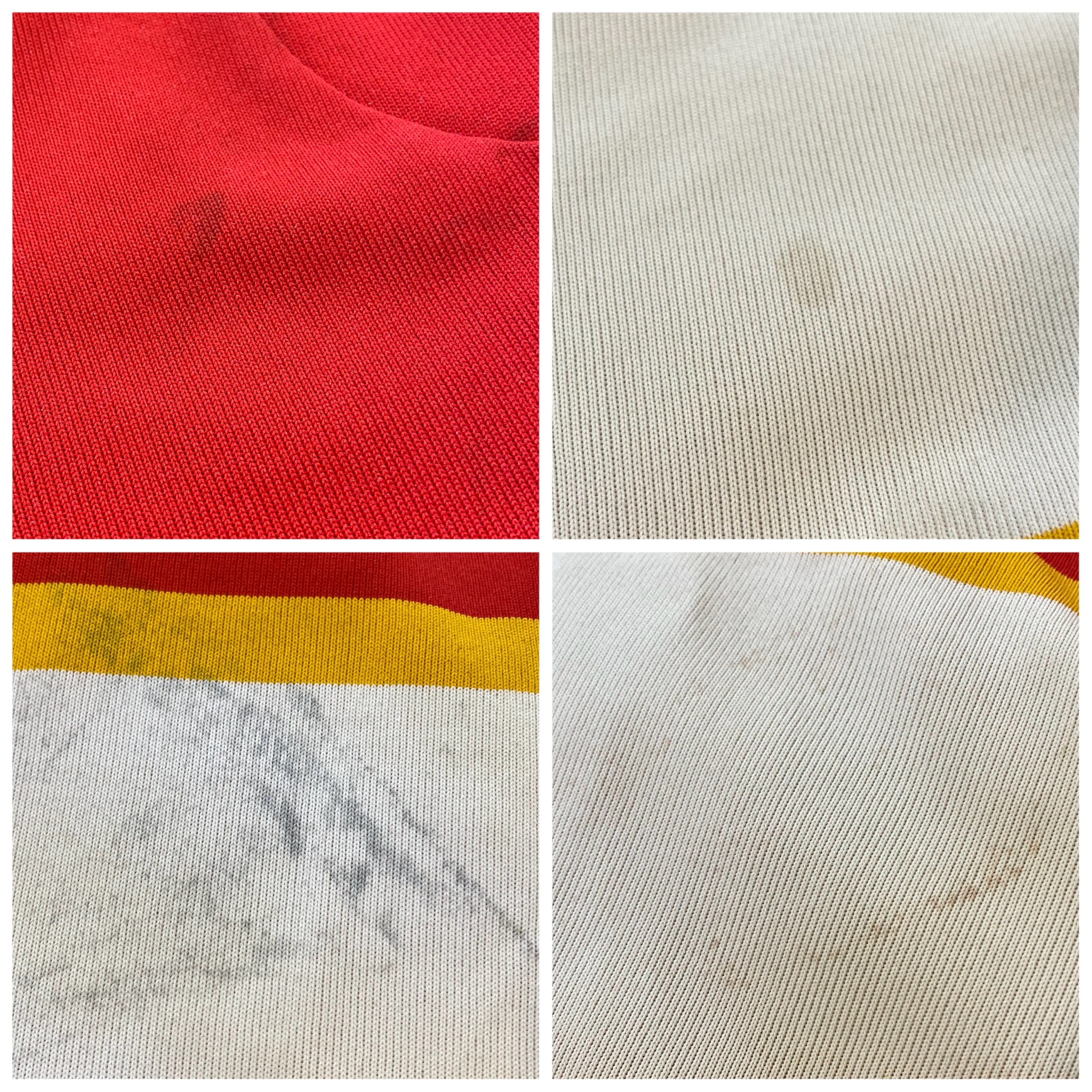 赤ベースに白いロゴや黄色のラインが可愛い、80年代のフットボールTシャツです。