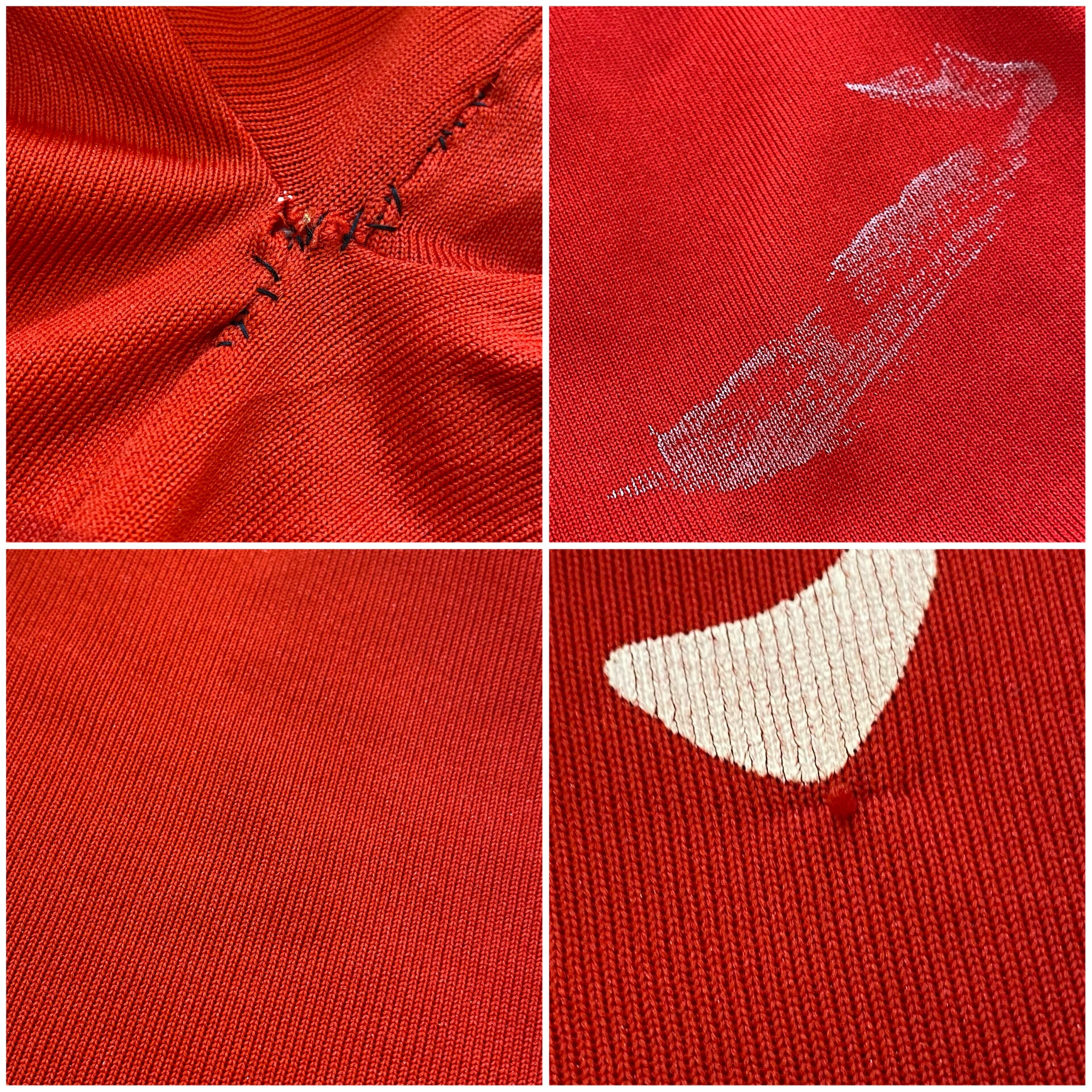 恐らく前の所有者によってホツレをお直しした跡が見受けられるほか、プリントのひび割れ、ヨゴレ・シミ・ツレ等広範囲にダメージがございます。