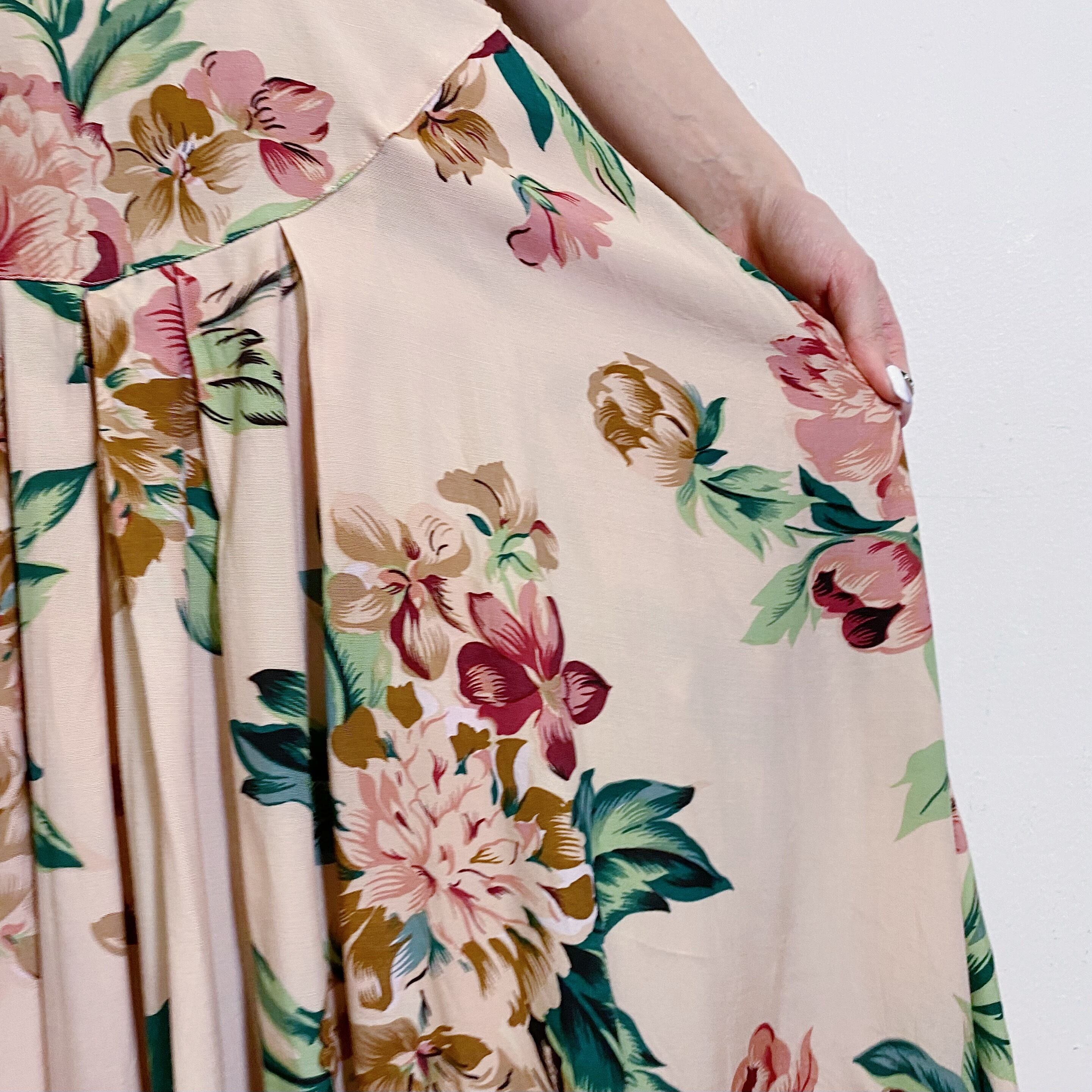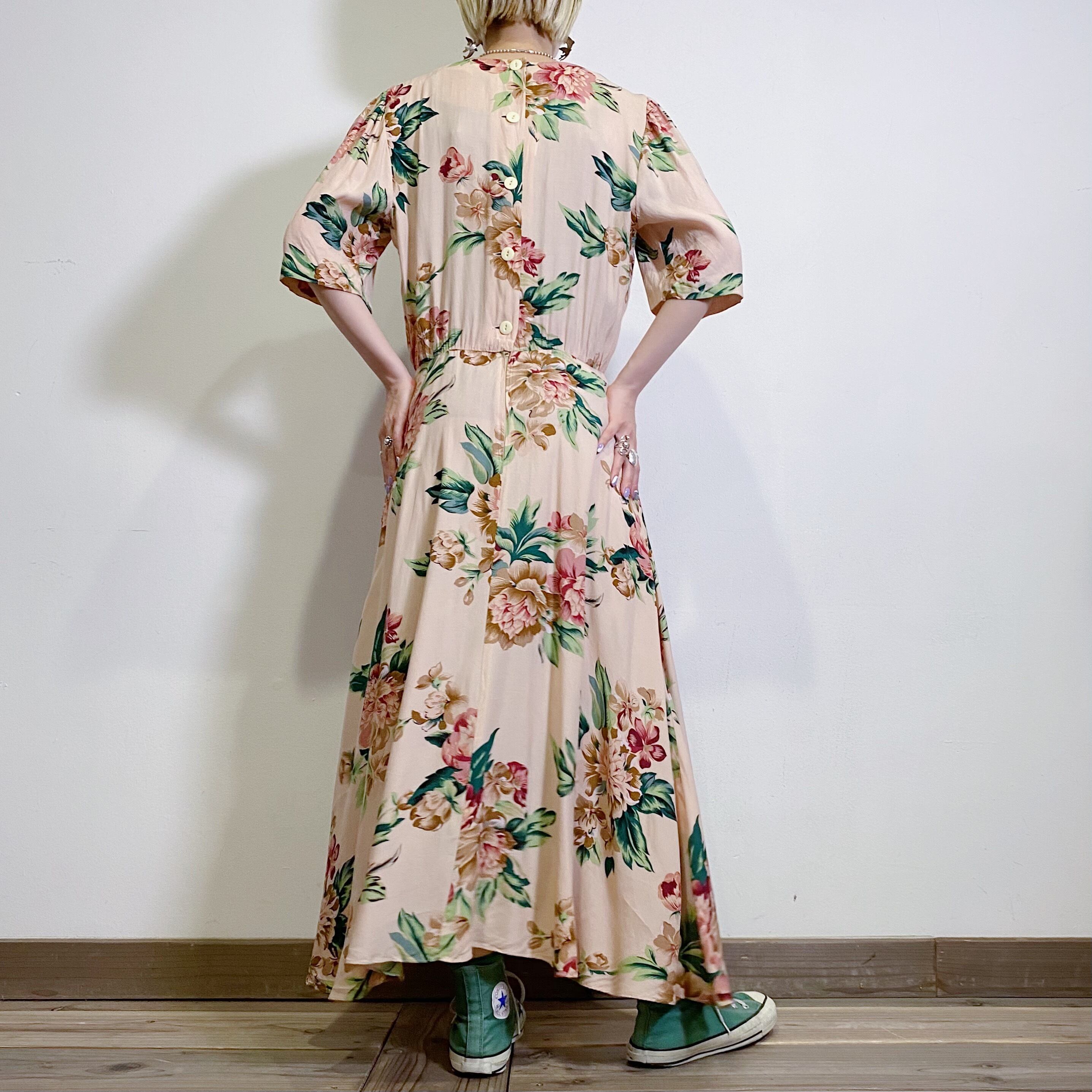 淡いベビーピンクカラーにピンクの大きなお花柄が大人可愛い、80年代のワンピースです。