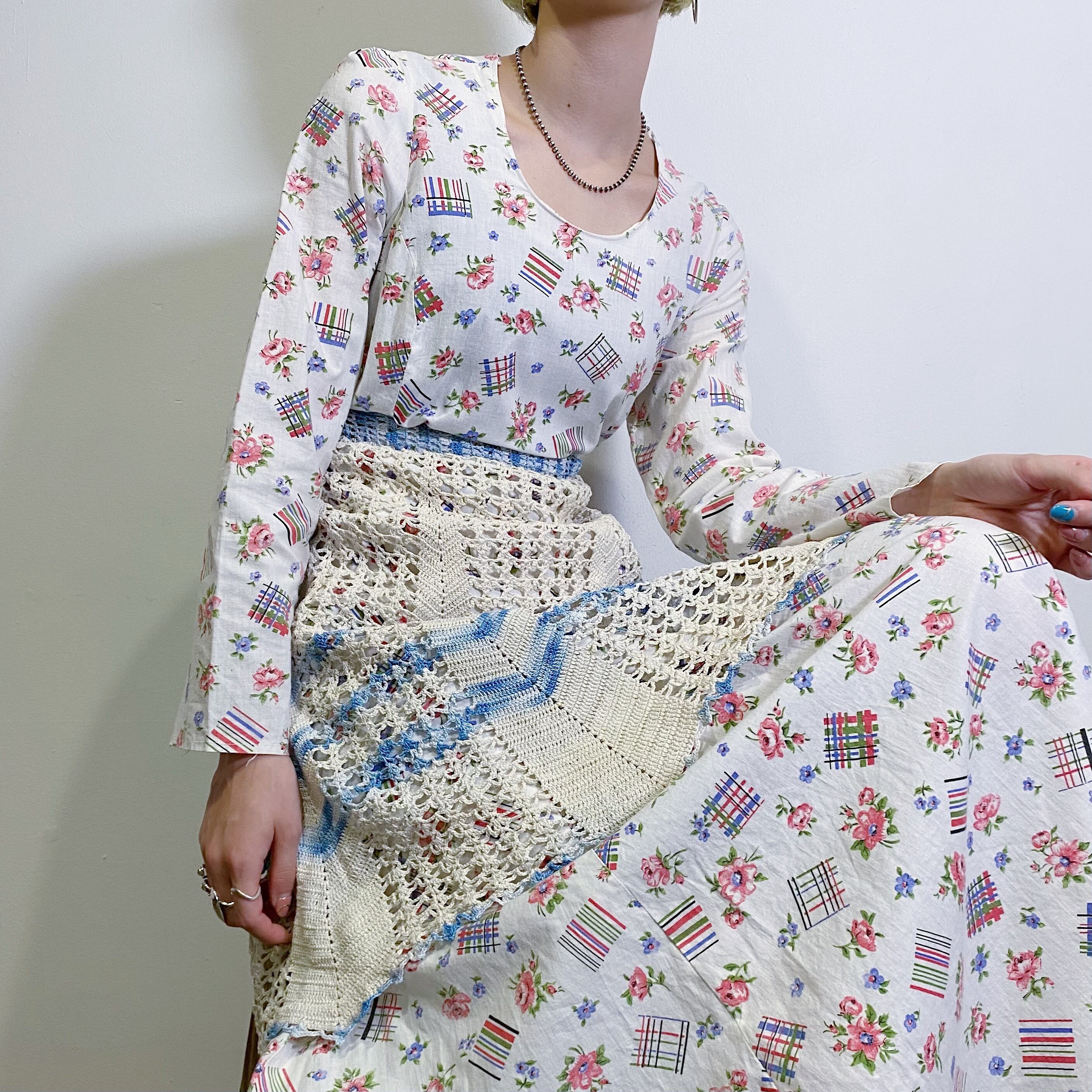 お花やチェックのような総柄がキュートな、70年代のワンピースです。