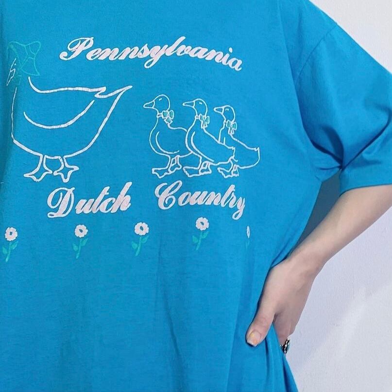 鮮やかなターコイズブルーが目を惹く、80年代のTシャツです。