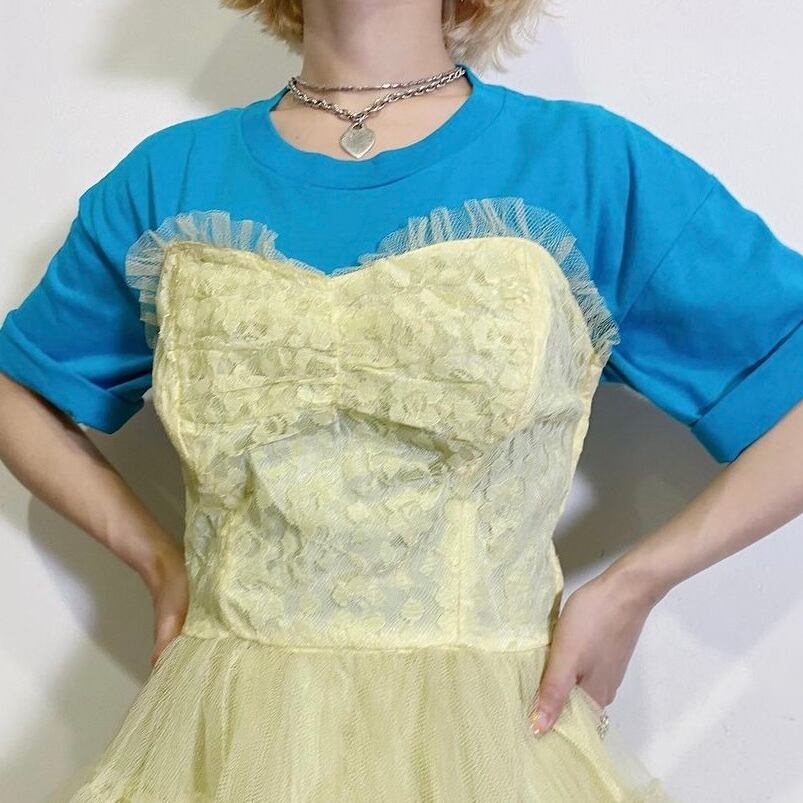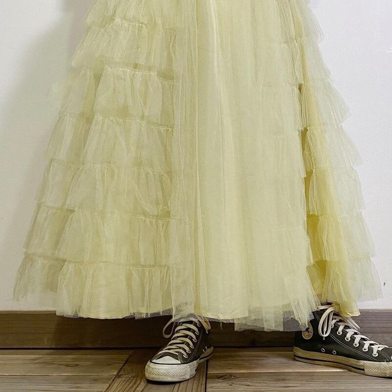 ハッピーなイエローカラーに上半身には花模様のレース、サイドにはチュールが段々になったデザインがとってもキュート。