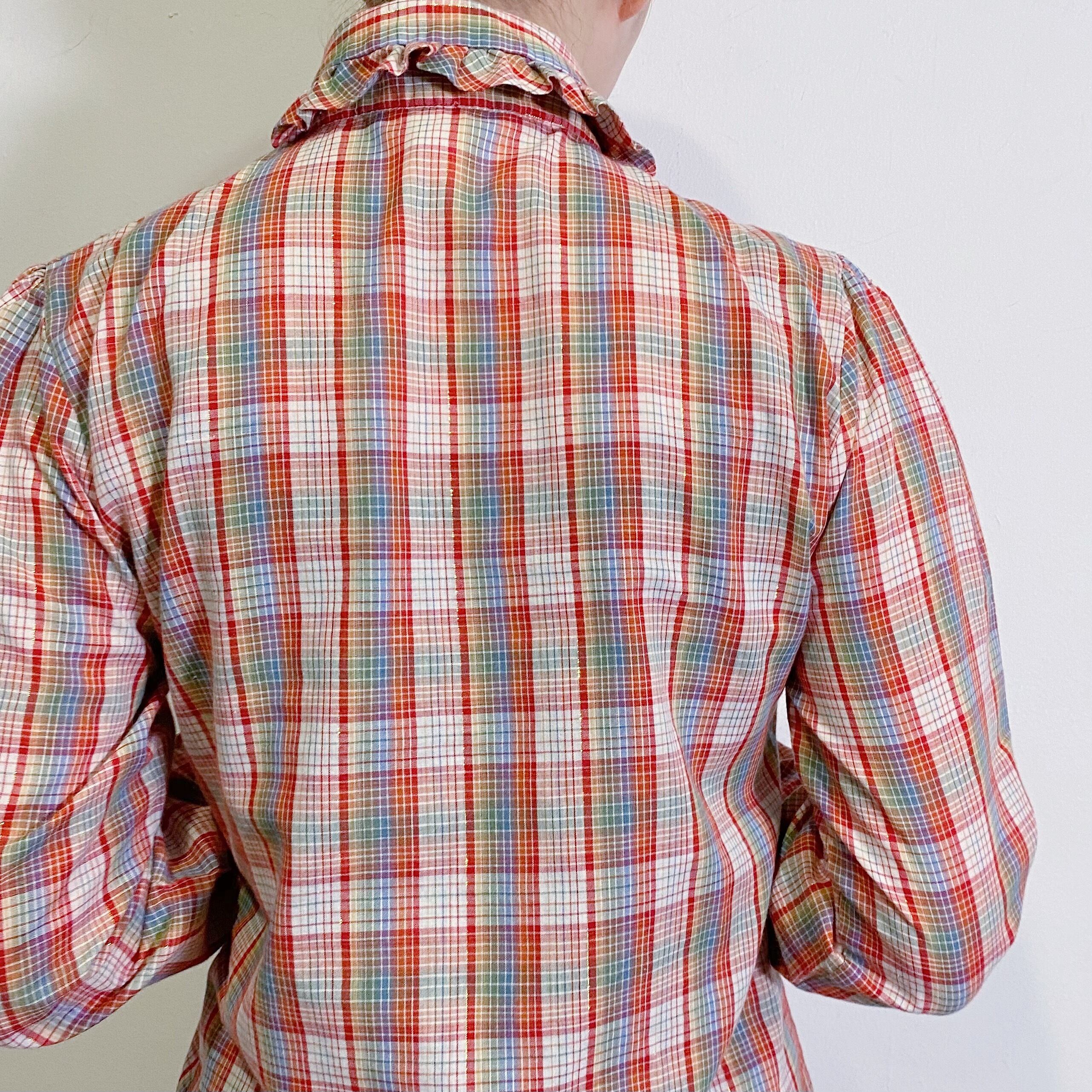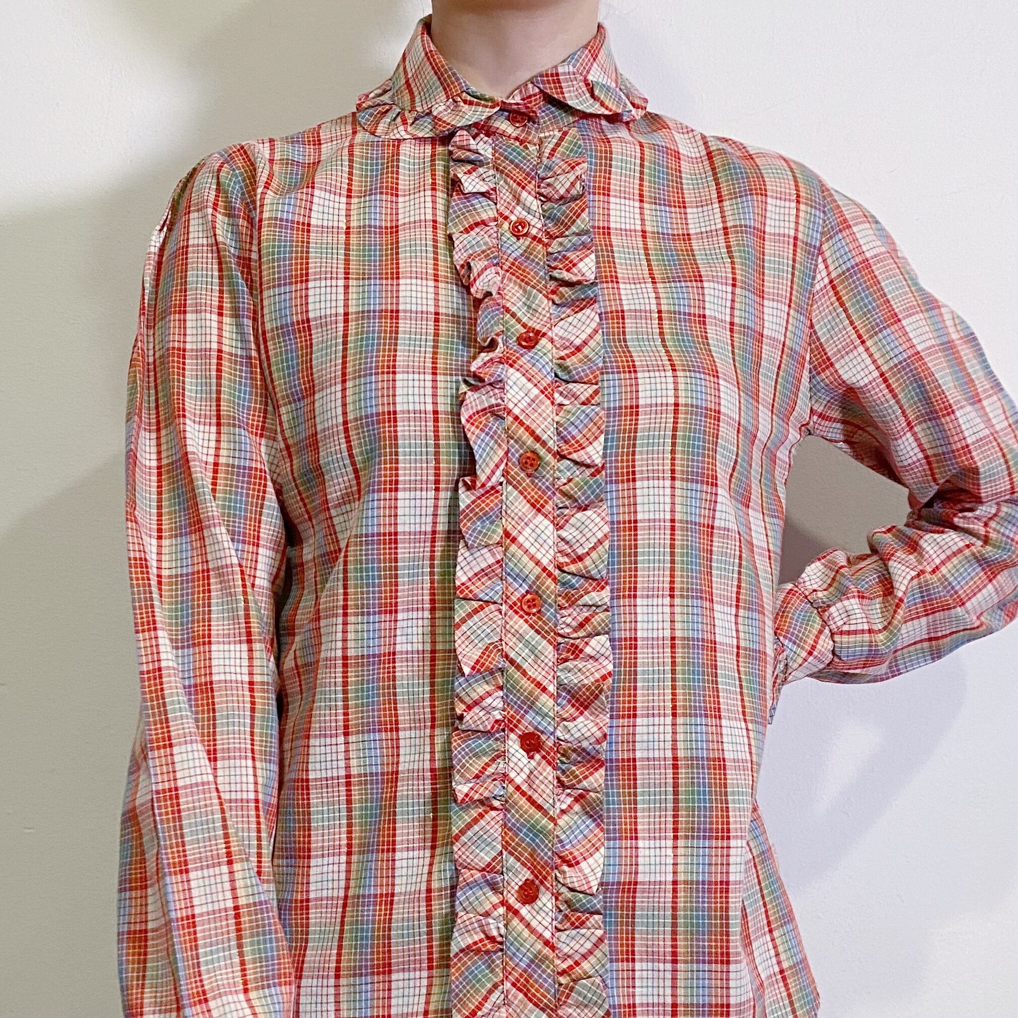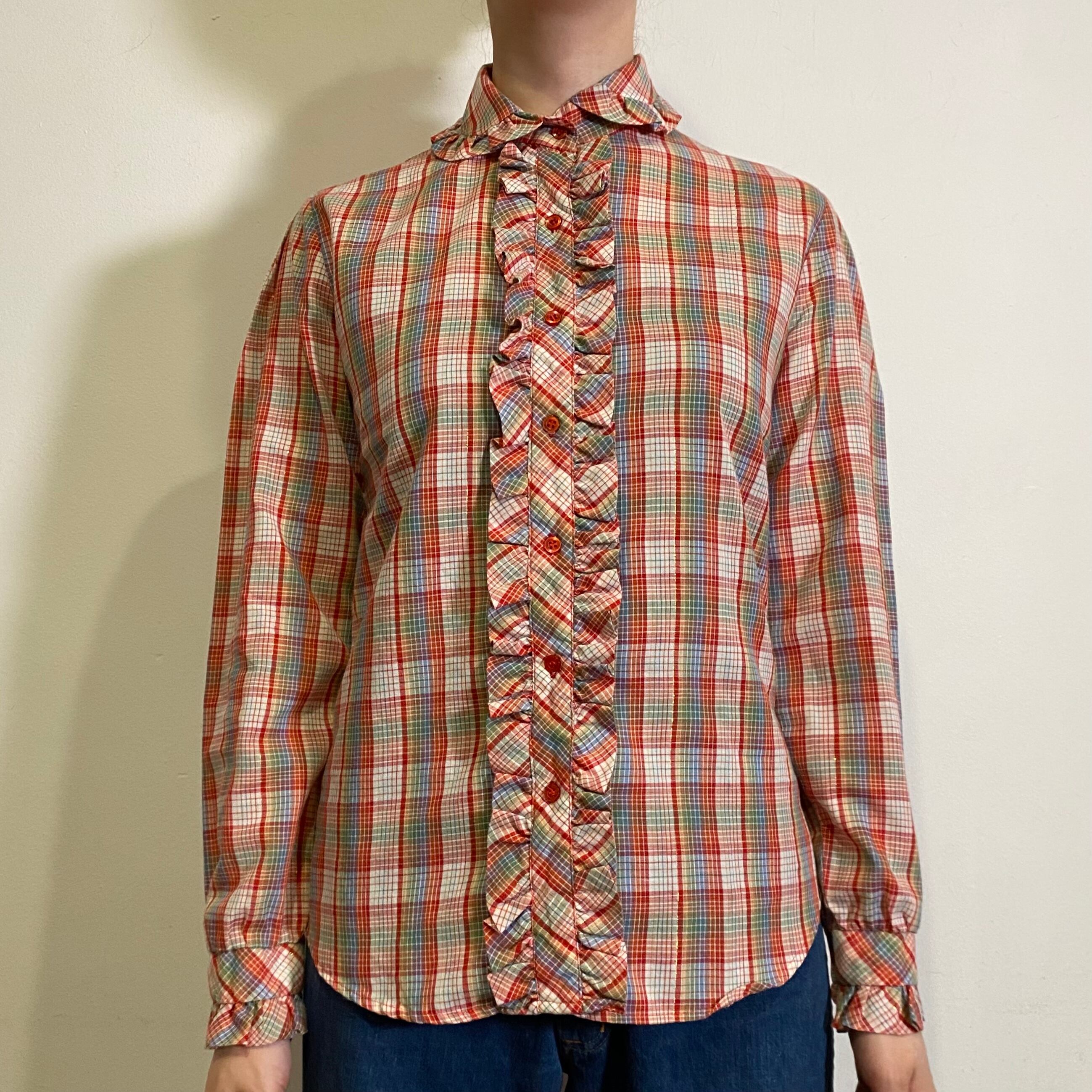 フロントや襟、袖口のフリルが可愛い、70年代のチェックシャツです。
