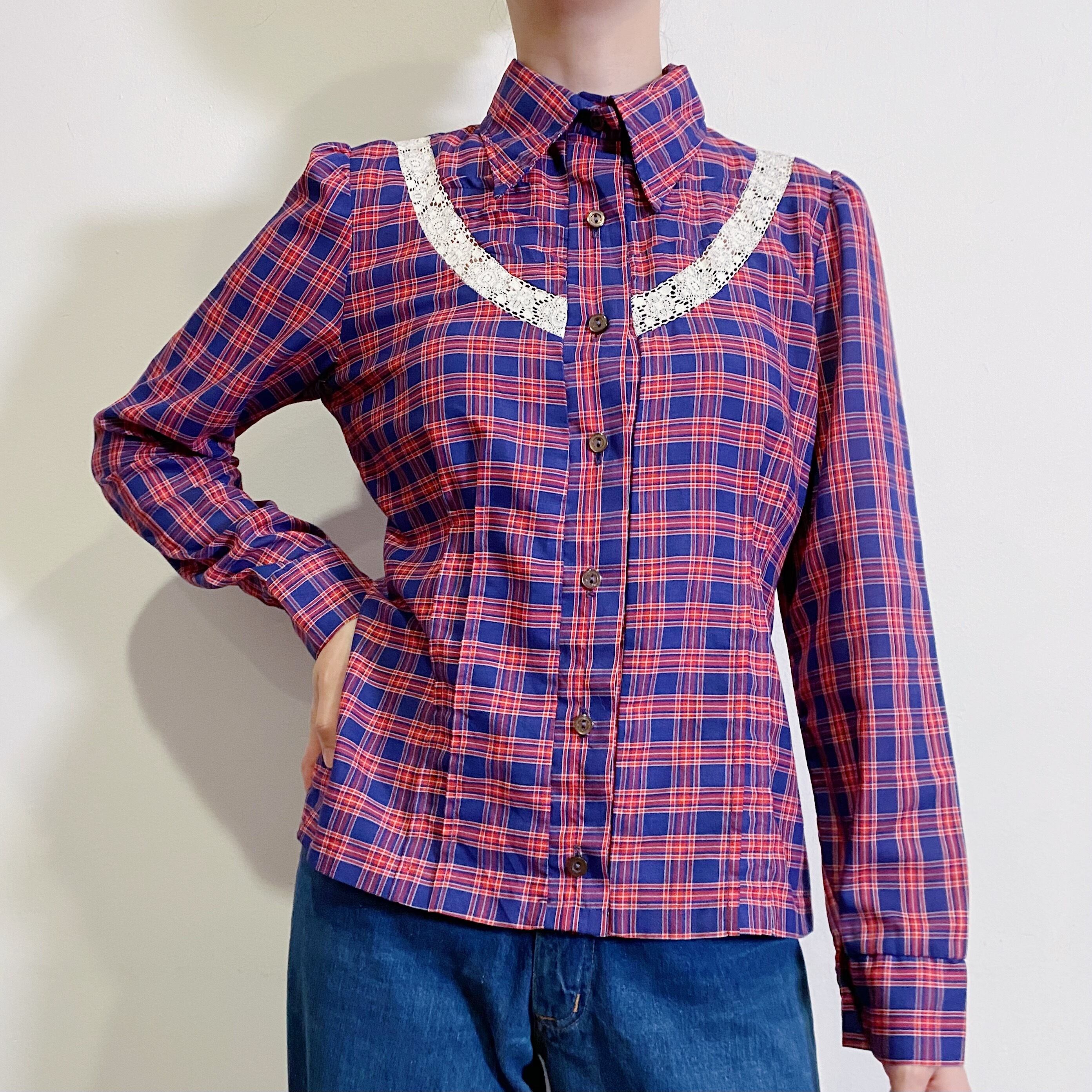 胸のレースと赤と青のチェックが可愛い70年代のシャツです。