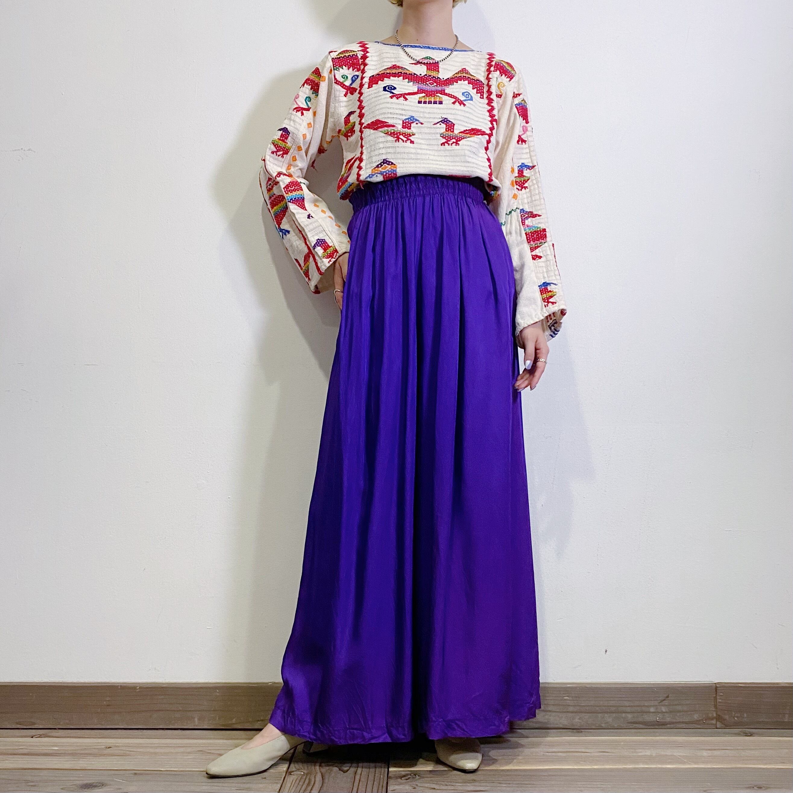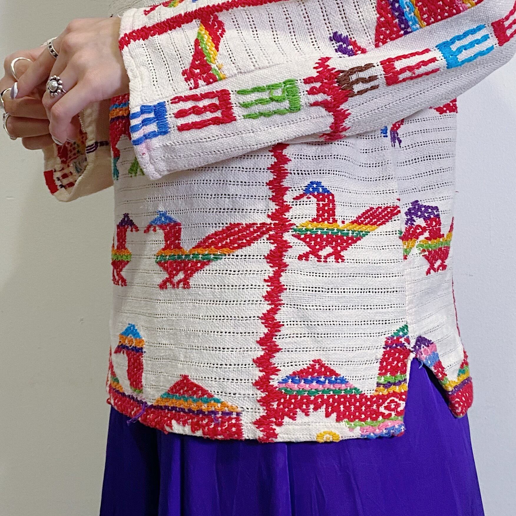 袖にまでびっしりとカラフルな鳥の手刺繡が施された、長袖のチュニックトップです。