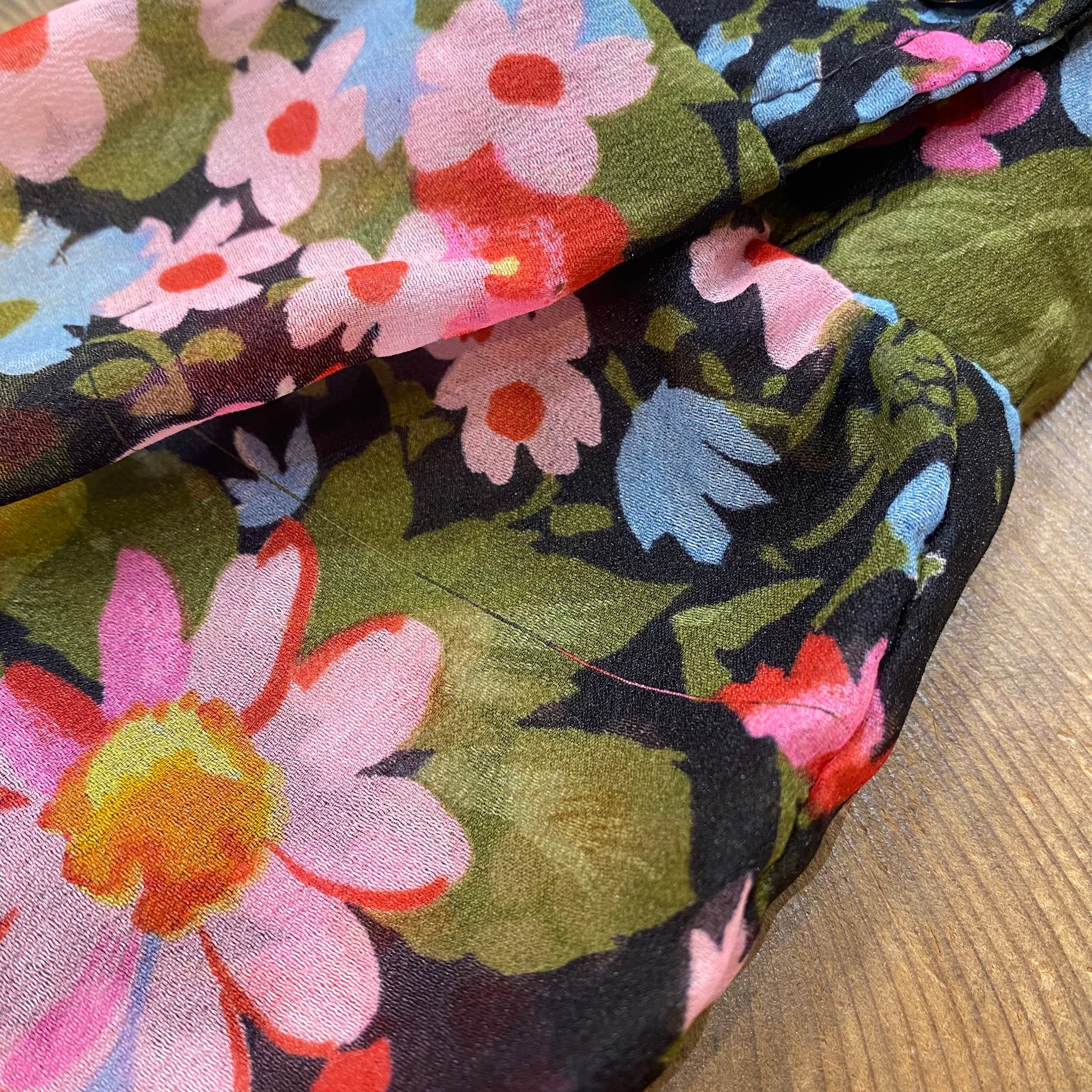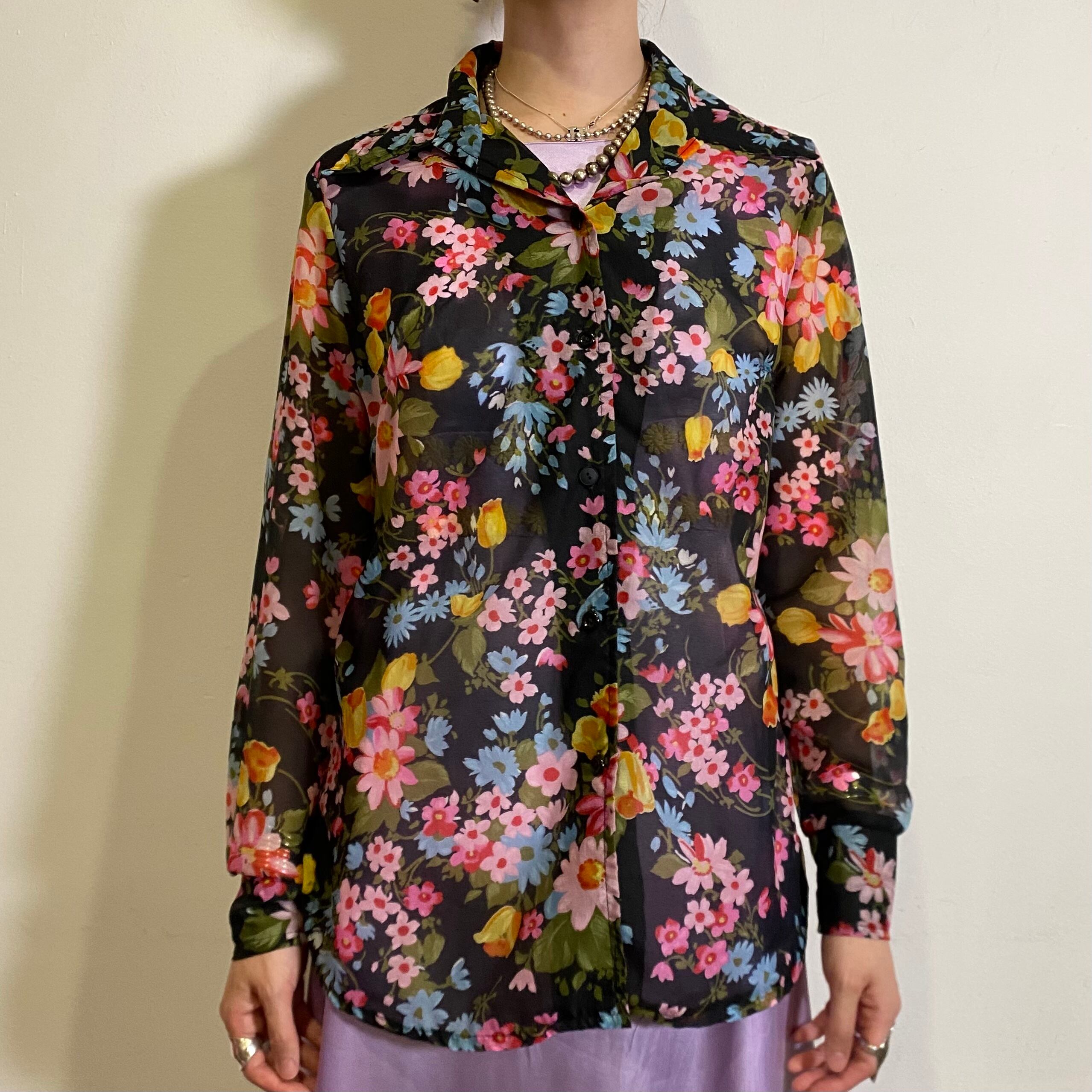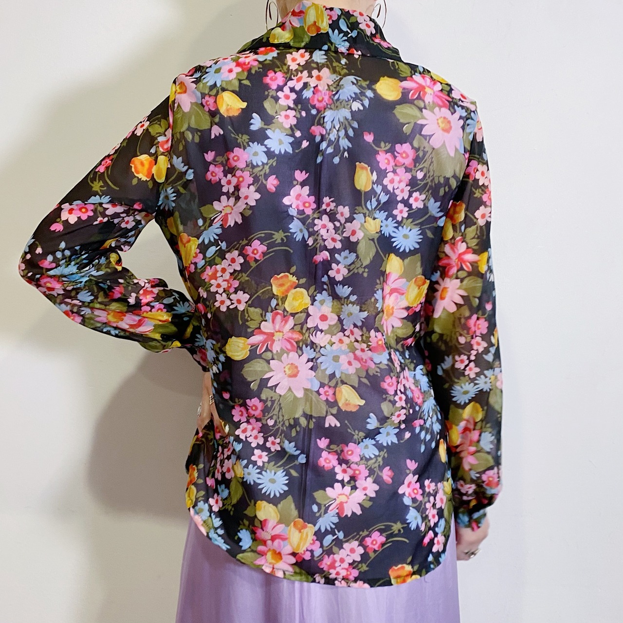 ブラックベースにカラフルなお花のプリントが可愛い、70年代の長袖シャツです。