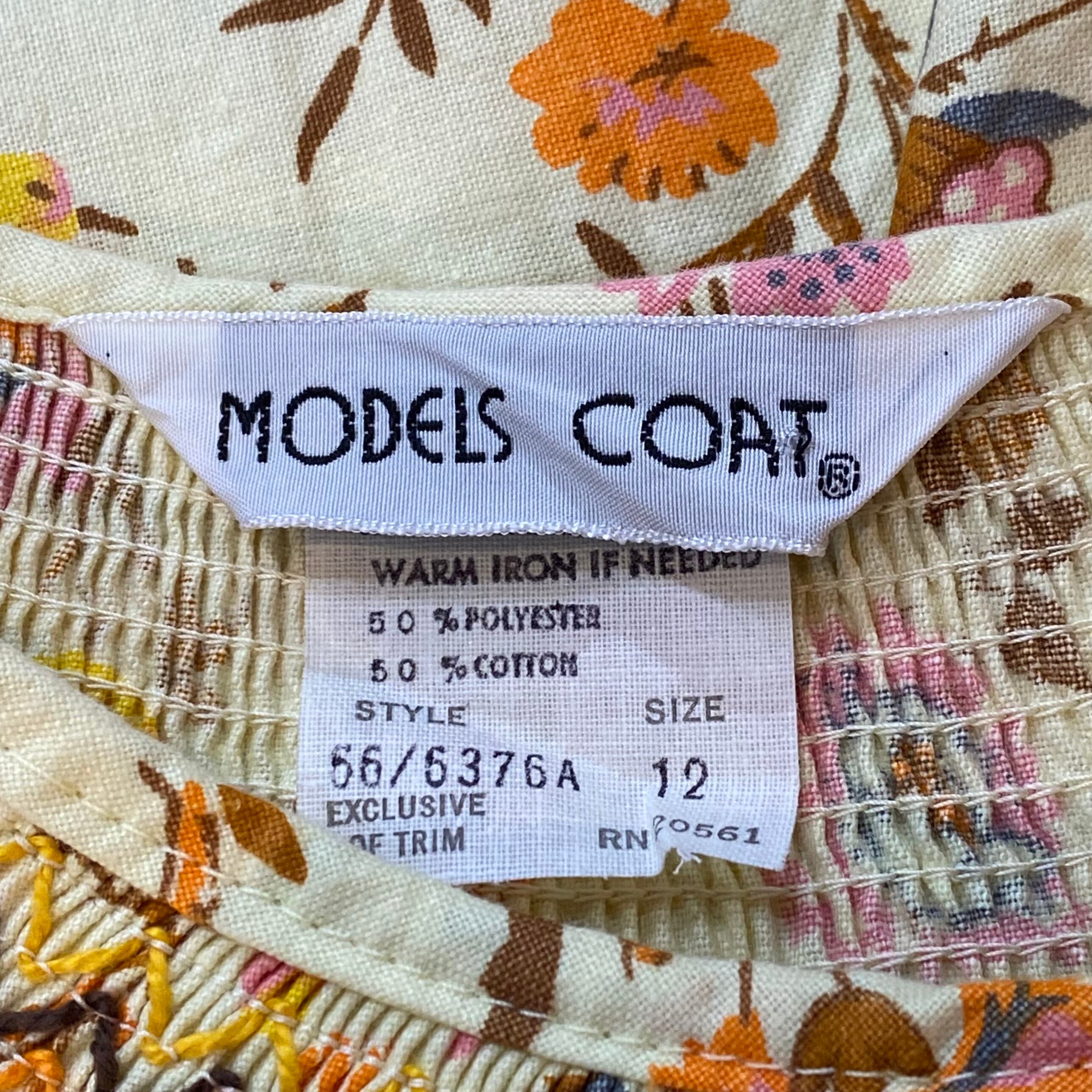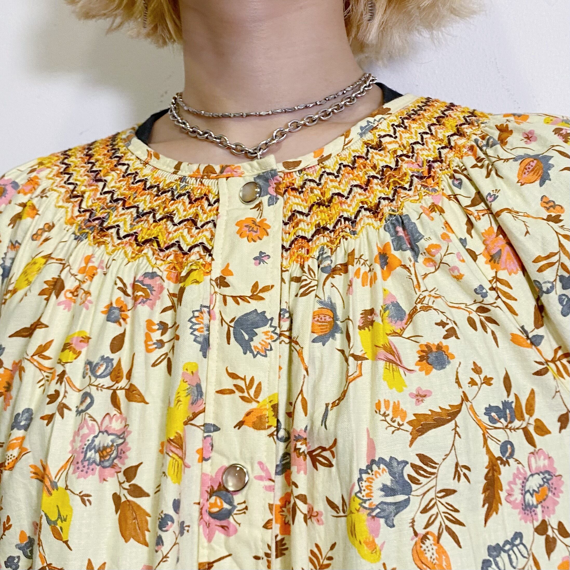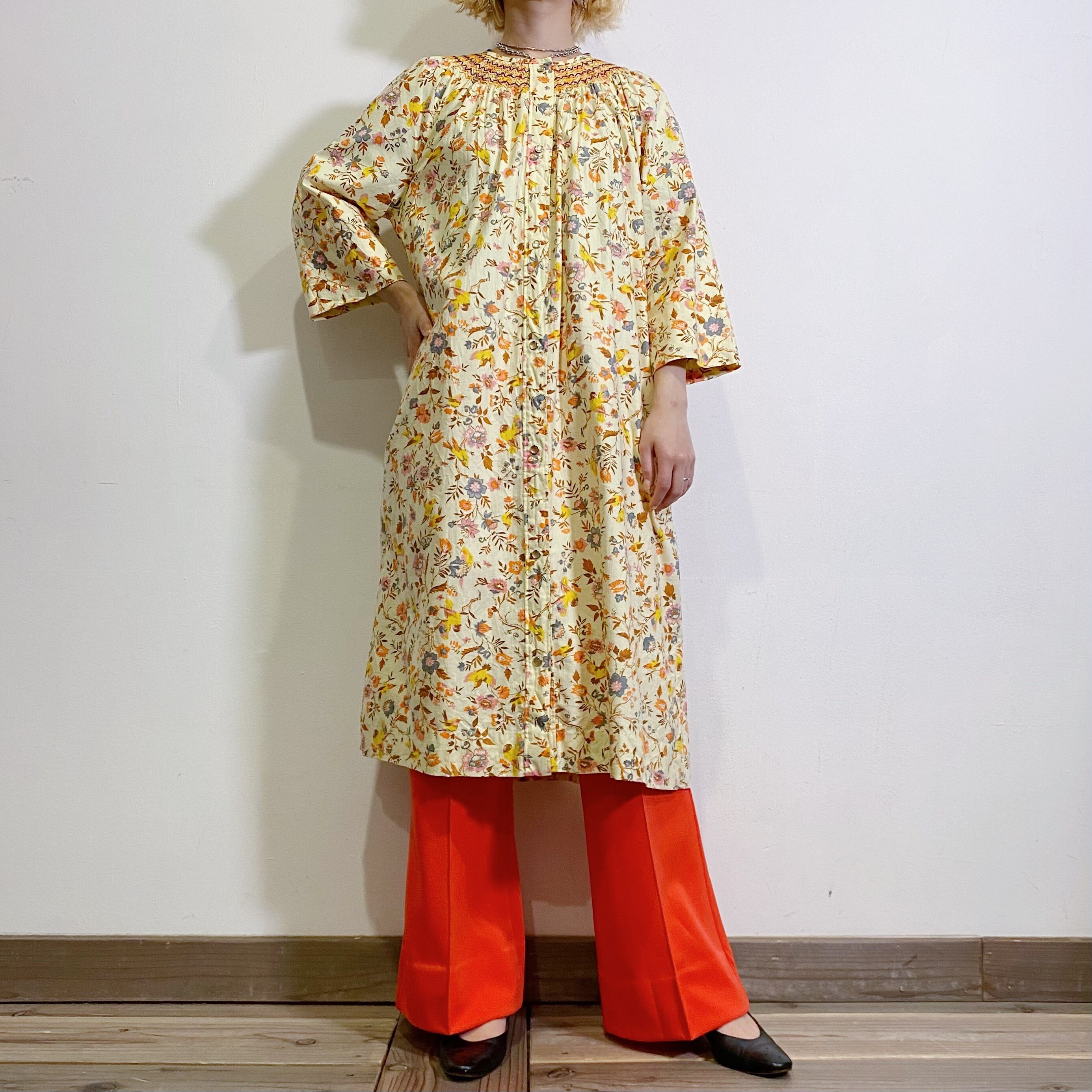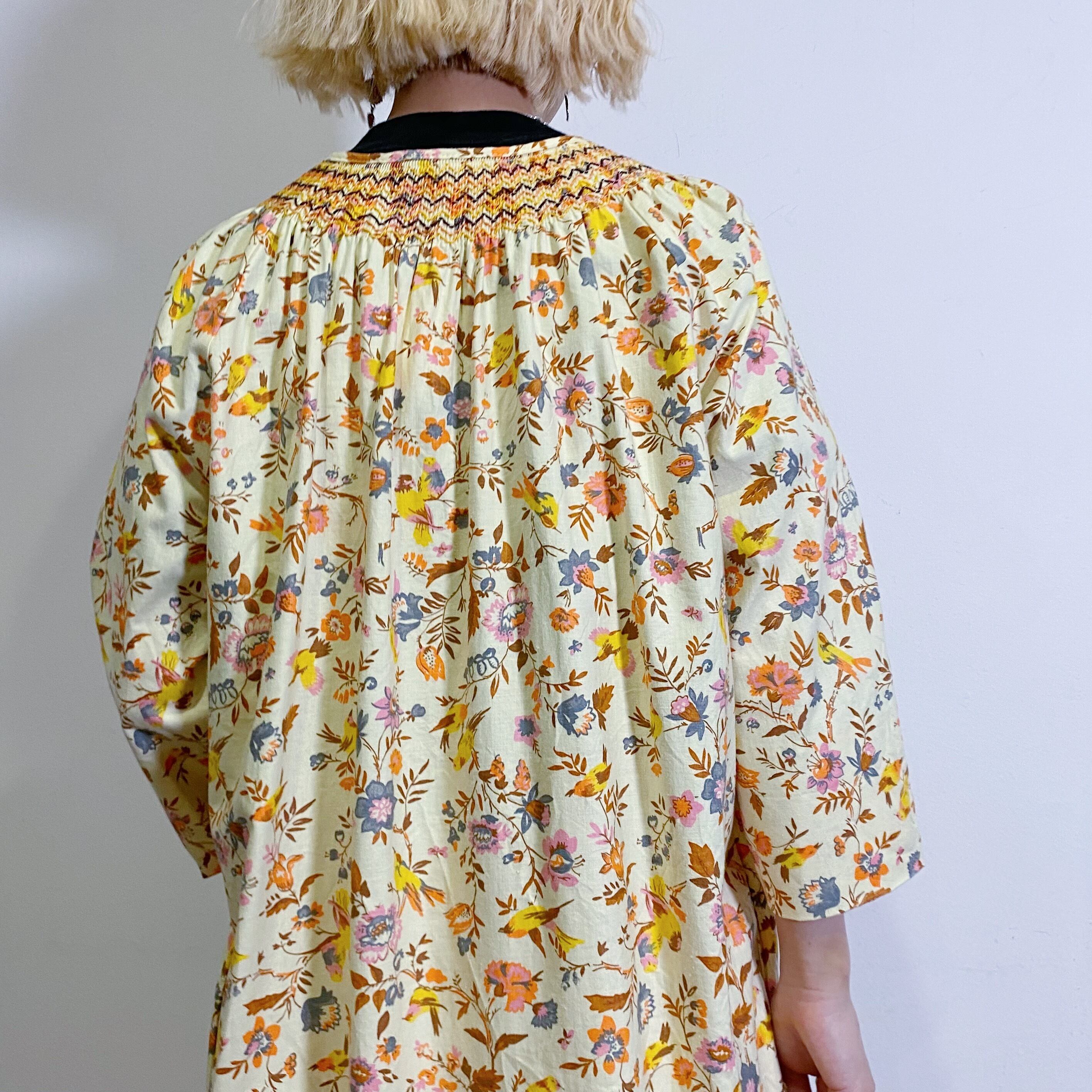 ハッピーなイエローカラーに鳥やお花のプリントが可愛い、70年代のコットン素材のガウンです。