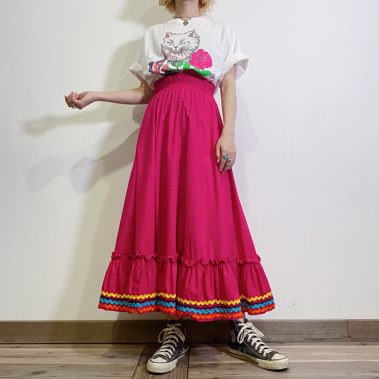 白ベースで着こなしやすく、柄スカートなどとも相性良く着こなせるのが嬉しいですね。