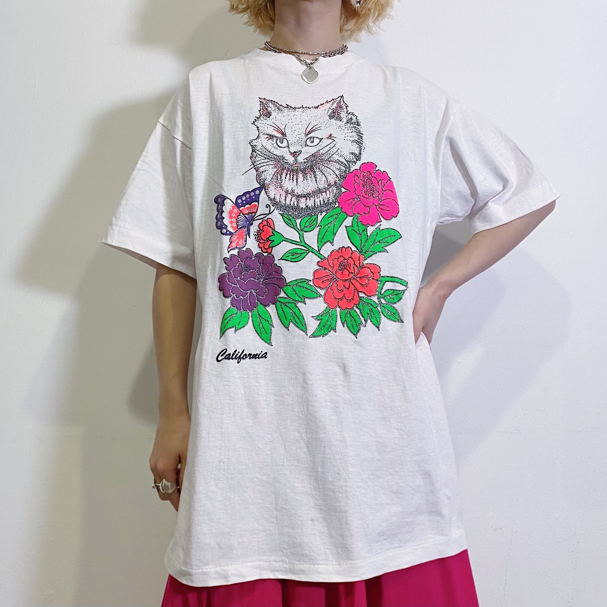 ネコやお花、蝶々のプリントが可愛い、80年代のTシャツです。