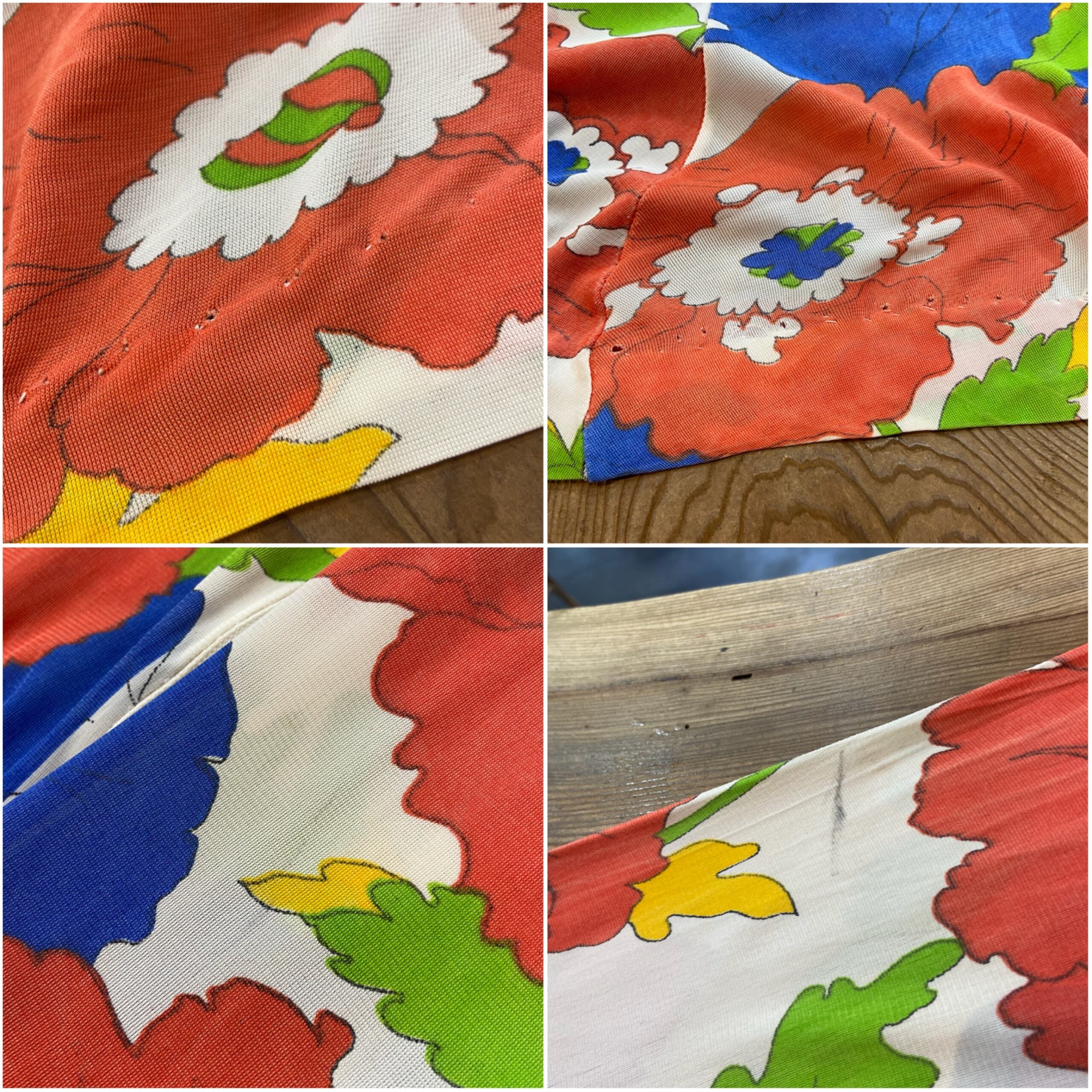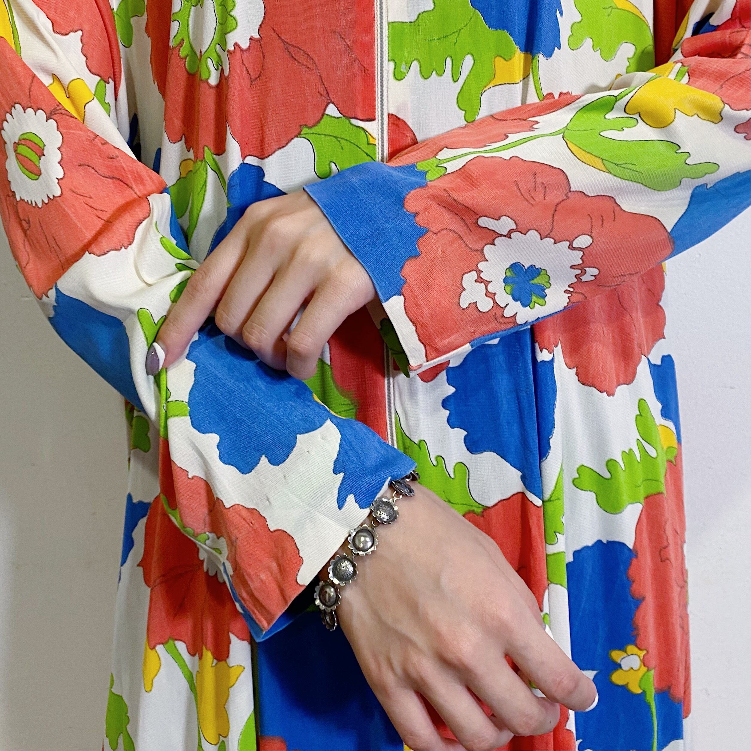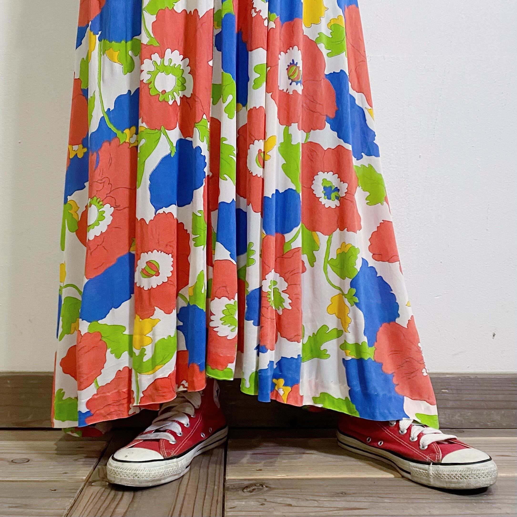 白ベースに赤や青のカラフルな花柄が可愛い、70年代のワンピースです。