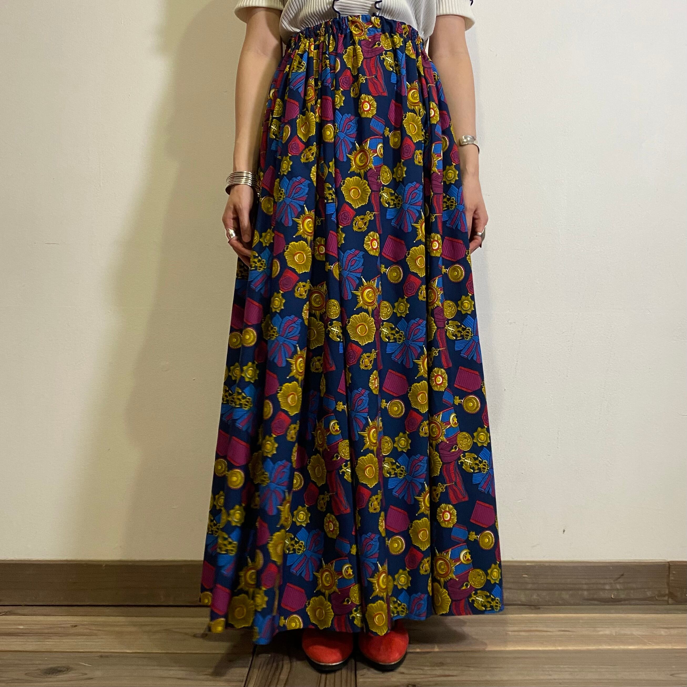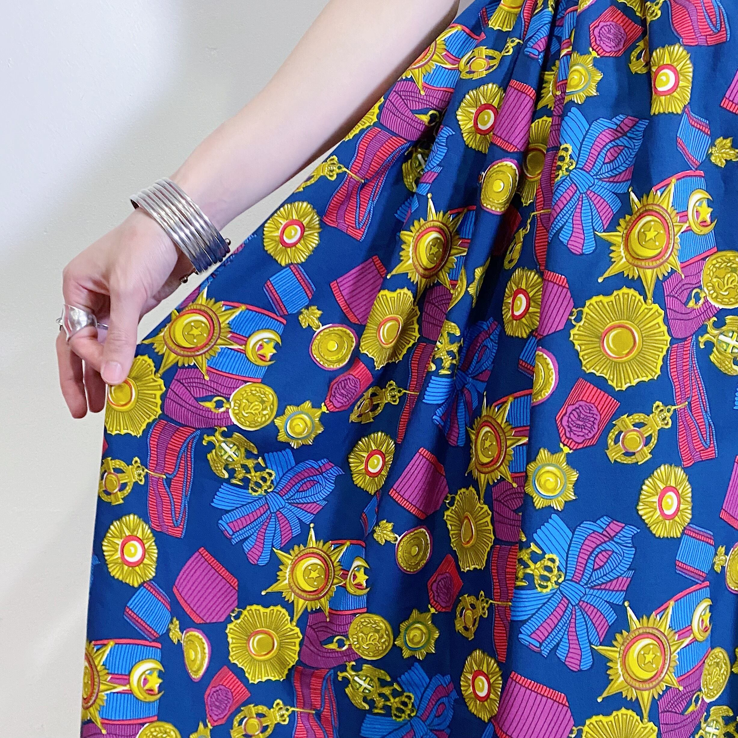 いろんな勲章のプリントがユニークで可愛い、80年代のスカートです。