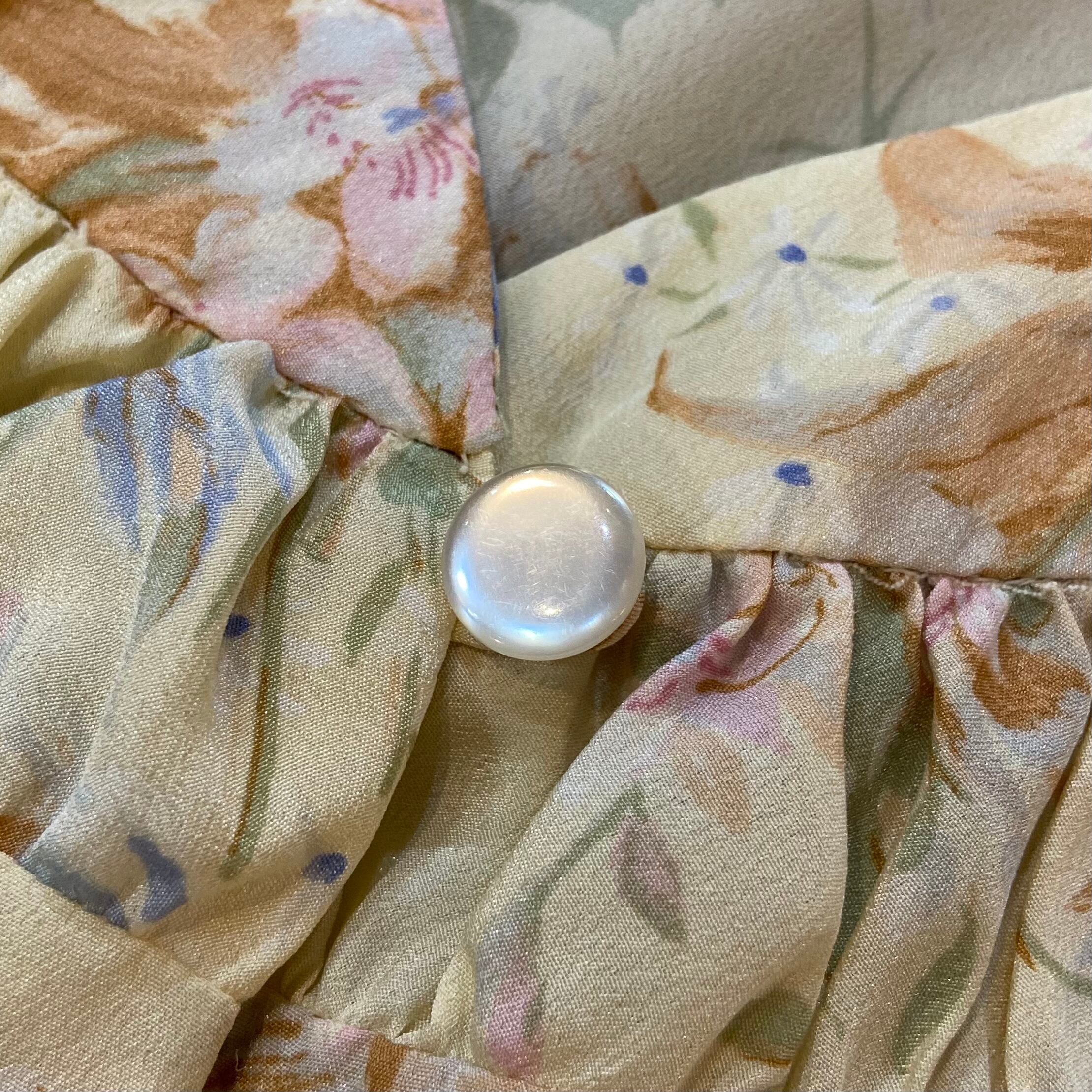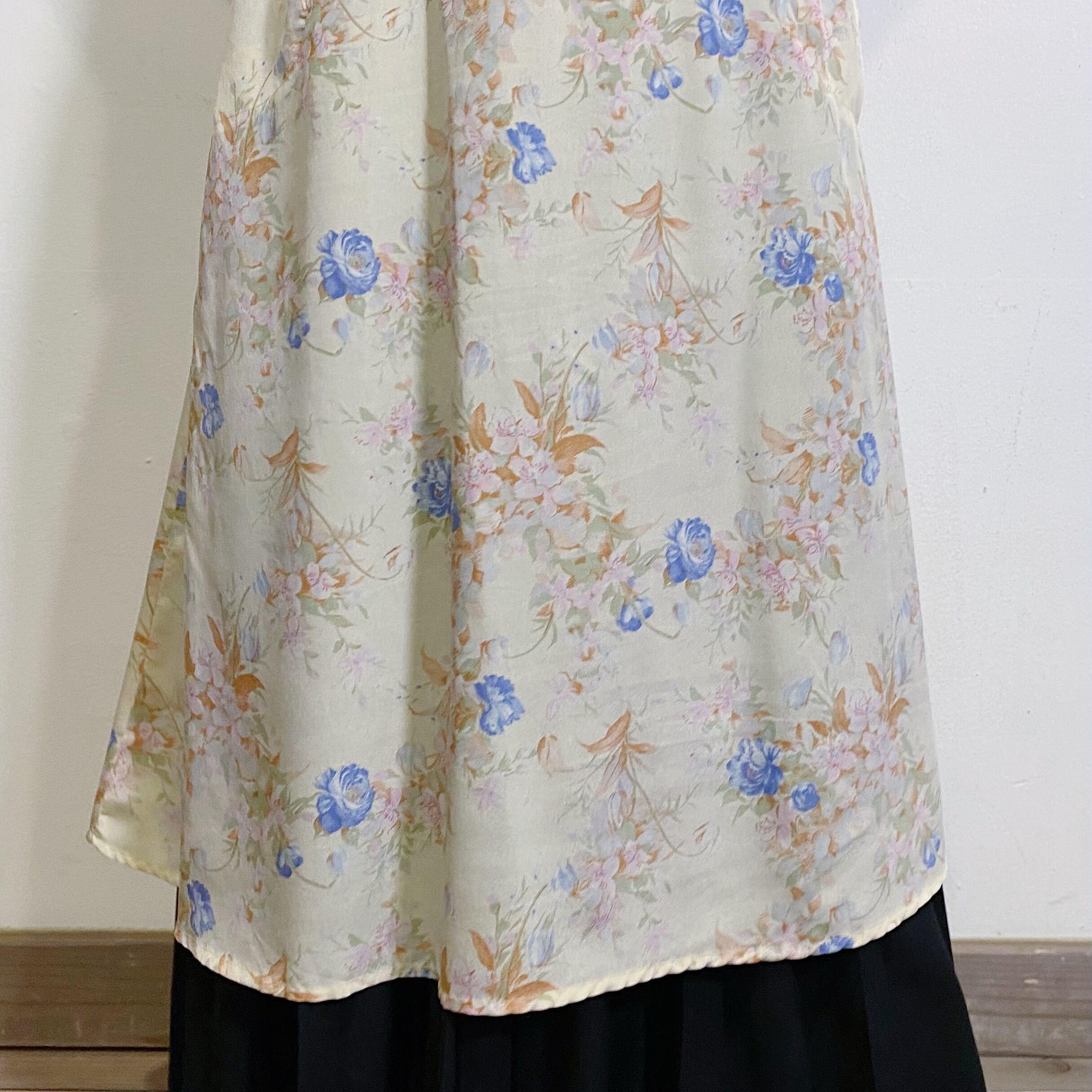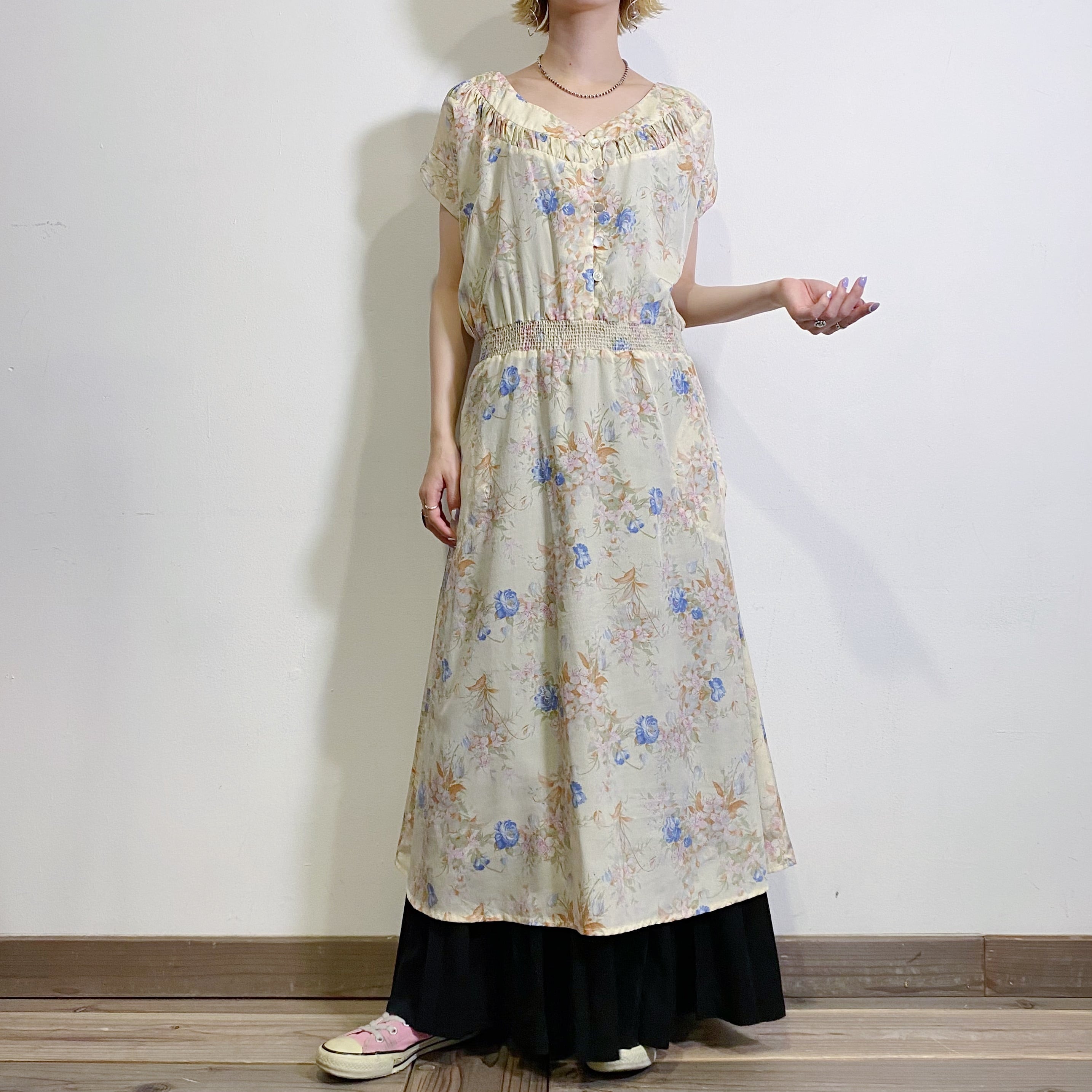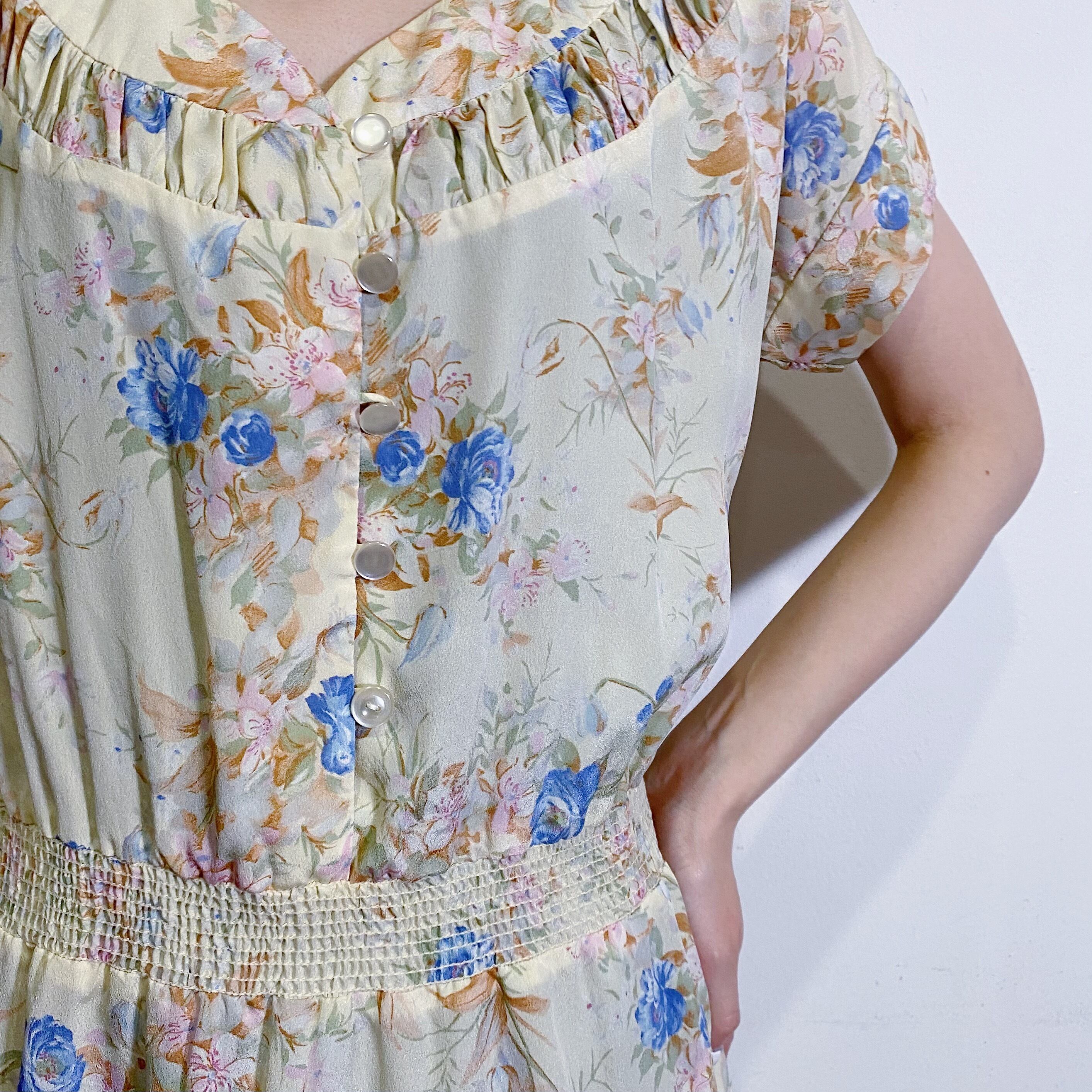クリームイエローのような柔らかな色味に、ブルーやピンクのお花が可愛い70年代のワンピースです。