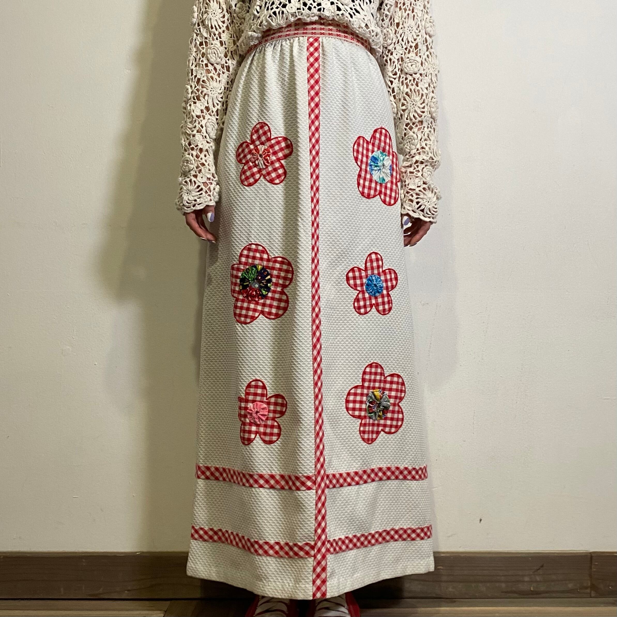 ギンガムチェックのお花のアップリケに、いろんな柄のヨーヨーキルトがとびきりキュートな70年代のロングスカートです。
