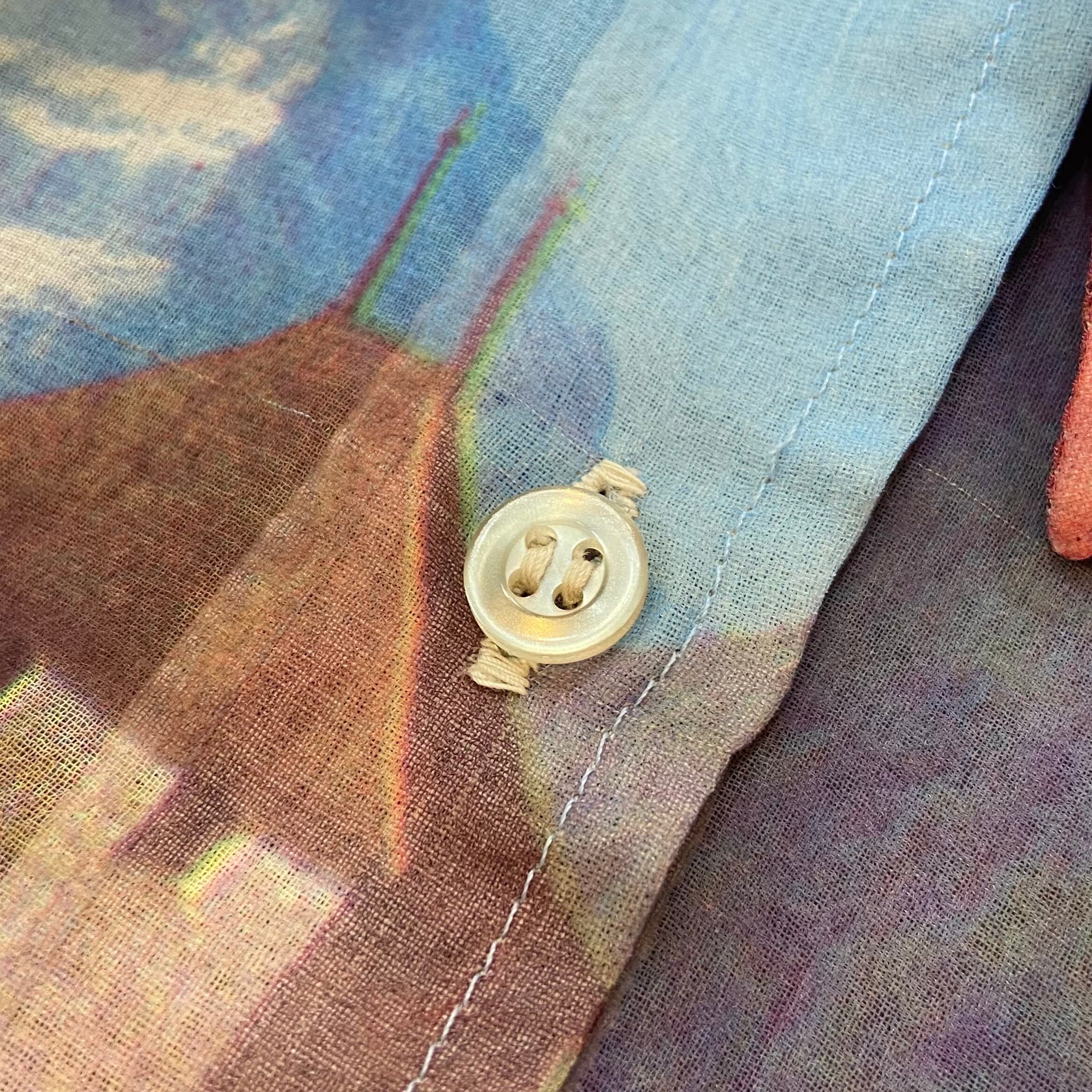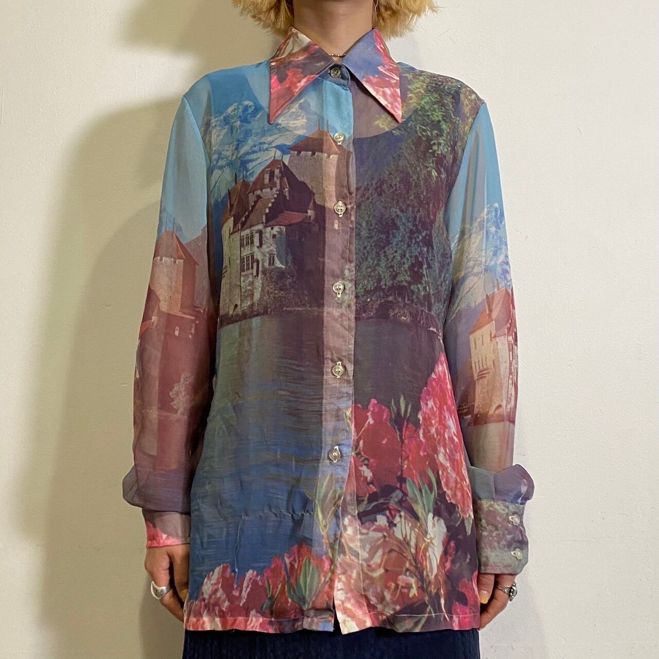 風景写真が転写されたユニークなデザインが可愛い、長袖シャツです。
