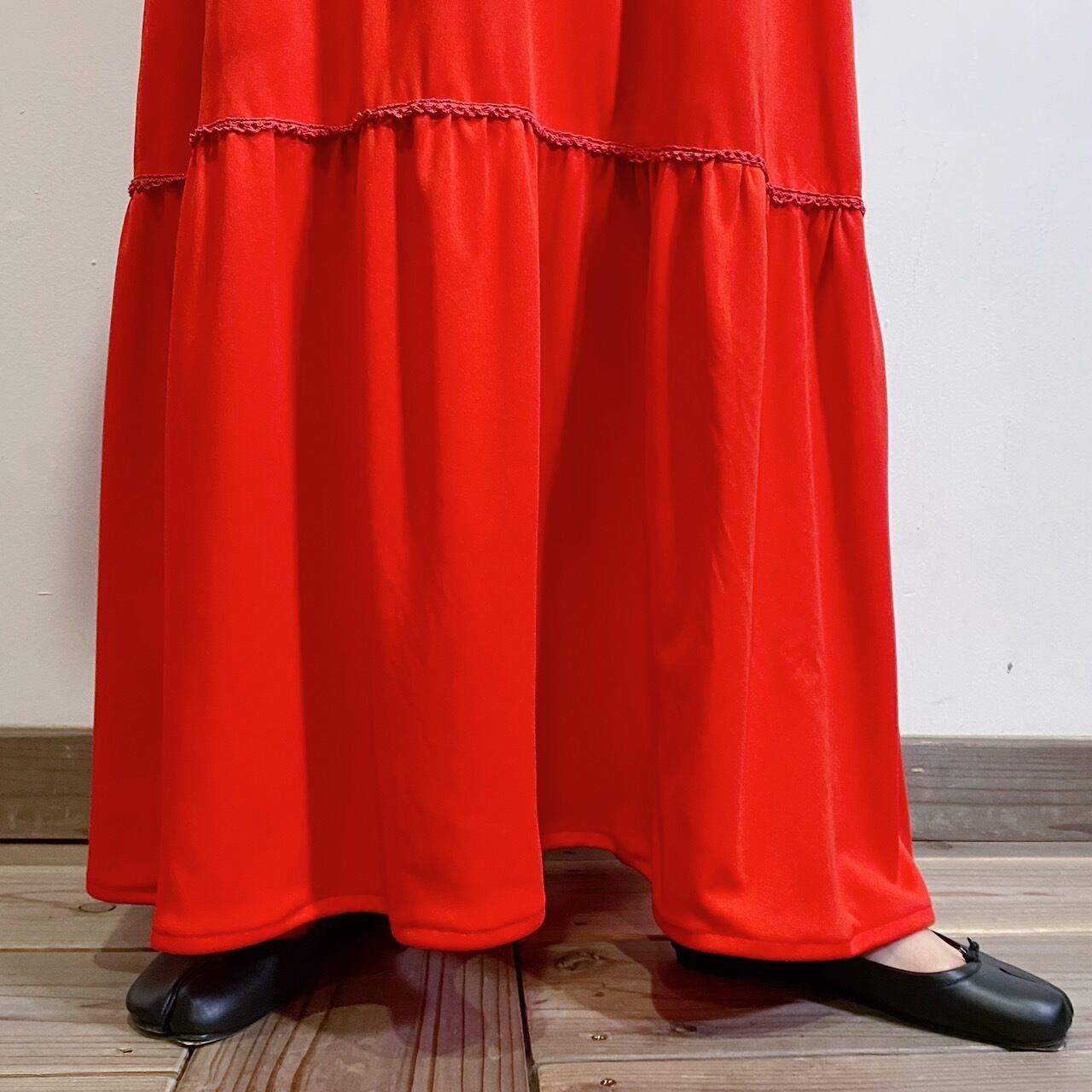 ぱっきりレッドカラーのティアードが可愛い、70年代のキャミワンピースです。