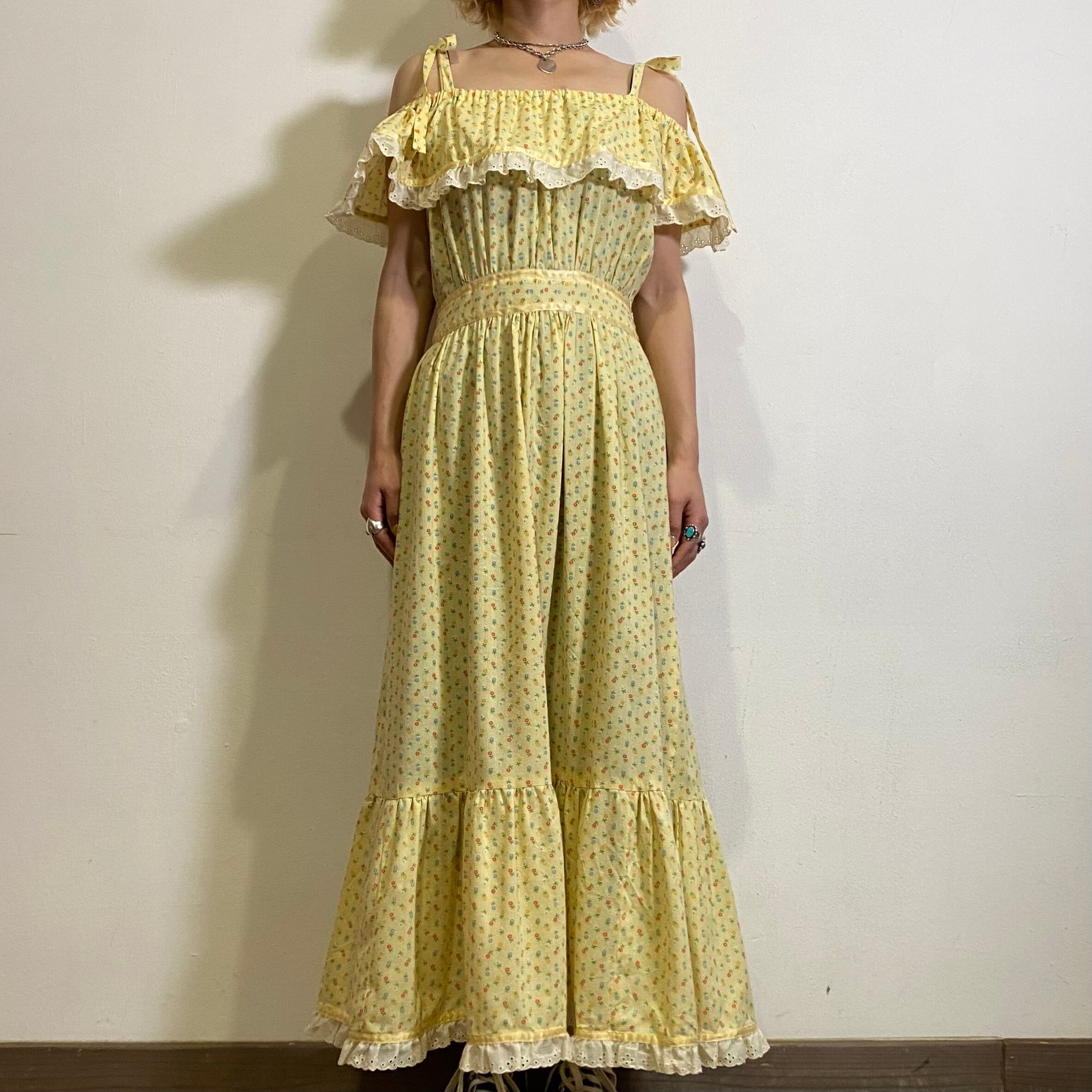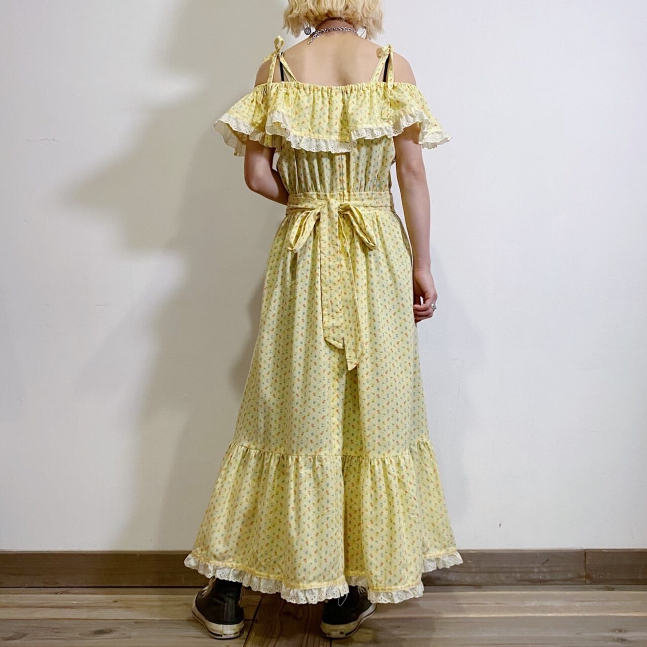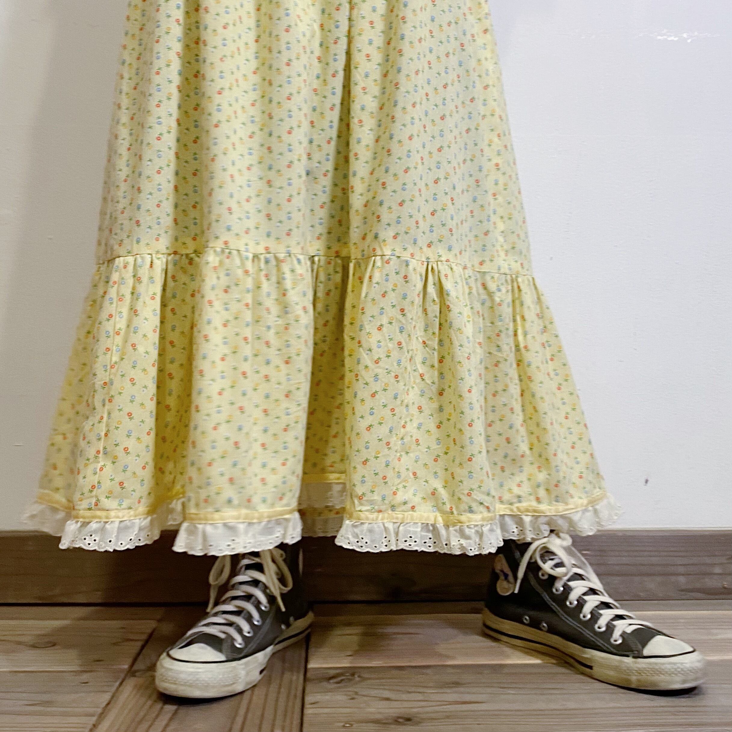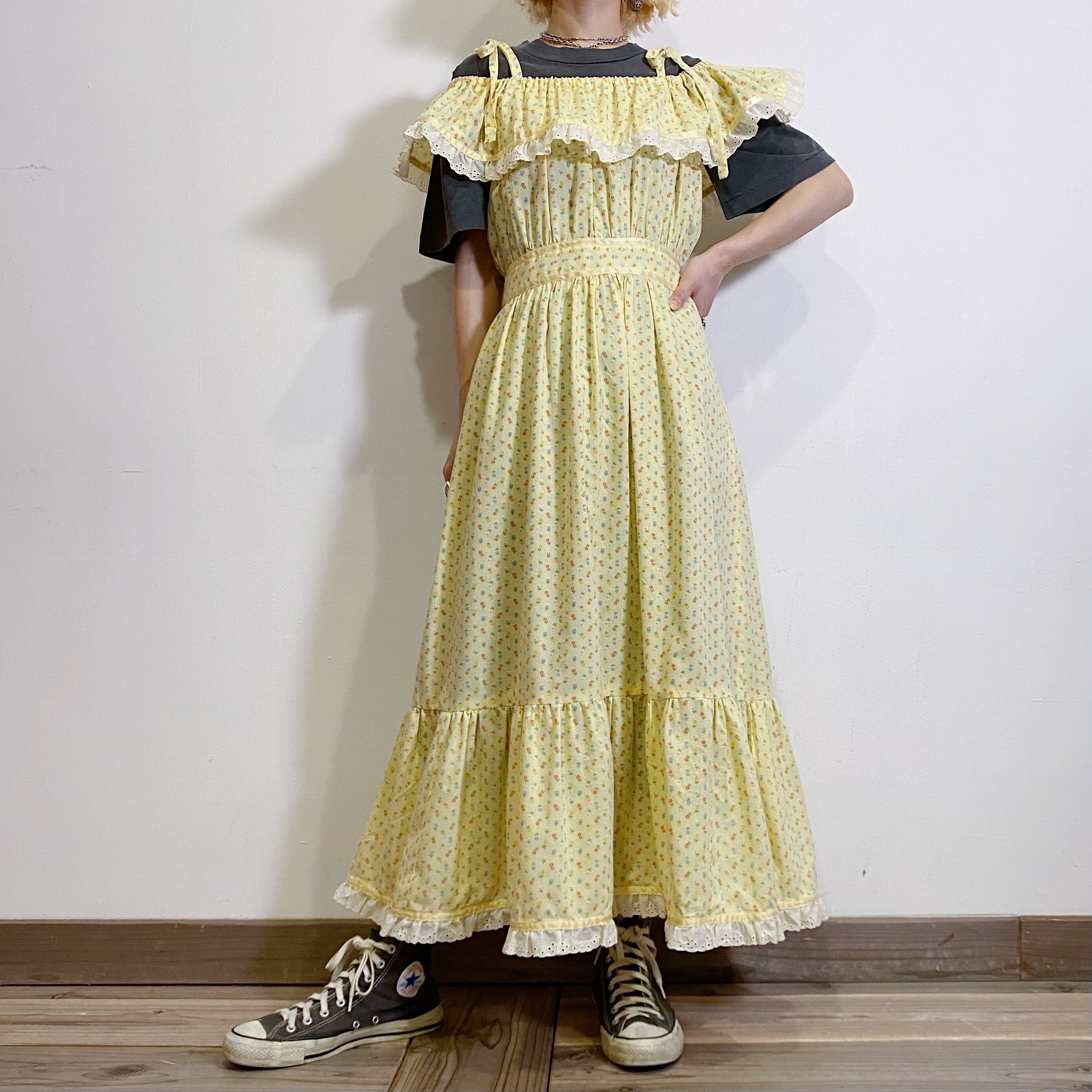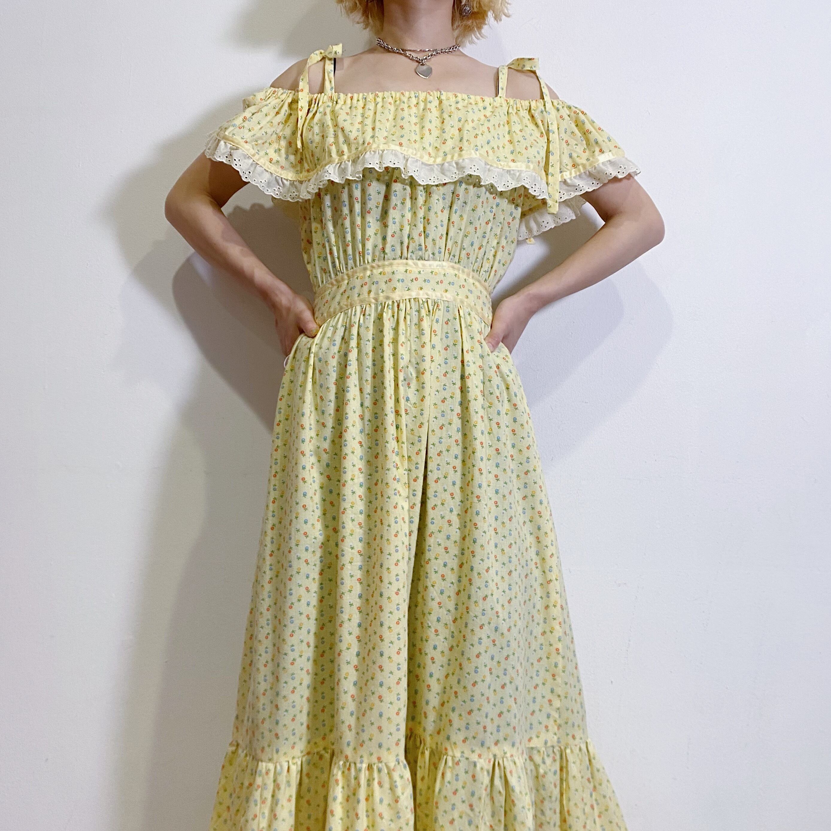 淡いイエローカラーに小花柄が可愛い、70年代のキャミワンピースです。
