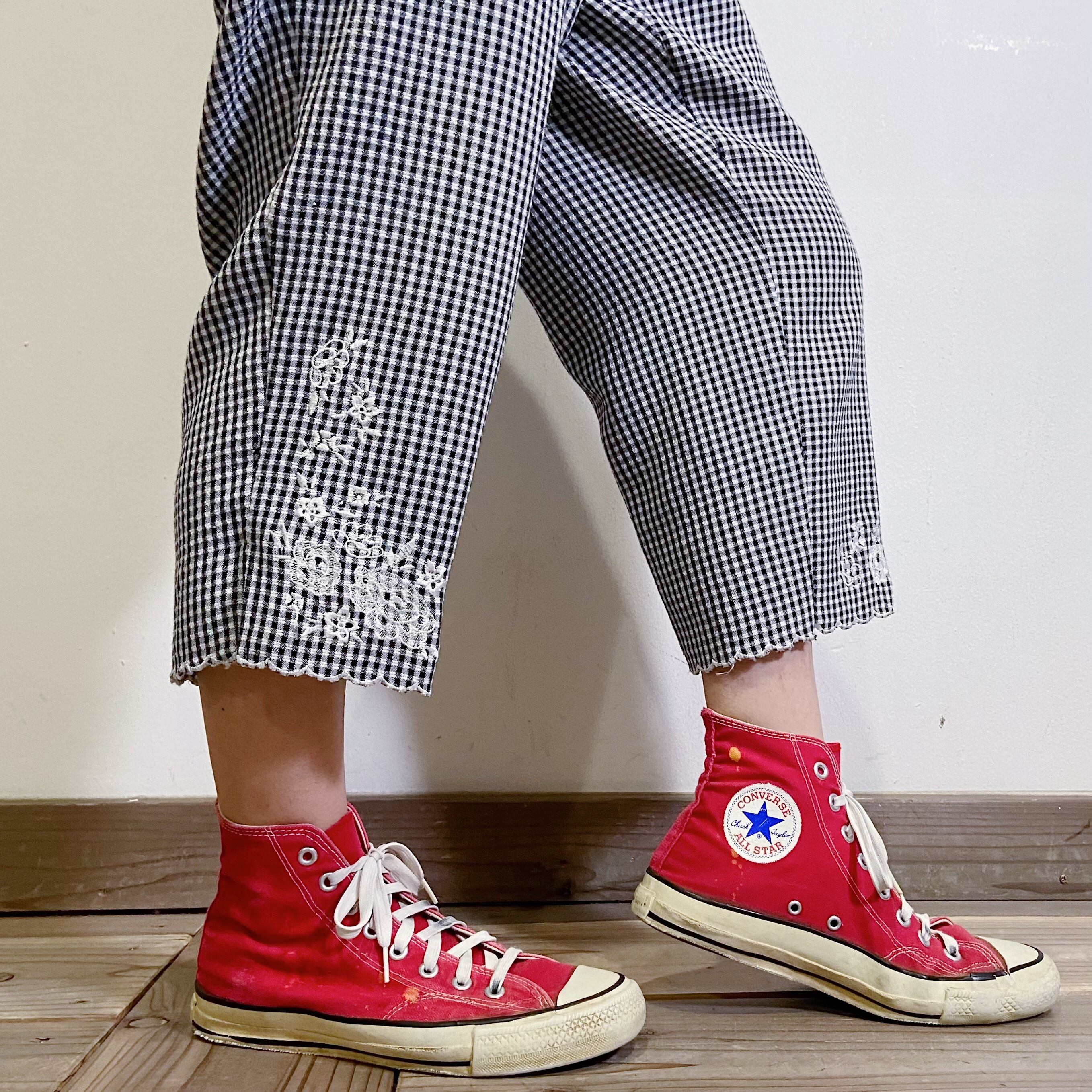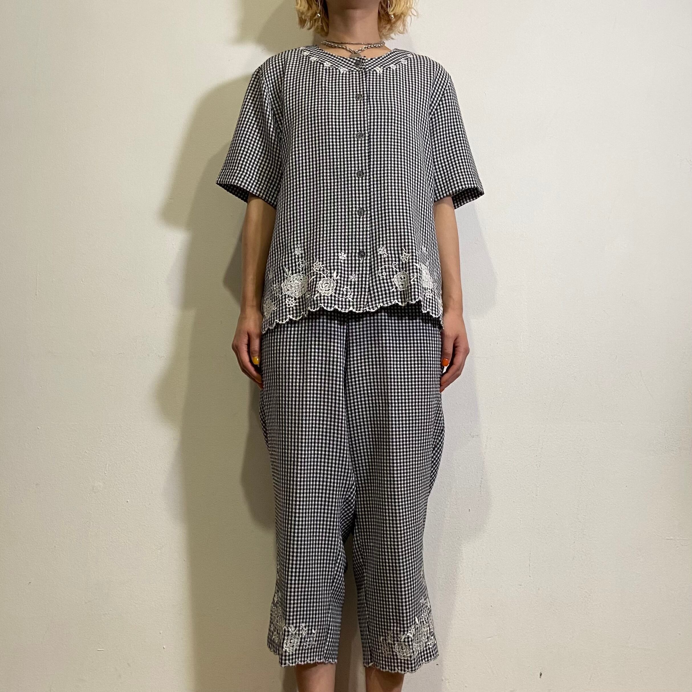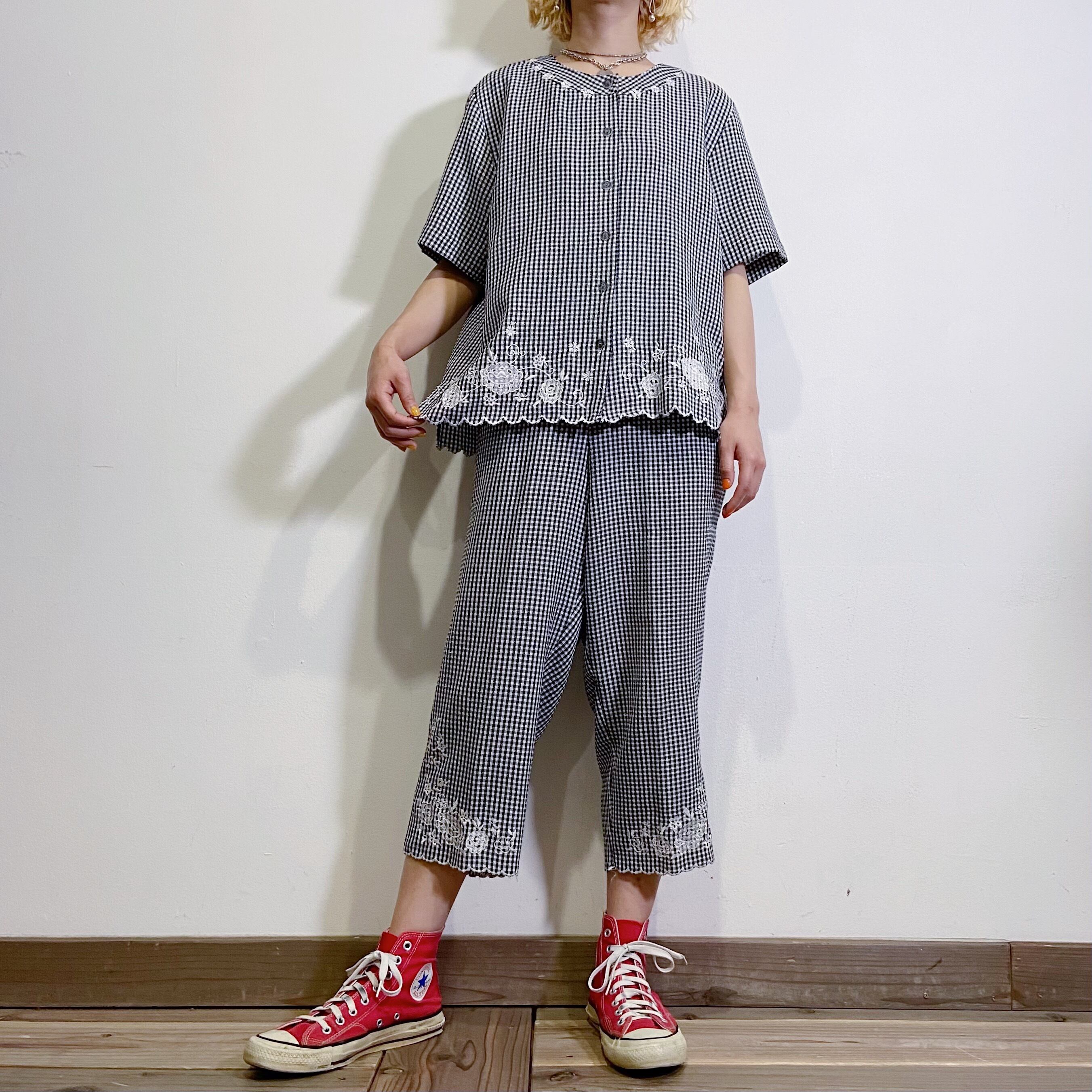 ギンガムチェックにお花の刺繍がとってもキュートな、セットアップです。