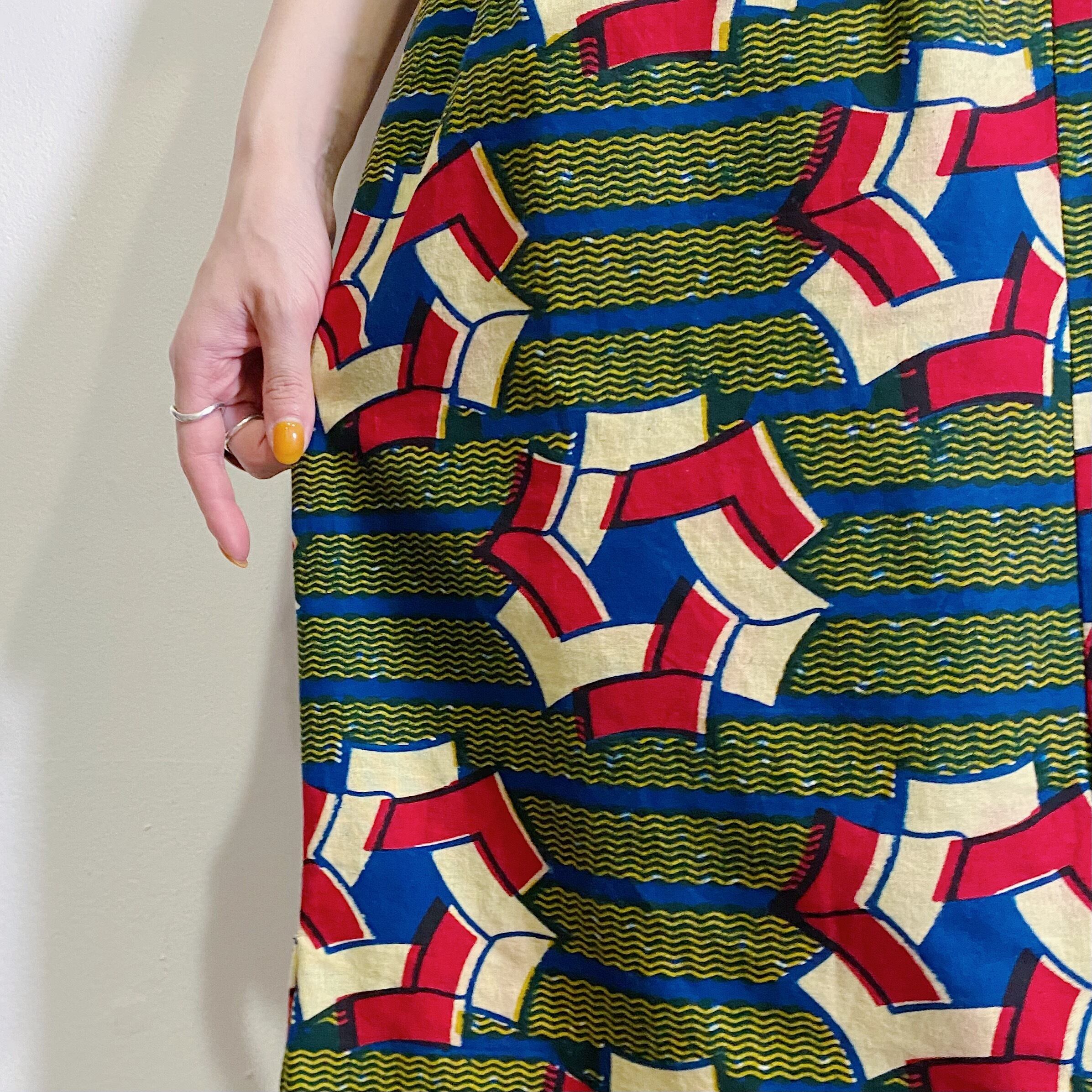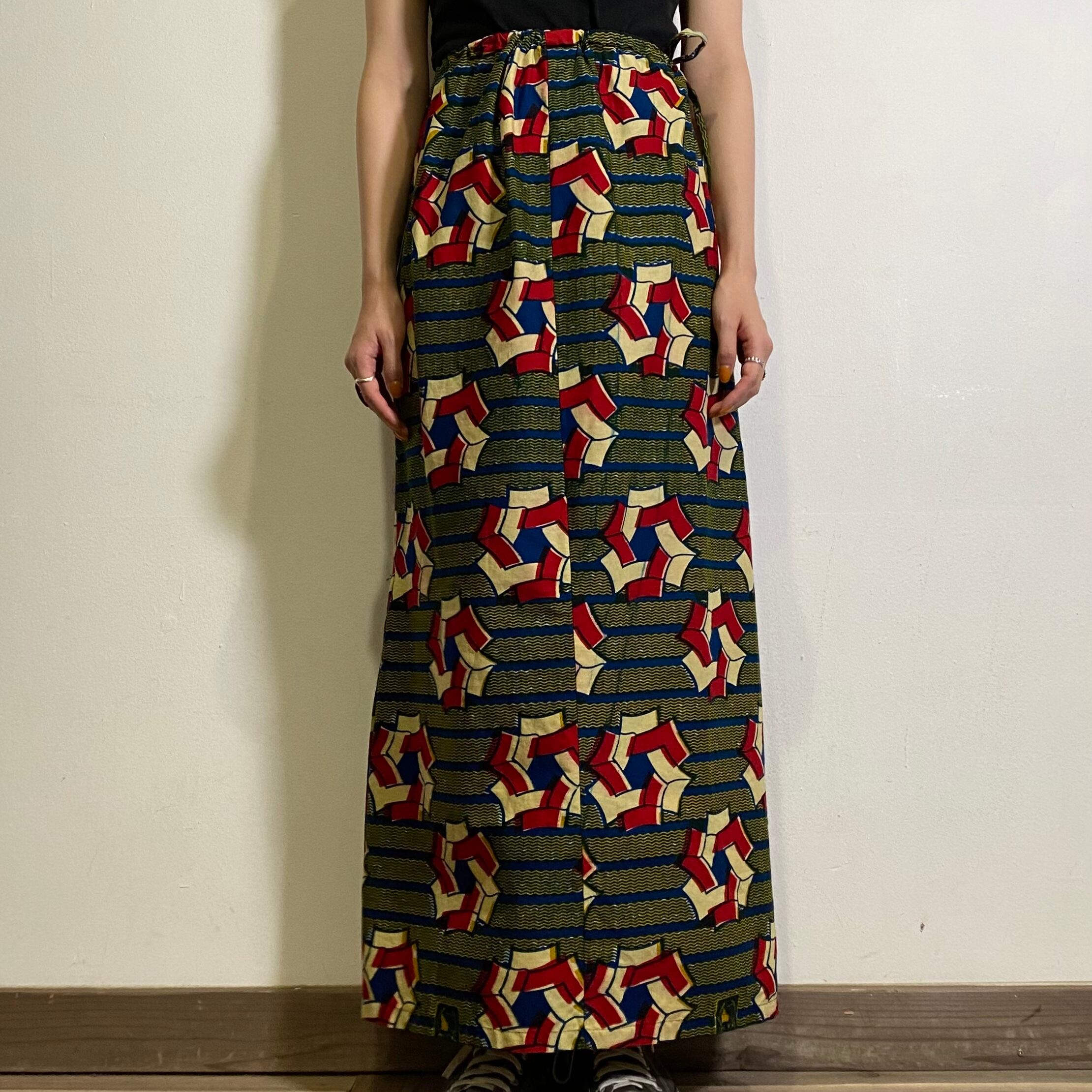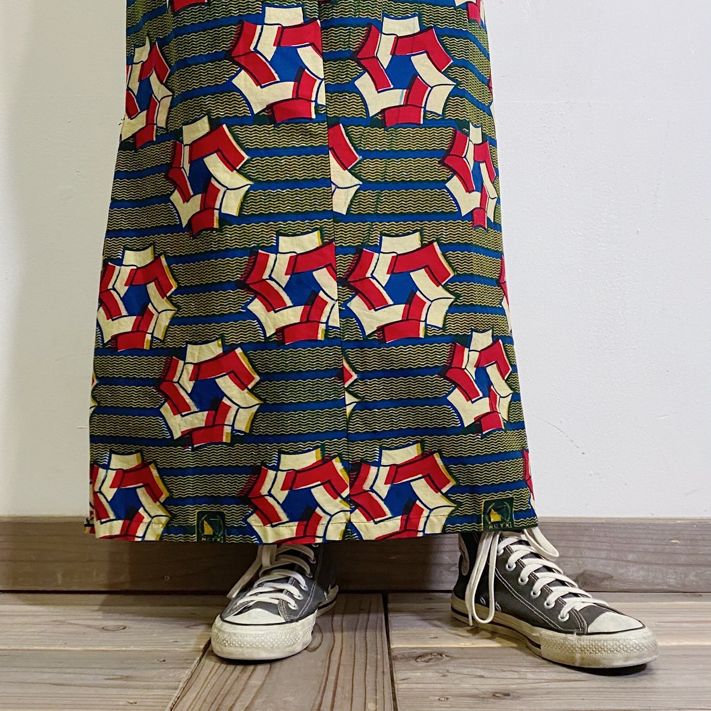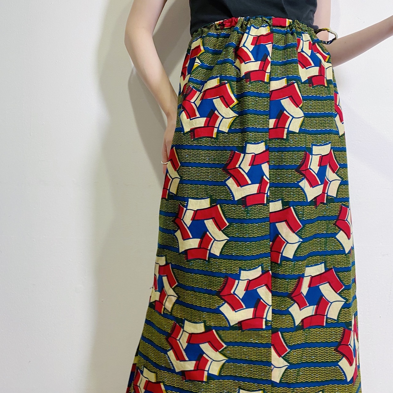不思議な幾何学模様が可愛い、アクリカンバティックのロングスカートです。