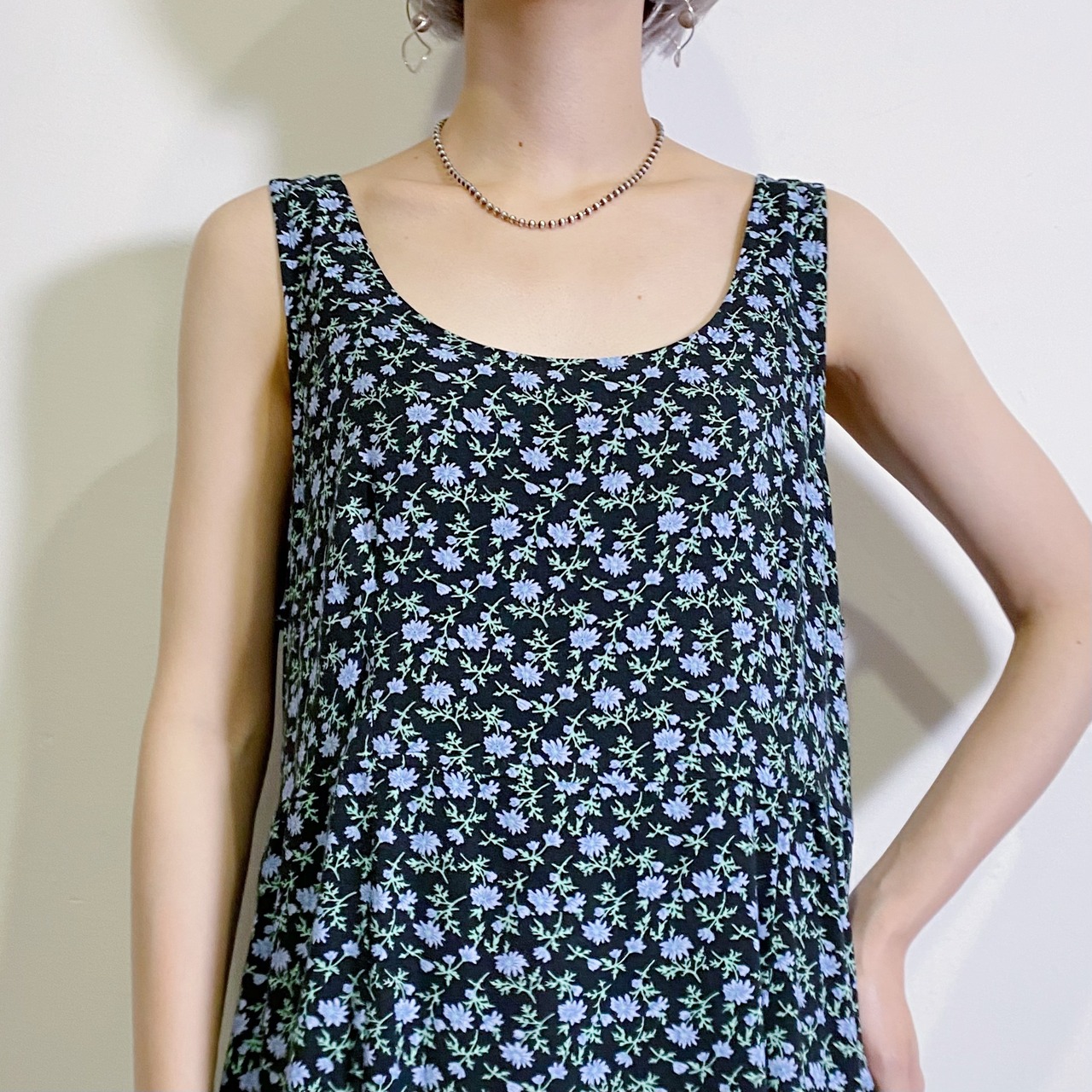 黒地にブルーの小花柄が可愛い、ノースリーブワンピースです。
