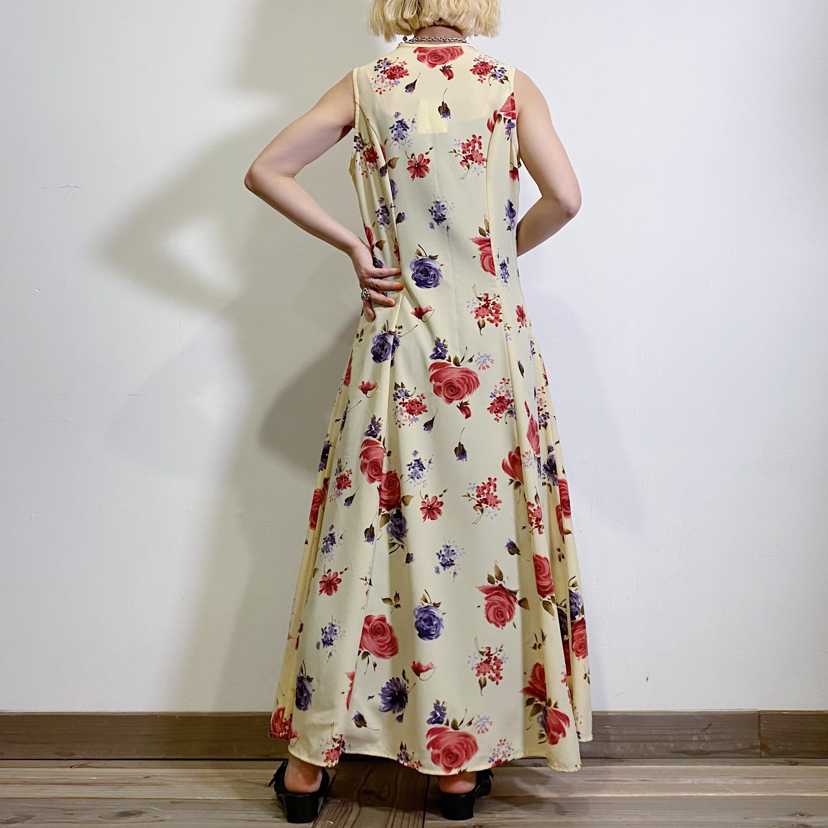 赤や紫の花柄が可愛い、80~90年代のノースリーブワンピースです。